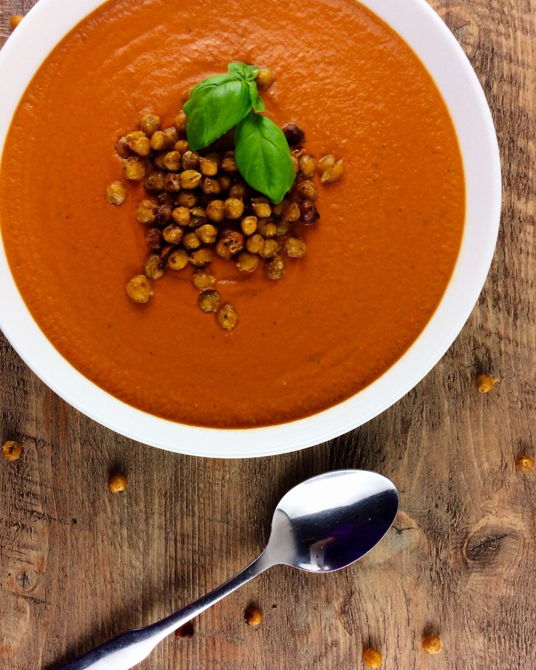 - Die Suppe in tiefe Teller gießen und mit den Kichererbsen-Croutons toppen. Optional mit einigen Spritzern Sojasahne, etwas Olivenöl, schwarzem Pfeffer und frischen Basilikumblättern dekorieren.