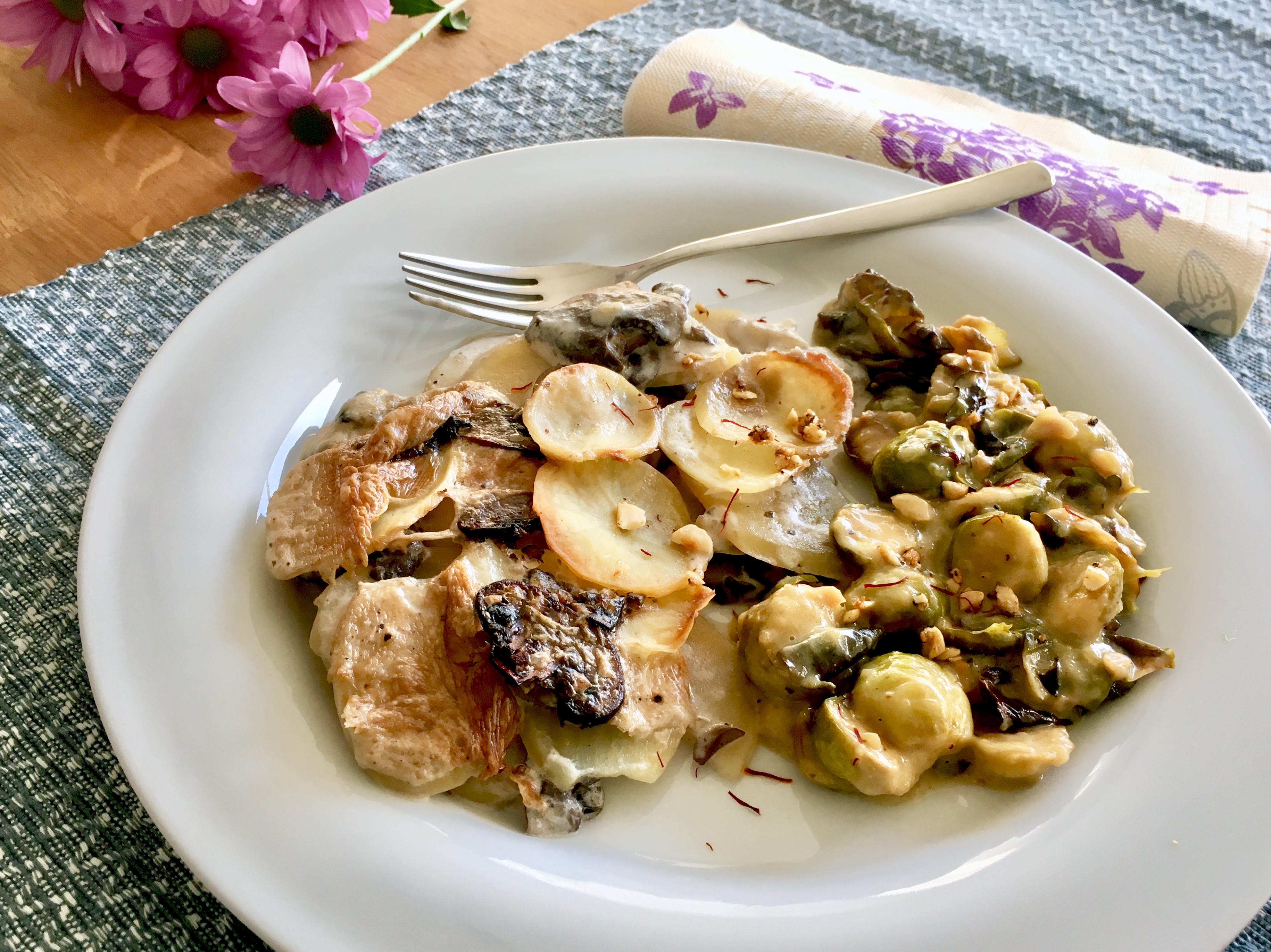 Kartoffel & Pilz-Gratin mit Rosenkohl in Safransauce