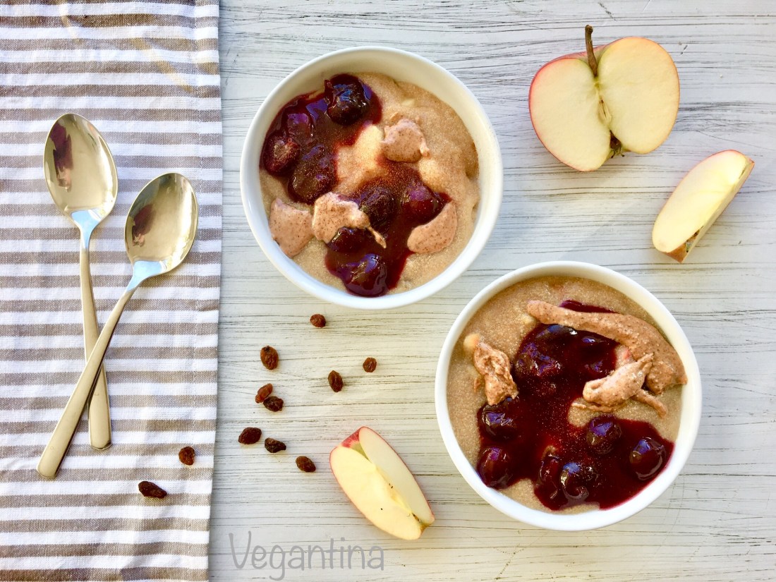 Warmer Amaranth-Frühstücksbrei mit Apfel, Banane, Rosinen und Zimt, dazu Kirschkompott und Mandelmus.