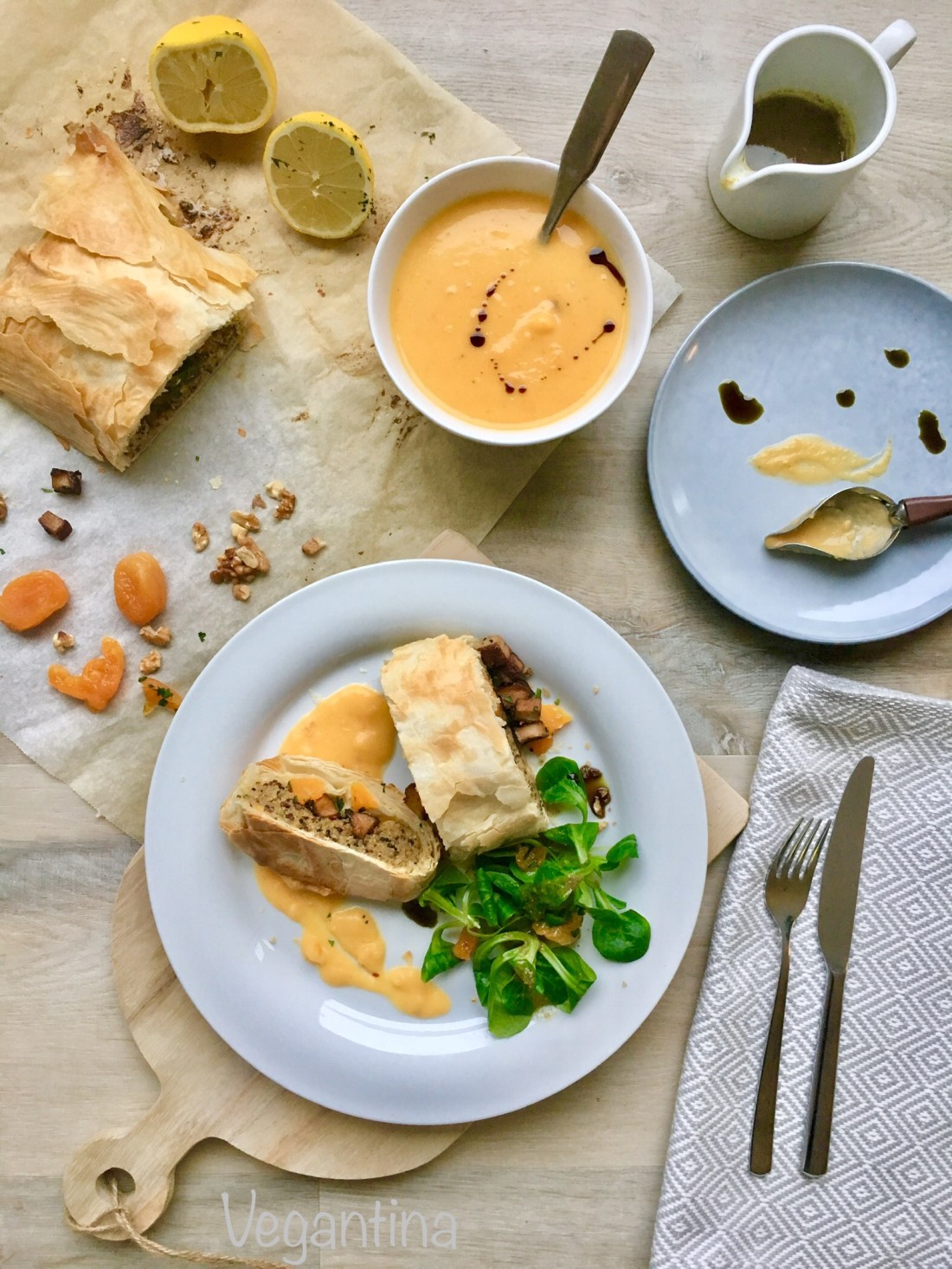 Man nehme eine gewöhnliche Beilage, umhülle sie mit Strudel- oder Blätterteig, und sofort wird etwas Besonderes daraus. Das Rezept für den leckeren Strudel habe ich vor ein paar Jahren auf Stina Spiegelbergs Blog Veganpassion entdeckt und seitdem schon einige Male gemacht. Ich habe es mit kleinen Änderungen übernommen und mit Butternut-Sauce und einem fruchtig-nussigen Feldsalat mit Aprikosen und Walnüssen kombiniert. Die Kombination passt geschmacklich prima zusammen und ist auch sehr praktisch, da für den Strudel nur ungefähr ein halber Butternut-Kürbis benötigt wird. Der übrige Kürbis wird mit Sahne und Wasser zu einer feinen Sauce püriert. Das Gericht sieht nicht nur optisch bunt aus, auch geschmacklich vereint es vieles, was ich mag: deftig, nussig, fruchtig und knusprig. Toll für trübe Tage, wenn Du es Dir drinnen gemütlich machen möchtest.