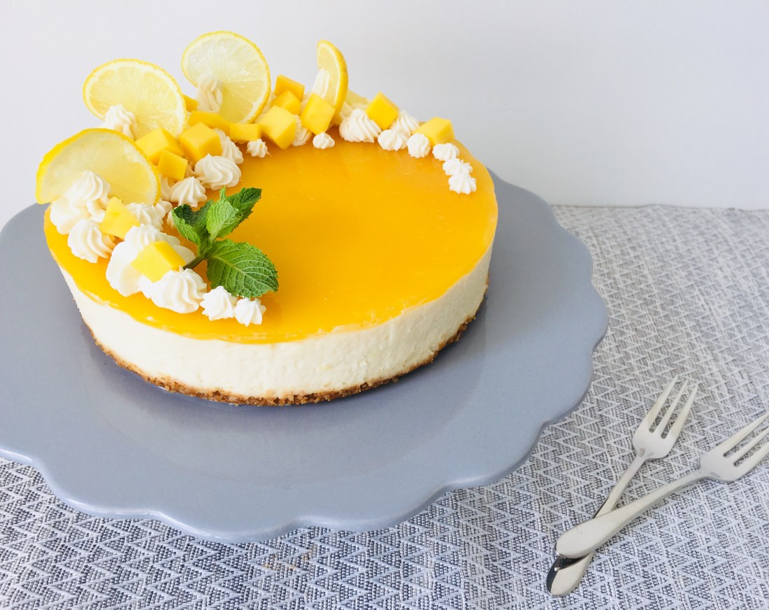 Dieser himmlisch-cremige Käsekuchen ist das ideale Sommer-Dessert: eine fruchtige Zitrone-Mango-Käseschicht trifft auf Kekskrümelboden und Mango-Spiegel.