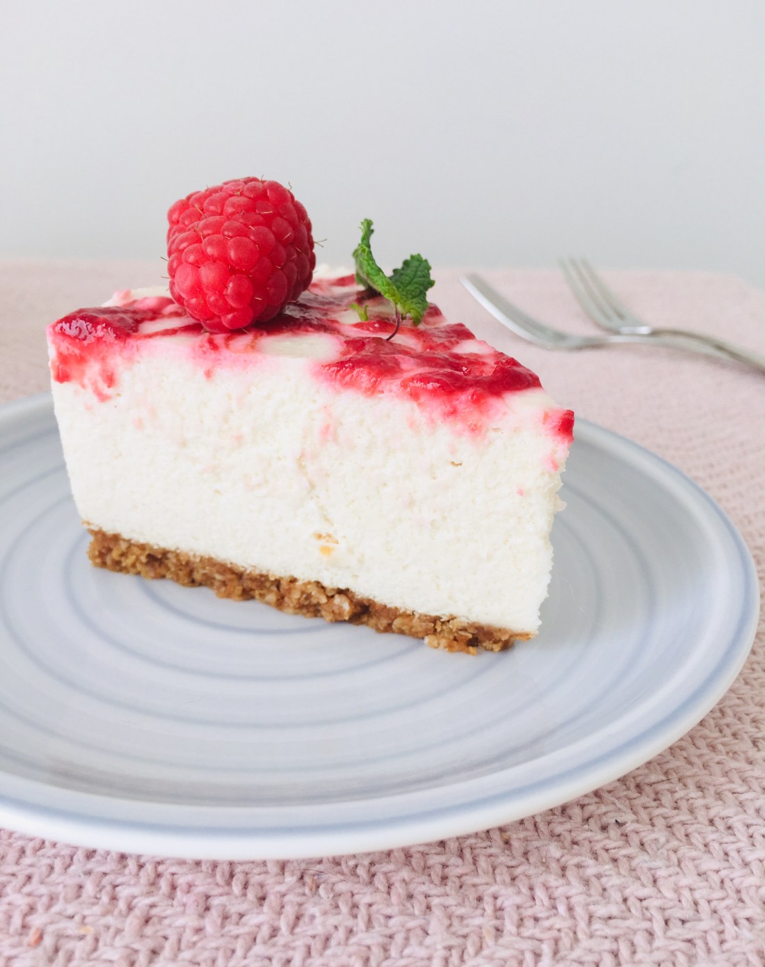 Der Geschmack der weißen Schokolade ist sehr dezent und wird durch die Frische von Zitronensaft ergänzt. Die Käsemasse ist damit eine tolle Basis für alle möglichen Abwandlungen, was die Garnierung betrifft. Ich finde einen fruchtigen Swirl immer besonders hübsch anzuschauen und habe mich bei dieser Version für Himbeeren entschieden (auch Blaubeeren würden prima passen).