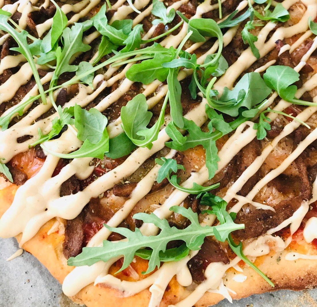 Das vegane Dönerfleisch habe ich fertig im Supermarkt gekauft. Es schmeckt unheimlich lecker und würzig und eignet sich hervorragend zum Stillen dieser Fast Food-Gelüste, die dann und wann die meisten von uns überfallen. Wenn Du kein veganes Dönerfleisch bekommst, kannst Du stattdessen auch einen anderen Fleischersatz verwenden, Hauptsache er ist würzig und spart nicht an Fett (diese Pizza ist definitiv nicht als „Health Food“ gedacht). Der Hefeteig ist super fluffig und wird dank Maismehl-Trick auch im heimischen Ofen schön kross. Für eine schöne Optik habe ich die Pizza nach dem Backen mit frischem Rucola garniert.