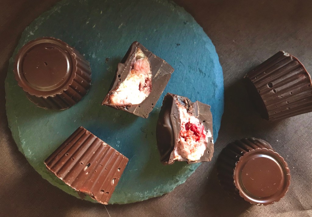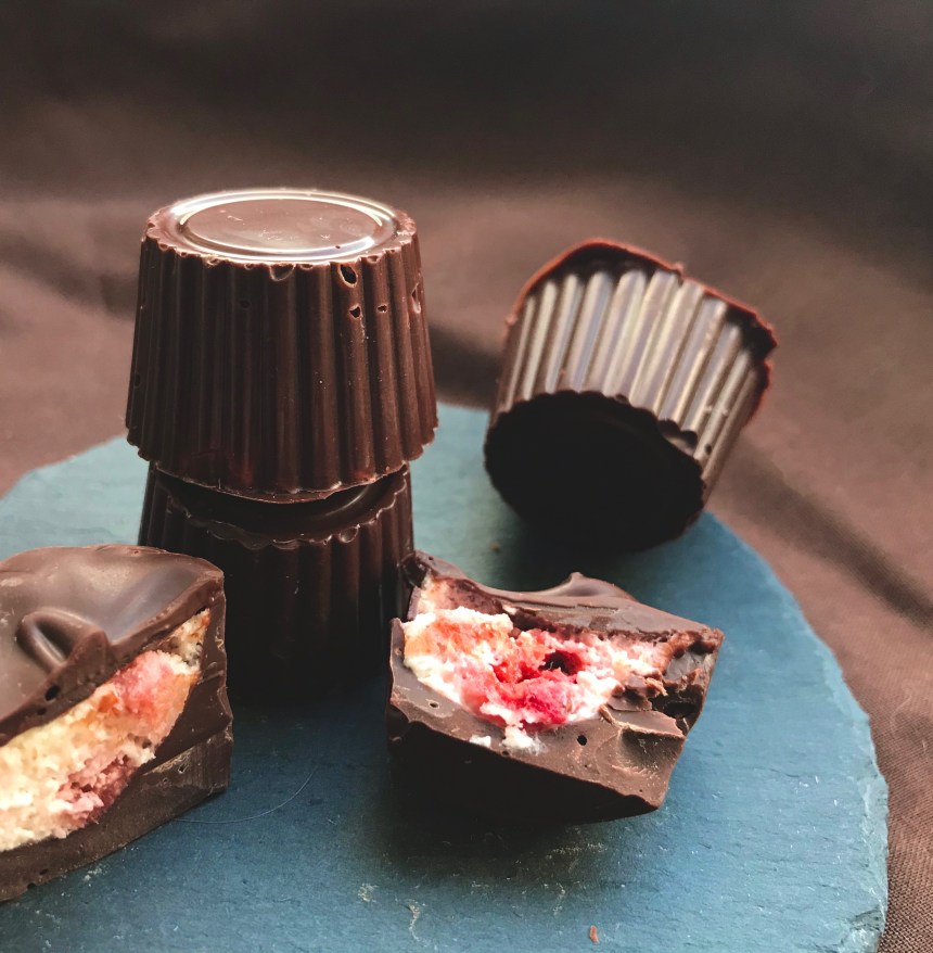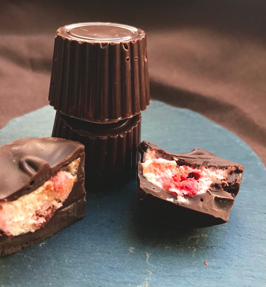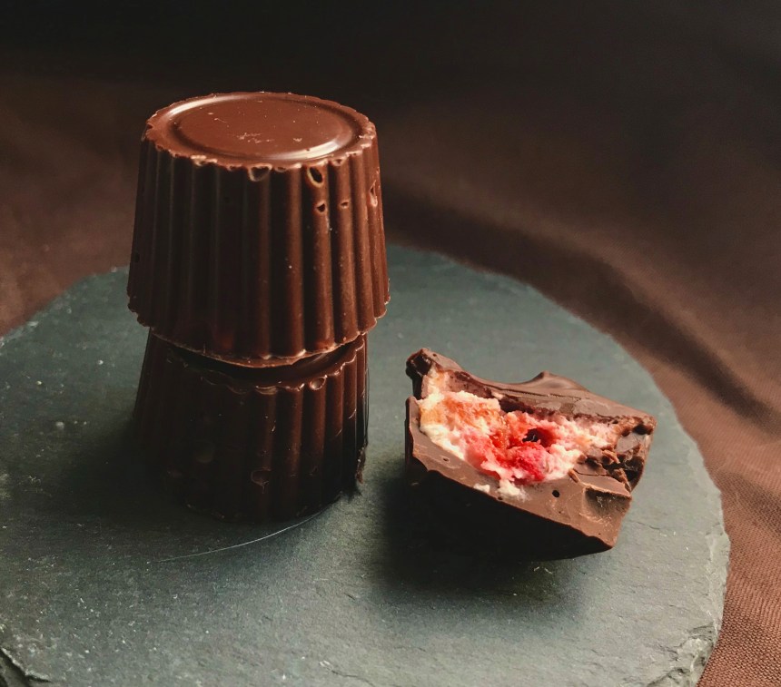 3. Die Mousse mit einer Schicht temperierter Schokolade bedecken (ich habe damit gewartet, bis die Mousse fest war und die Schokolade ein zweites Mal temperiert). Sobald die Schokolade fest ist, können die Pralinen vorsichtig aus den Silikonmulden herausgelöst werden.