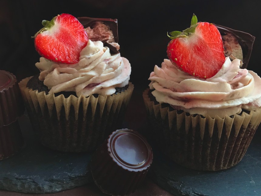 Schokoladige Cupcakes getoppt mit einer leckeren Erdbeer-Joghurt-Mousse und selbstgemachten Yogurette-Mousse-Pralinen.
