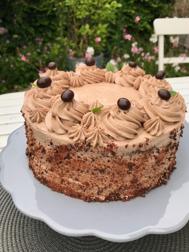 - Die Torte rundherum mit einer weiteren Schicht Buttercreme bedecken und alles erneut glatt streichen. Übrige Buttercreme in einen Spritzbeutel mit Sterntülle füllen und die Torte damit garnieren. Auf Wunsch mit mehr gehackter Mokkaschokolade, schokolierten Kaffeebohnen und einzelnen Blättchen von Minze oder Zitronenmelisse dekorieren.