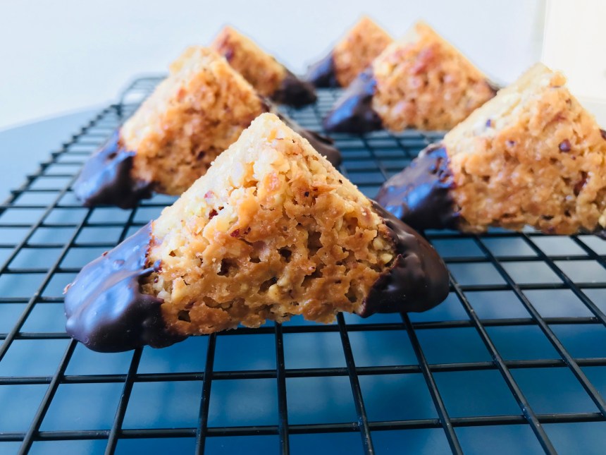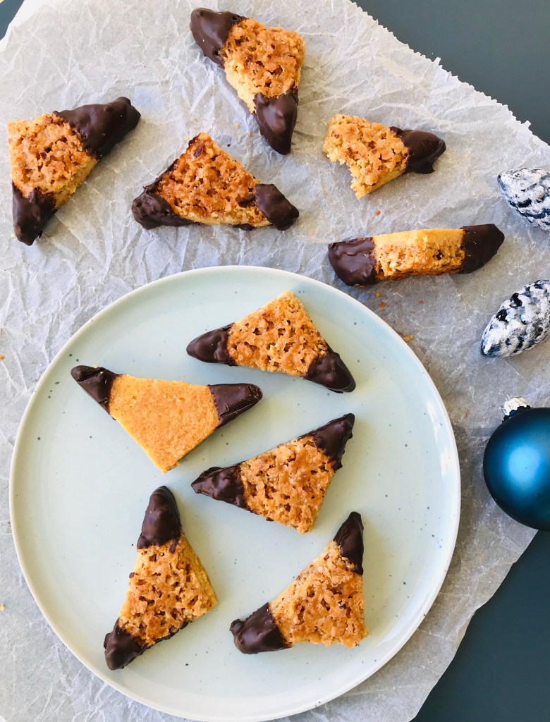- Die beiden äußeren Ecken der Nussecken in die geschmolzene Schokolade tauchen und überschüssige Schokolade an den Seiten abstreifen.