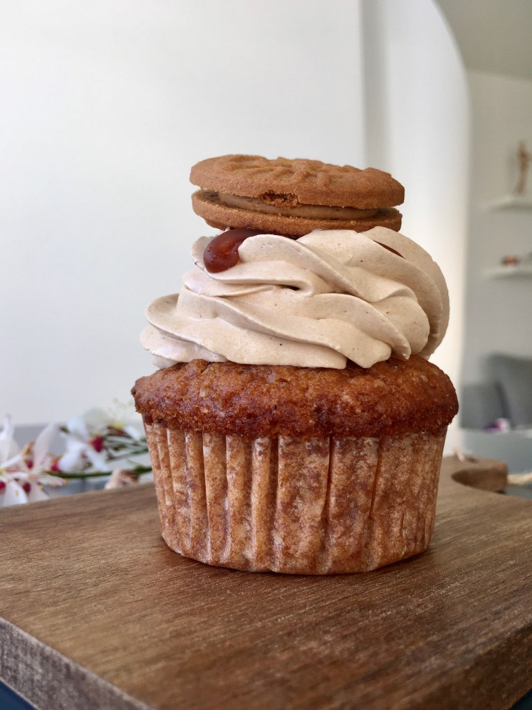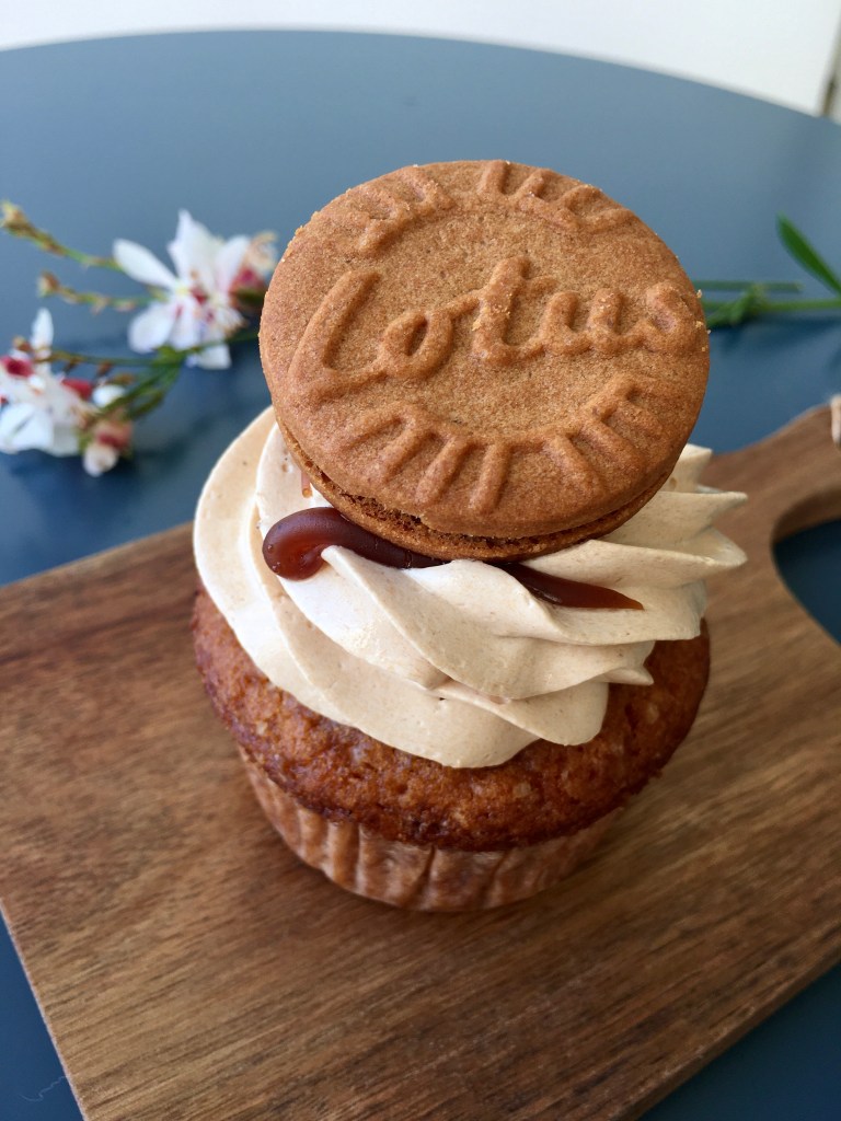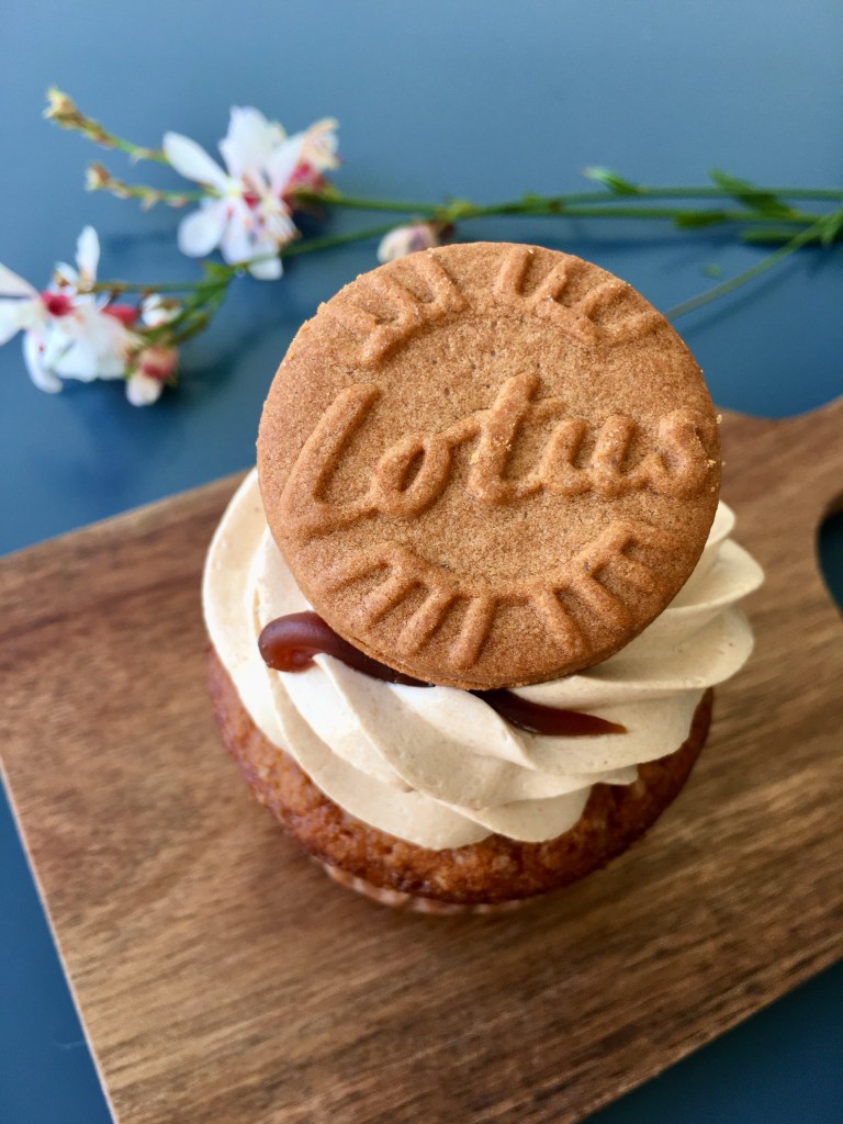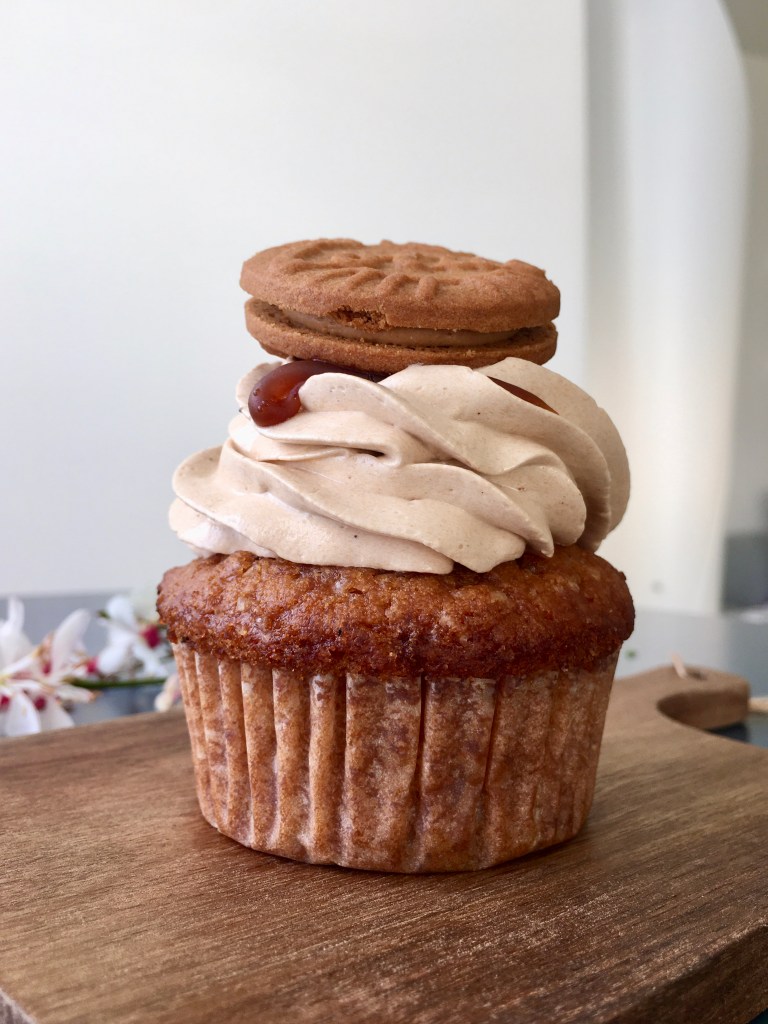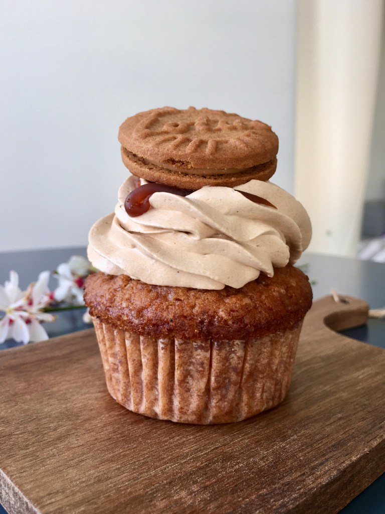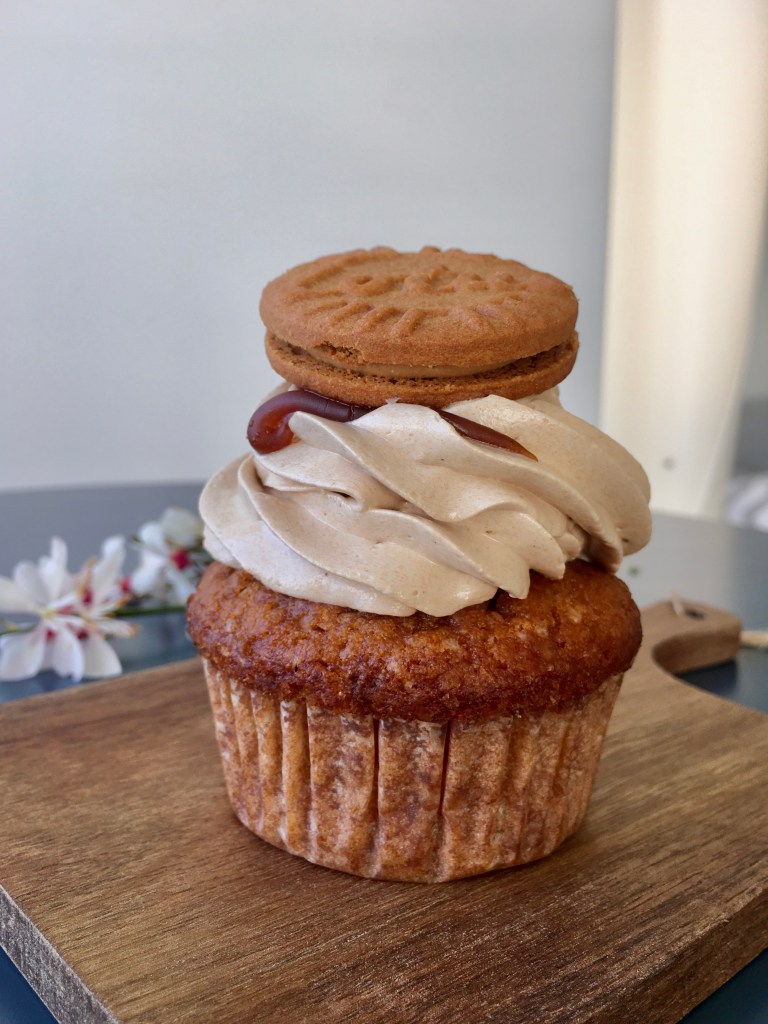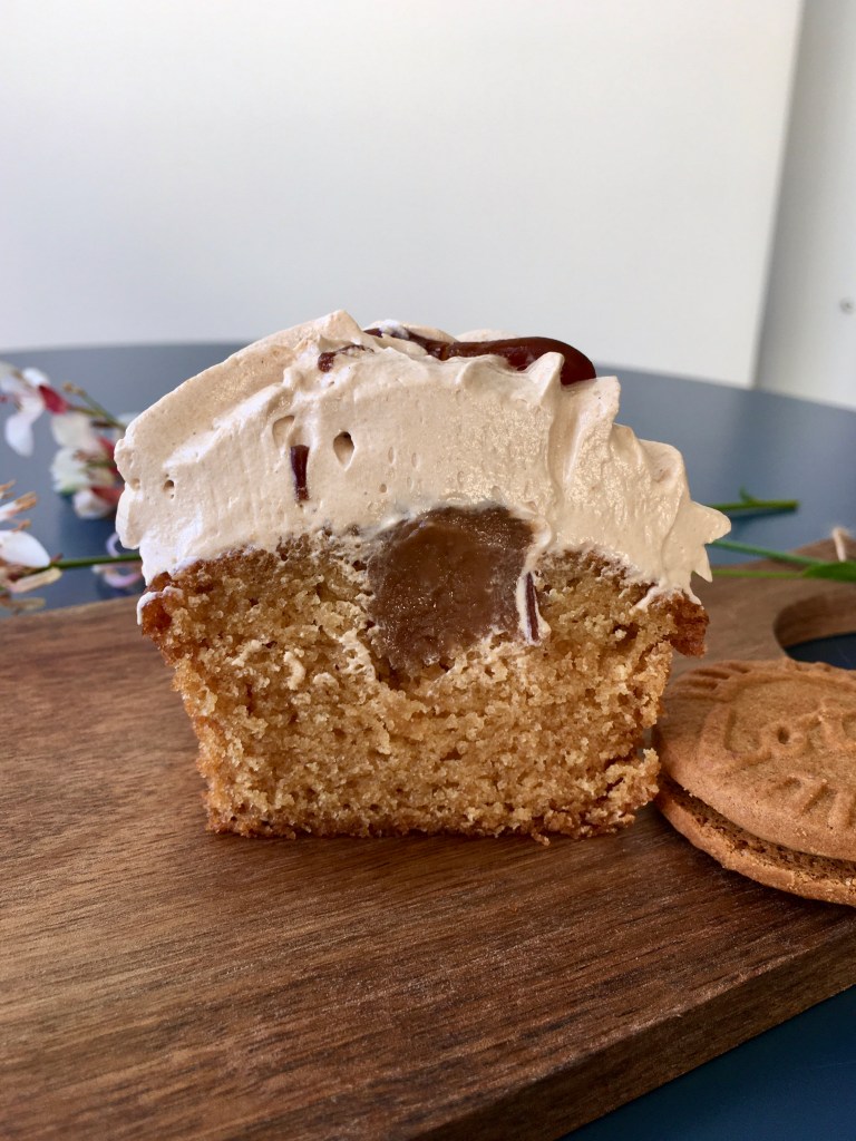 Biscoff-Creme to the max: saftiger Biscoff-Cupcake gefüllt mit einer Biscoff-Creme und getoppt mit fluffiger Swiss Meringue Biscoff-Buttercreme, mehr Biscoff-Creme und einem Biscoff-Keks.