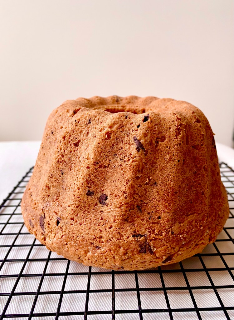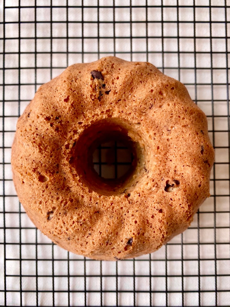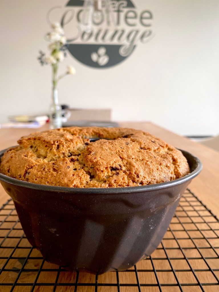 8. Den Kuchen im vorgeheizten Ofen ca. 40 min lang backen, bis an einem in der Mitte hineingesteckten Stäbchen kein feuchter Teig mehr kleben bleibt. Ca. 15 Minuten in der Form abkühlen lassen, dann vorsichtig auf ein Kuchengitter stürzen und komplett abkühlen lassen.