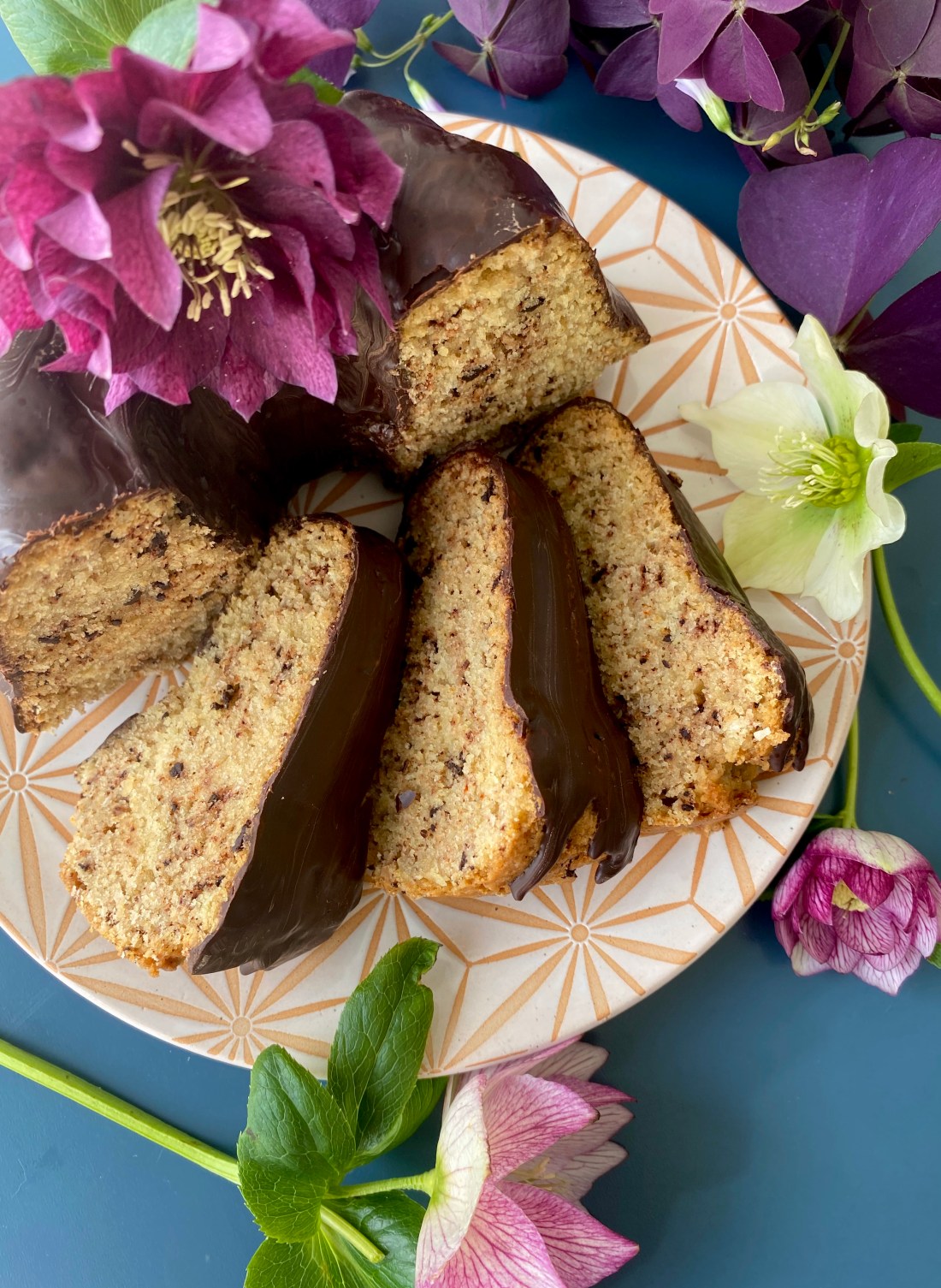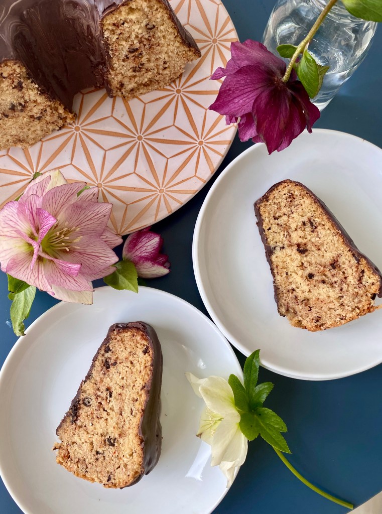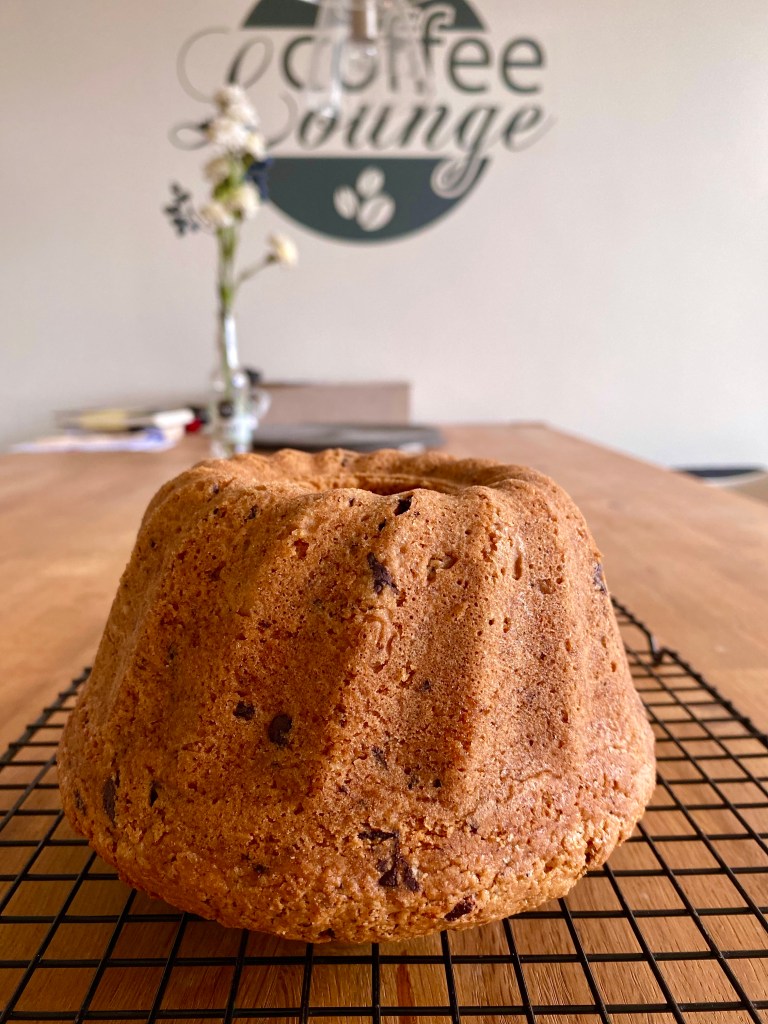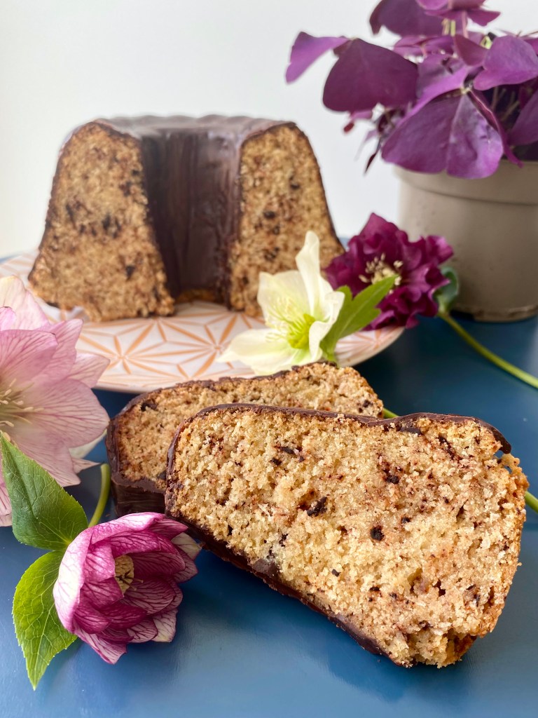 Schneller saftiger Rührkuchen mit feiner Kokos- und Zitronennote, Schokostückchen und einem Guss aus dunkler Schokolade.