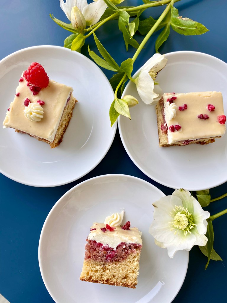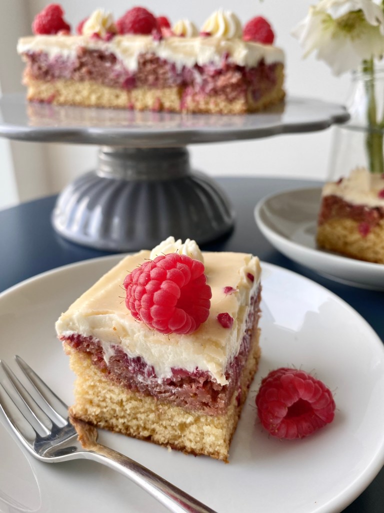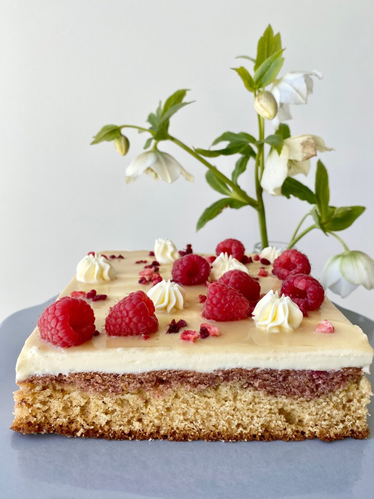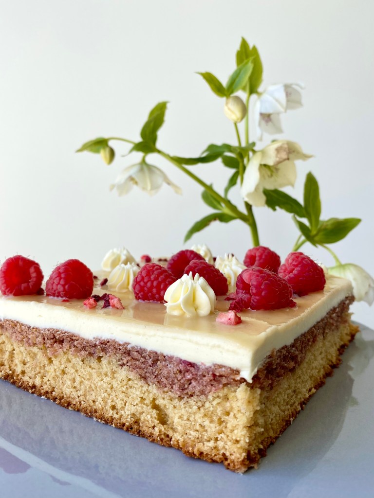 Alle Merkmale der klassischen Donauwelle – zweifarbiger Teig, Früchte (Kirschen), Buttercreme und Schokolade – sind hier in zarten Pastelltönen interpretiert. Ein frischer Kokos-Zitrone-Rührteig trifft auf rosafarbenen Beeren-Rührteig, frische (oder gefrorene) Beeren, eine weiße Buttercreme mit dezenter Kokosnote und weiße Schokolade.