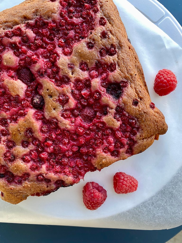 Was die Wahl der Beeren betrifft, die auf den Teig gestreut werden, habe ich einige Versuche durchgeführt, um die beste Kombination zu finden. Mein Favorit sind Johannisbeeren und Himbeeren – zum einen, weil sie lecker sind und zum anderen, weil ihre rosa-rote Farbe so schön mit dem Beeren-Rührteig harmoniert. Geschmacklich würden auch Blaubeeren sehr gut passen, nur die blau-lila Beeren waren mir persönlich zu dunkel für diesen Kuchen. Erdbeeren hingegen waren optisch hübsch, schmeckten aber nach dem Backen eher fad. Im Sommer würde ich auf jeden Fall frische Beeren verwenden, aber auch gefrorene Beeren (nicht aufgetaut) funktionieren gut.