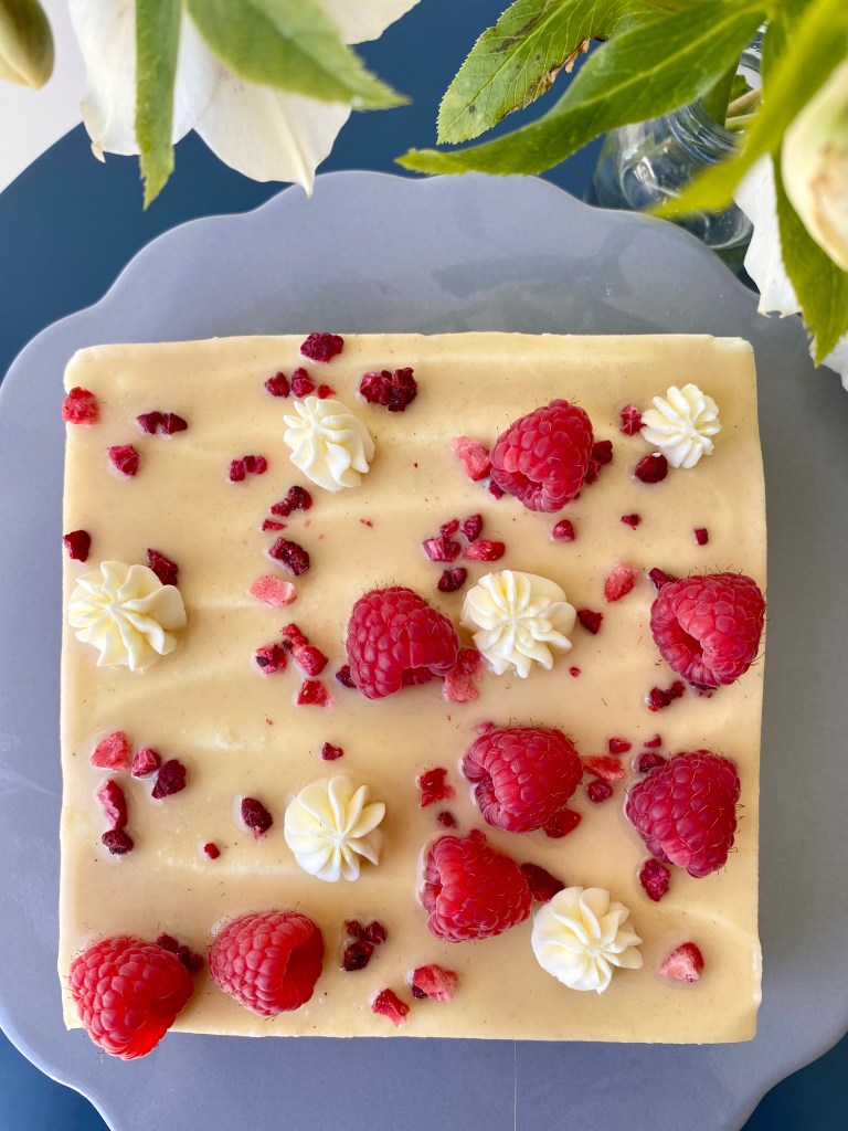 Die weiße Schokoladeglasur braucht ein paar Stunden, um fest zu werden. Der Kuchen kann aber auch schon vorher angeschnitten werden, da die Glasur schon nach kurzer Zeit nicht mehr verläuft. Mit der Zeit wird sie fest und bildet einen knackigen Kontrast zu der weichen Creme. Um schöne Kuchenstücke zu schneiden, sollte die Klinge des Schneidmessers am besten kurz unter warmem Wasser erhitzt werden, damit die Glasur nicht splittert.