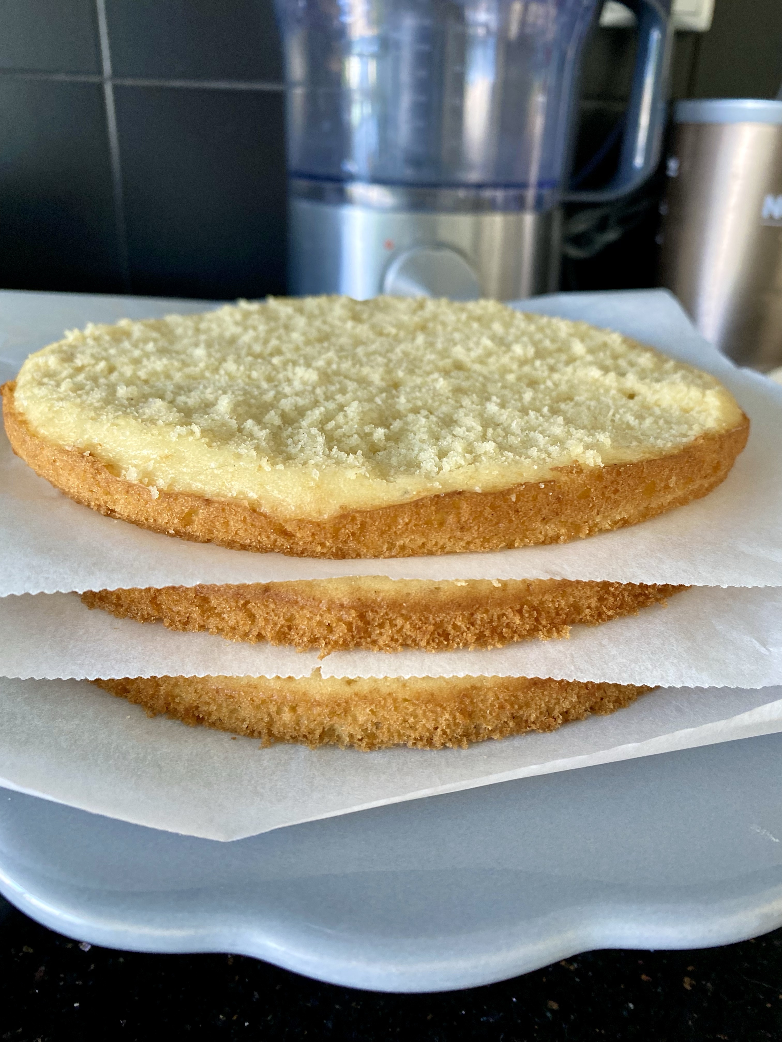 - Den dritten Biskuitboden mit der Unterseite nach oben darauf legen und leicht andrücken.