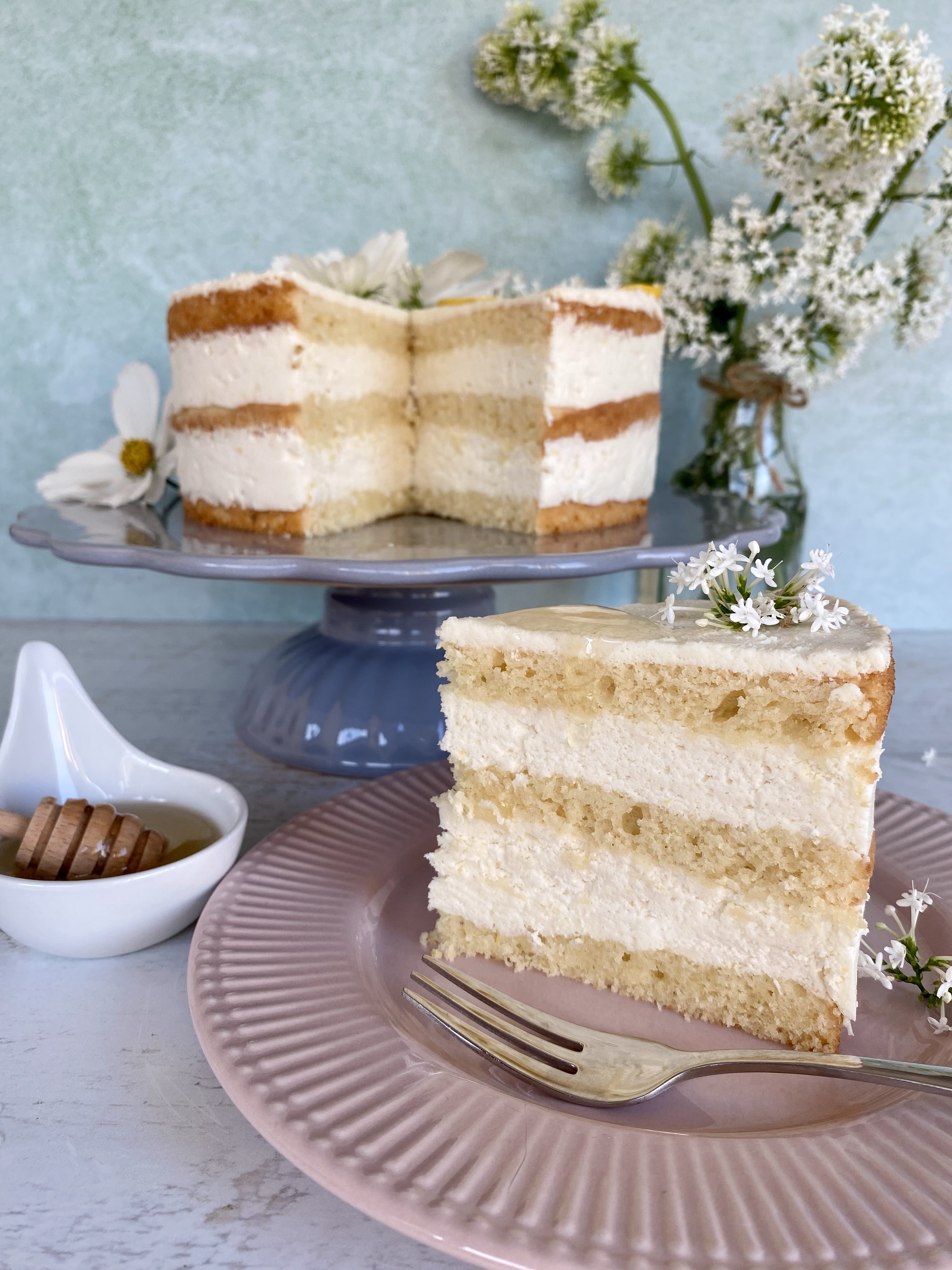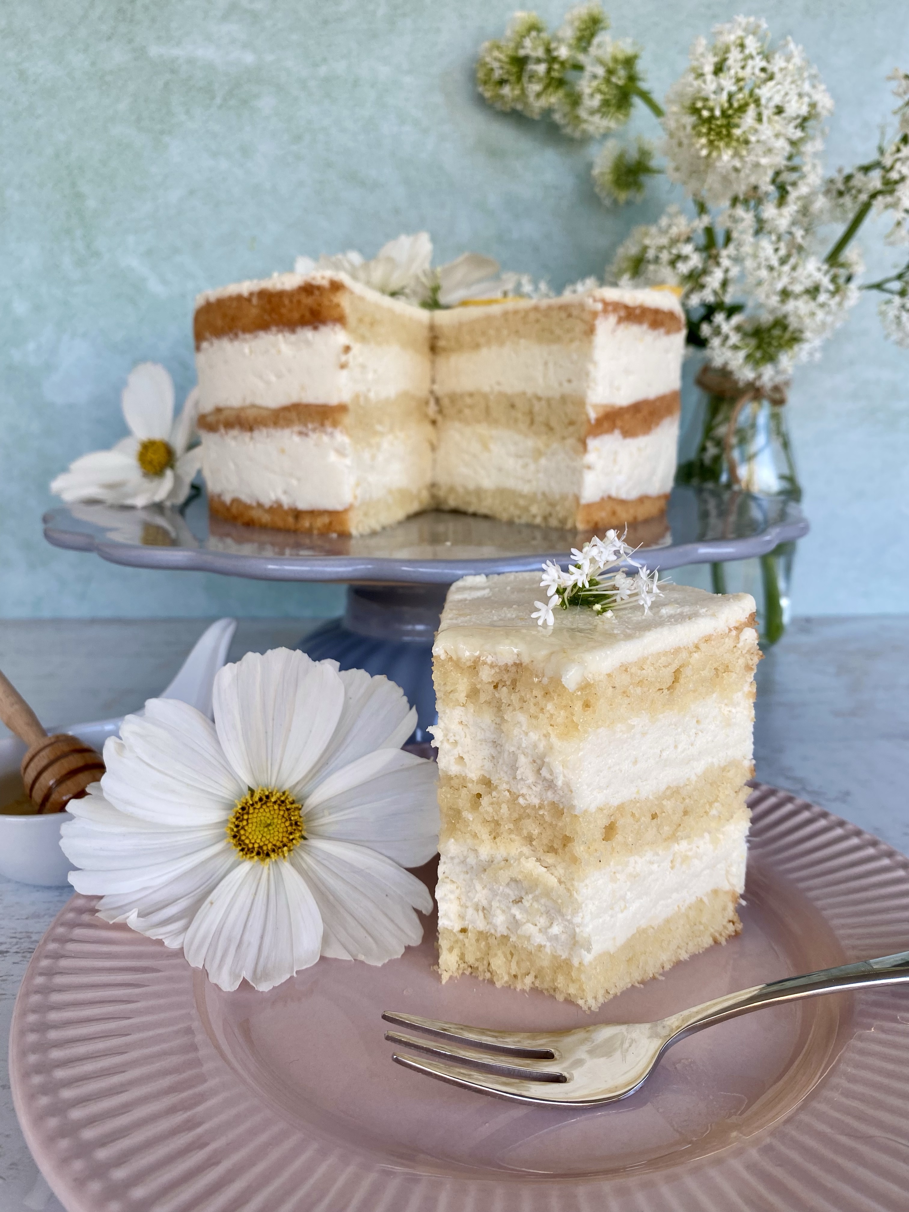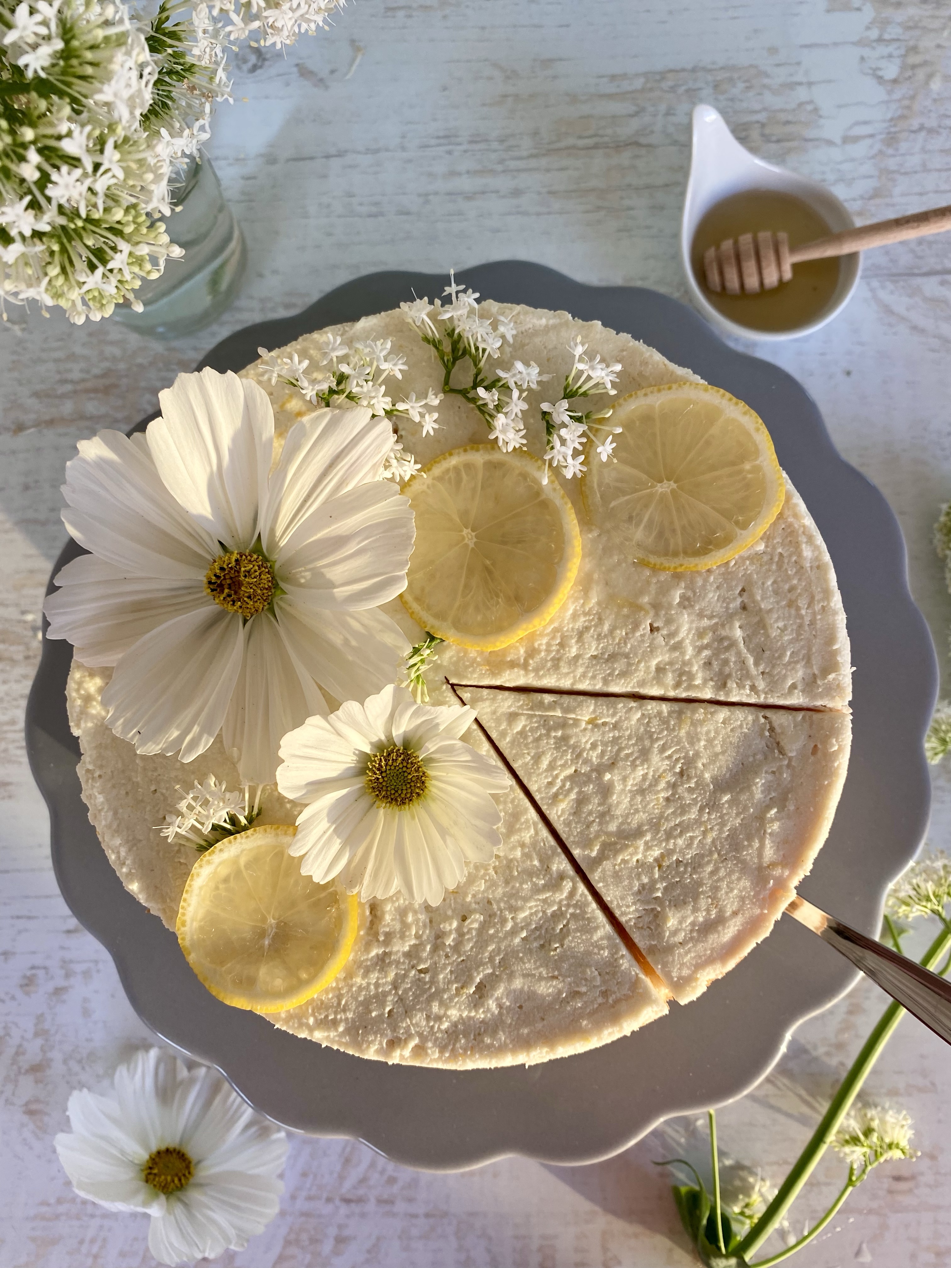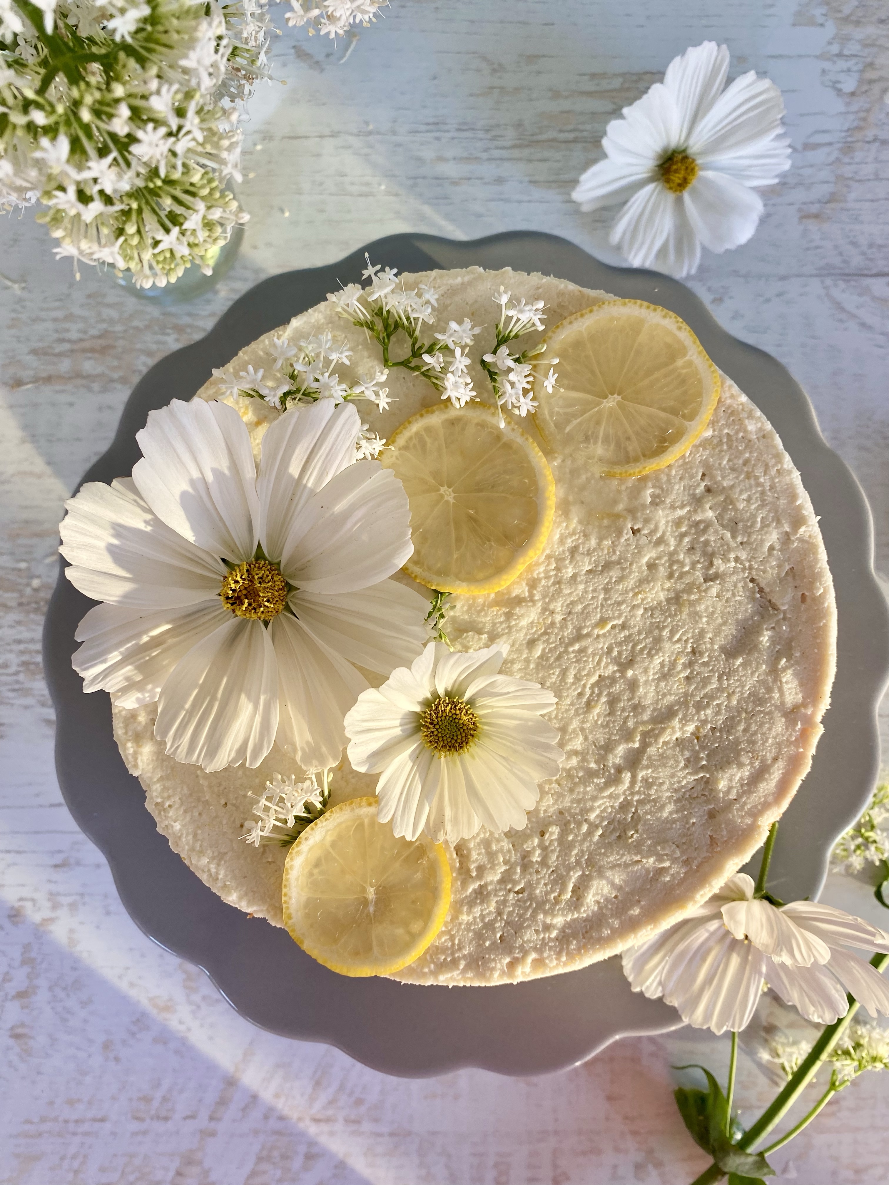 - Die Torte vor dem Servieren mit Zitronenscheiben und optional frischen Blüten dekorieren. Auf jede Zitronenscheibe etwas Zitronensirup träufeln.