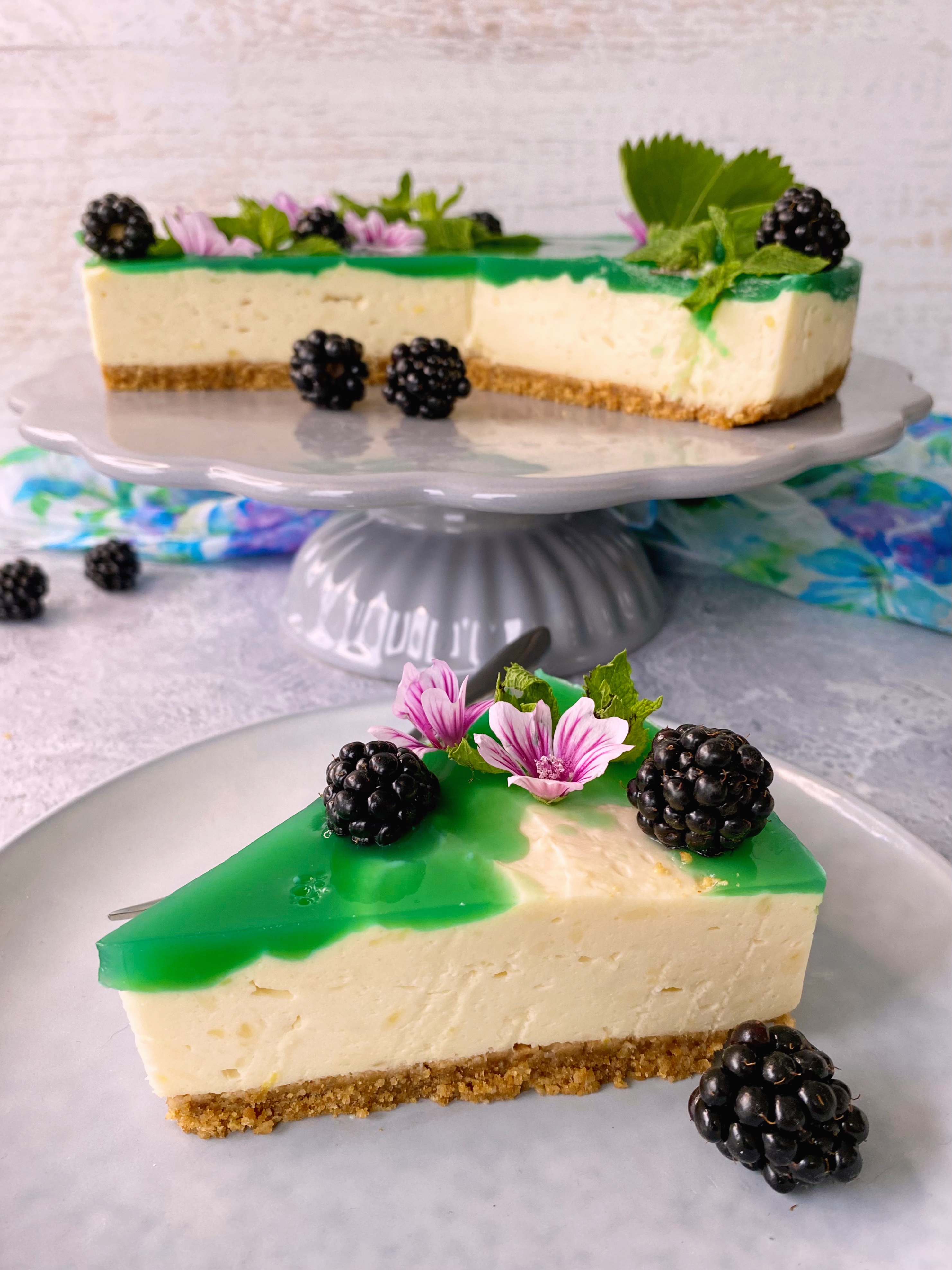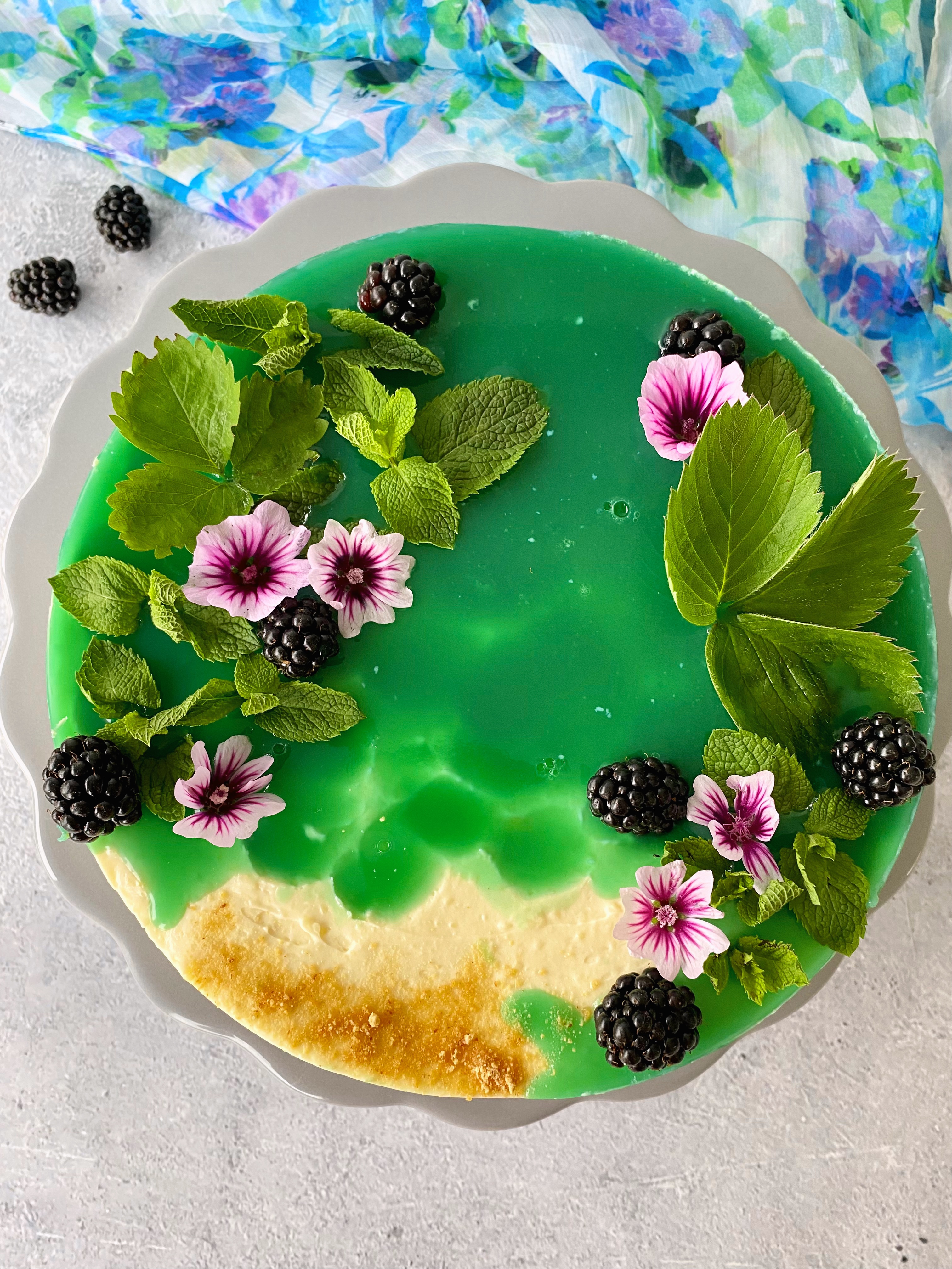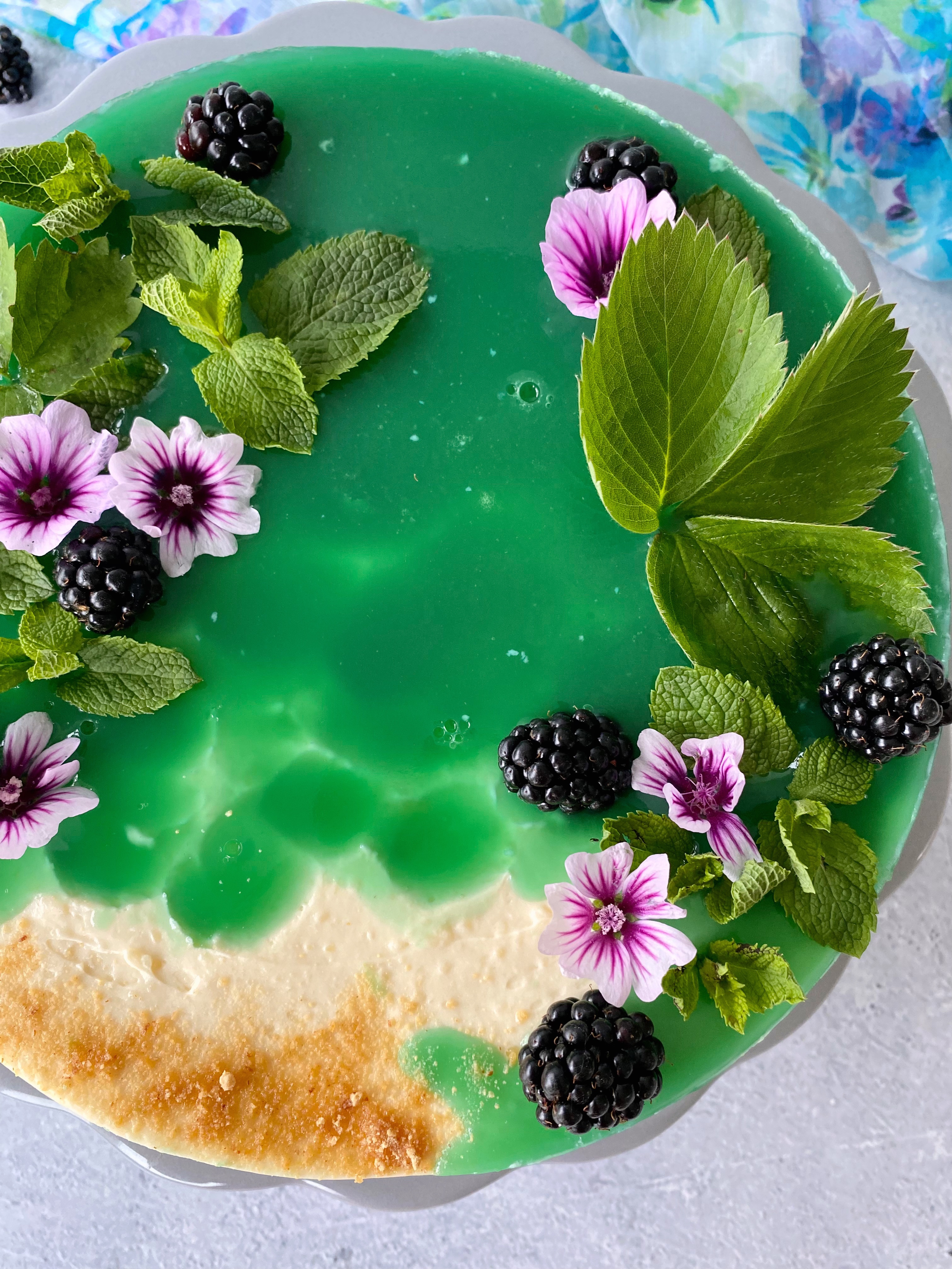 Der Guss und die Dekoration sollten idealerweise erst kurz vor dem Servieren hinzugefügt werden, damit letztere besonders frisch aussieht. Falls der Cheesecake einige Stunden oder einen Tag vor dem Servieren fertig sein soll, empfiehlt es sich, die Minzblättchen durch unterschiedlich große Erdbeerblätter zu ersetzen. Letztere halten sich, genau wie die Blüten, gut gekühlt einen Tag lang auf dem Kuchen frisch.
