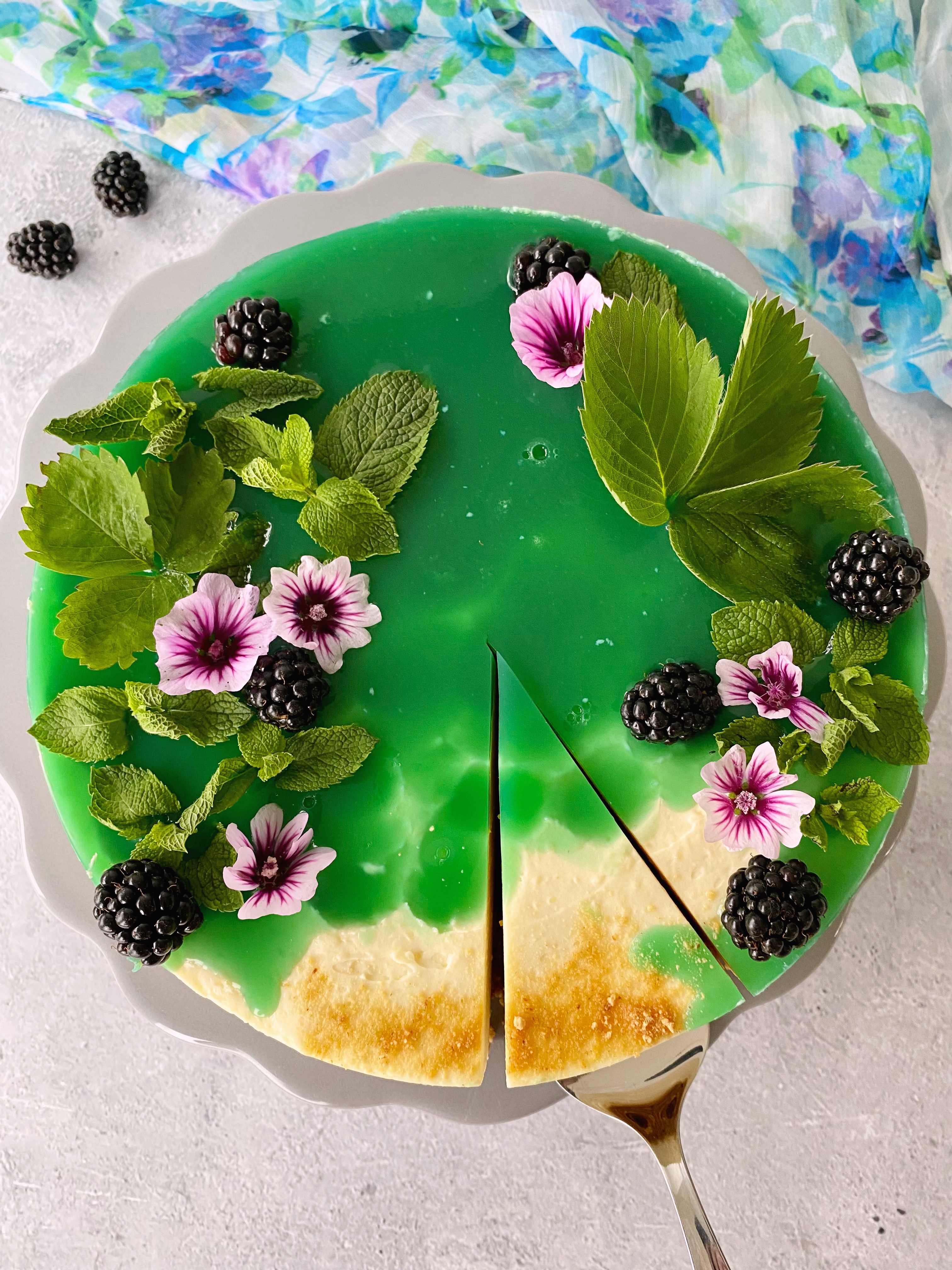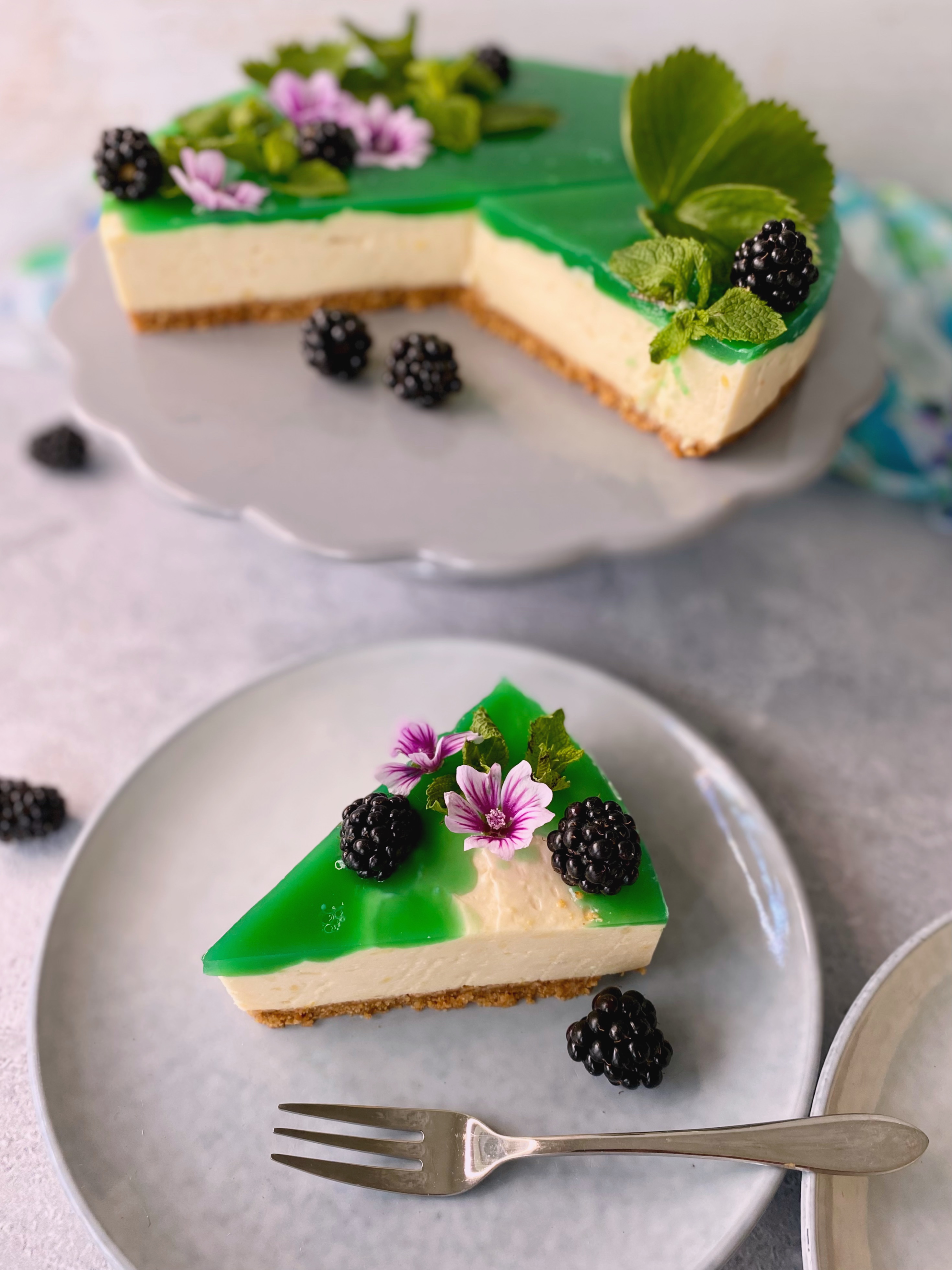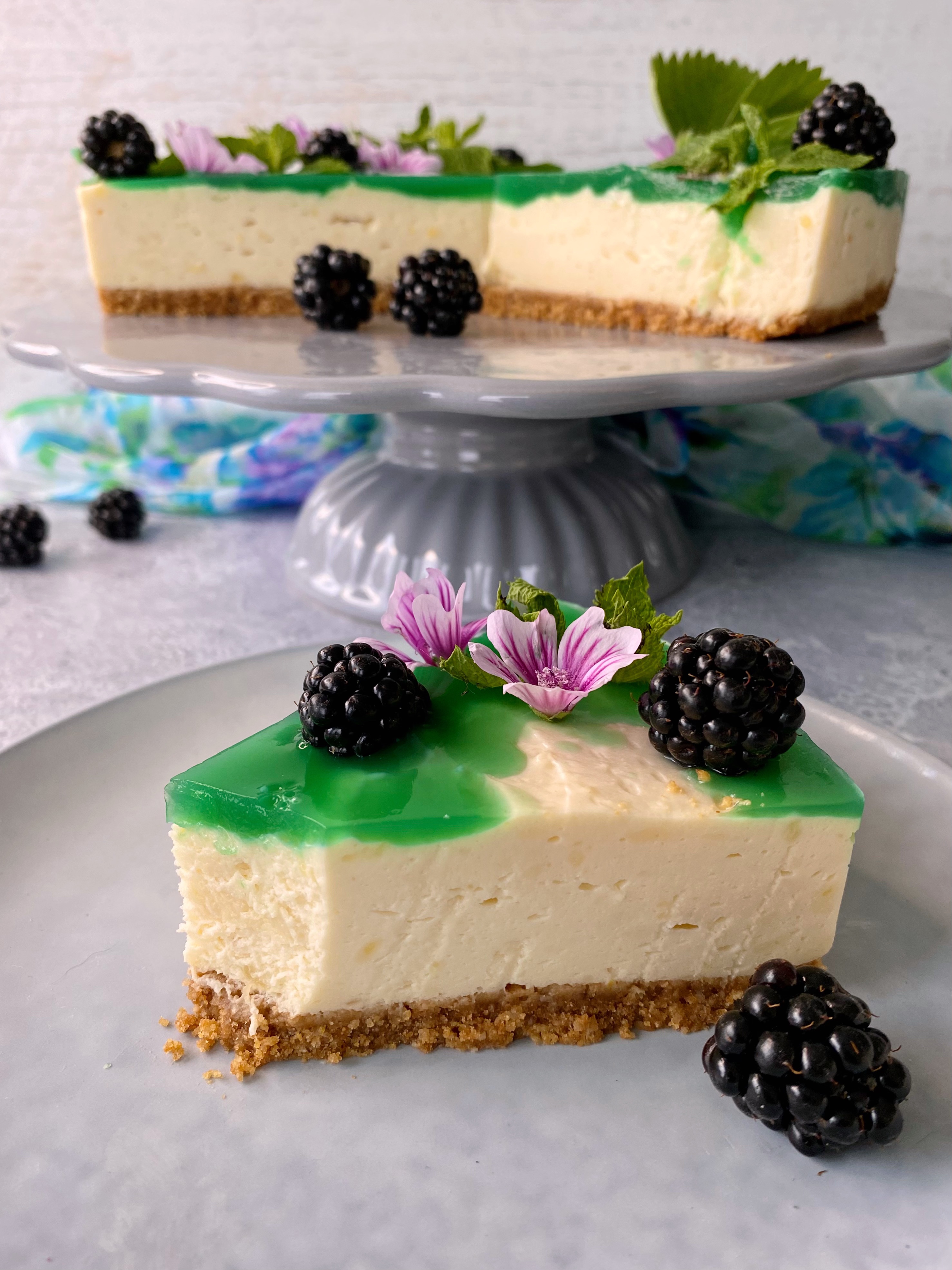 Der Guss und die Dekoration sollten idealerweise erst kurz vor dem Servieren hinzugefügt werden, damit letztere besonders frisch aussieht. Falls der Cheesecake einige Stunden oder einen Tag vor dem Servieren fertig sein soll, empfiehlt es sich, die Minzblättchen durch unterschiedlich große Erdbeerblätter zu ersetzen. Letztere halten sich, genau wie die Blüten, gut gekühlt einen Tag lang auf dem Kuchen frisch.