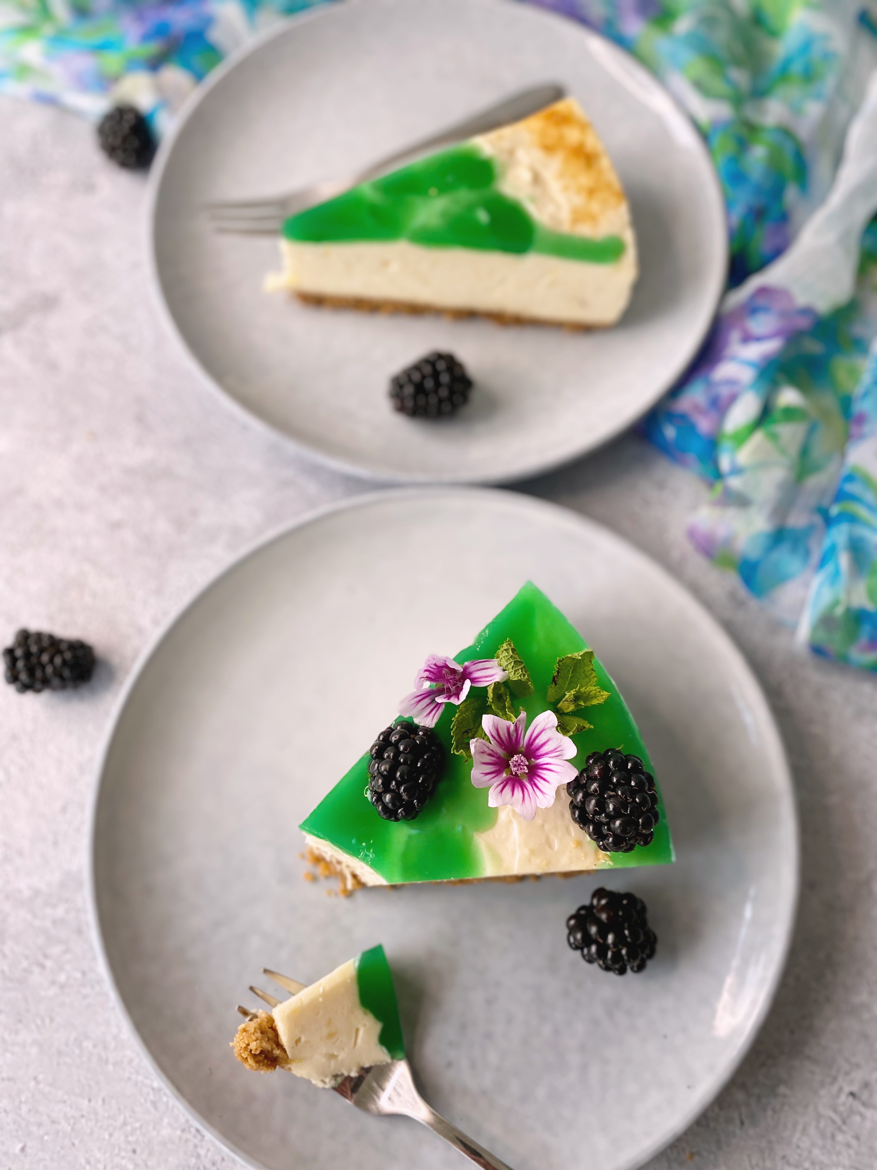 Der Cheesecake sieht nicht nur hübsch aus, er schmeckt auch himmlisch lecker. Der Boden besteht aus Kekskrümeln, und darüber findet sich eine ultra-cremige, erfrischende Cheesecake-Schicht aus pflanzlicher Sahne, Sojaquark, Ananassaft, Zitrone und kondensierter Kokosmilch, gebunden mit Puddingpulver und Agar-Agar.
