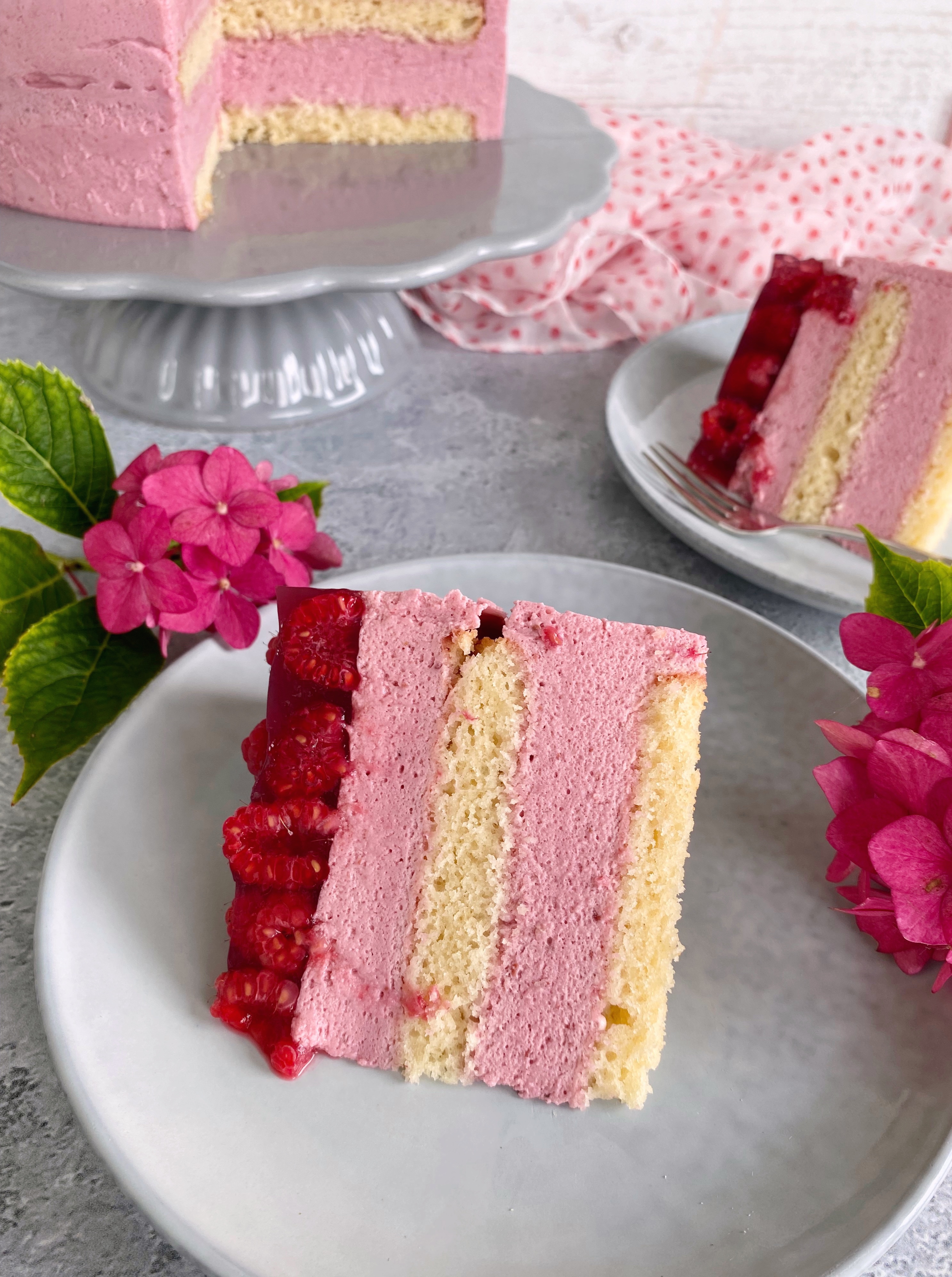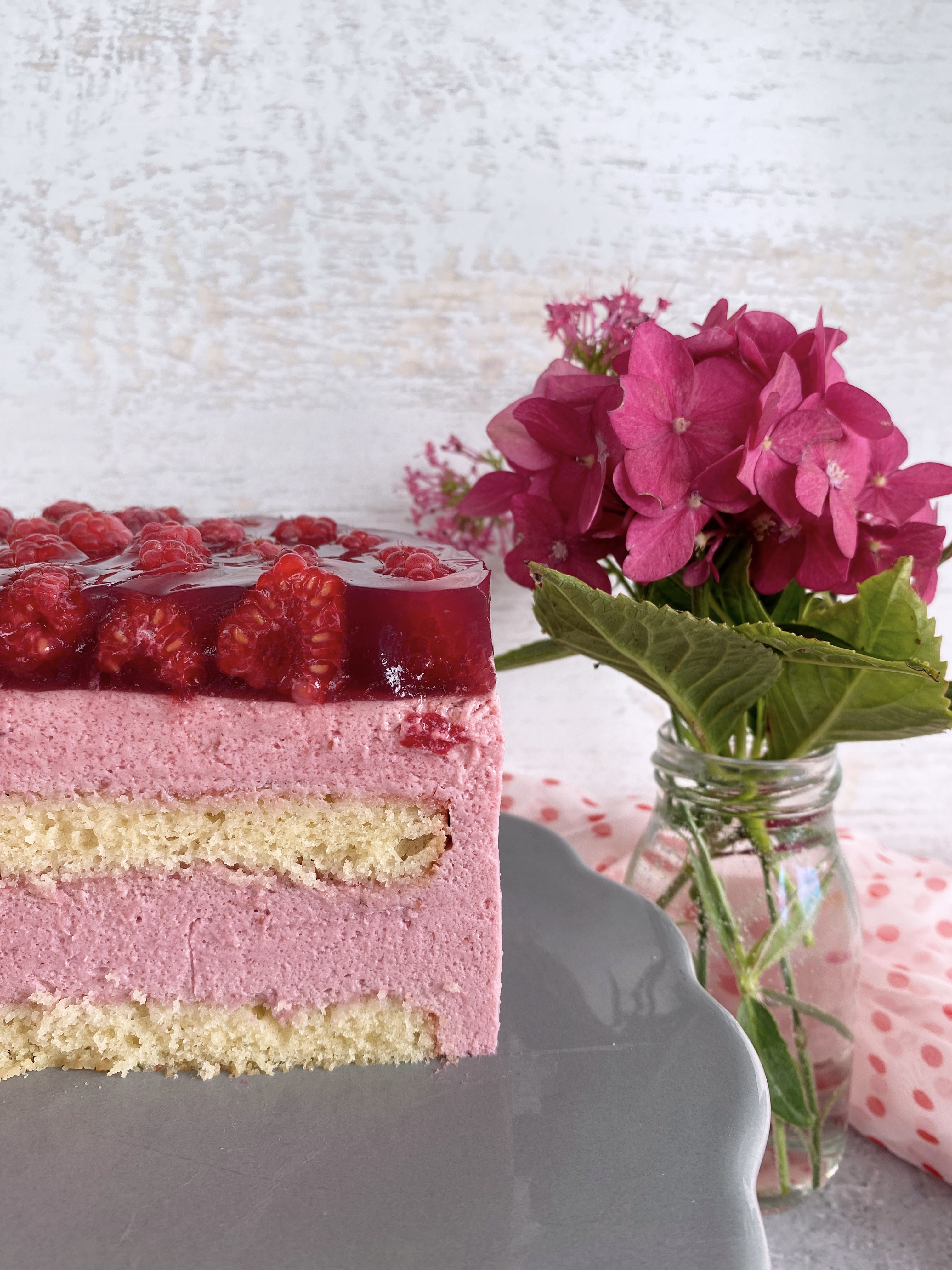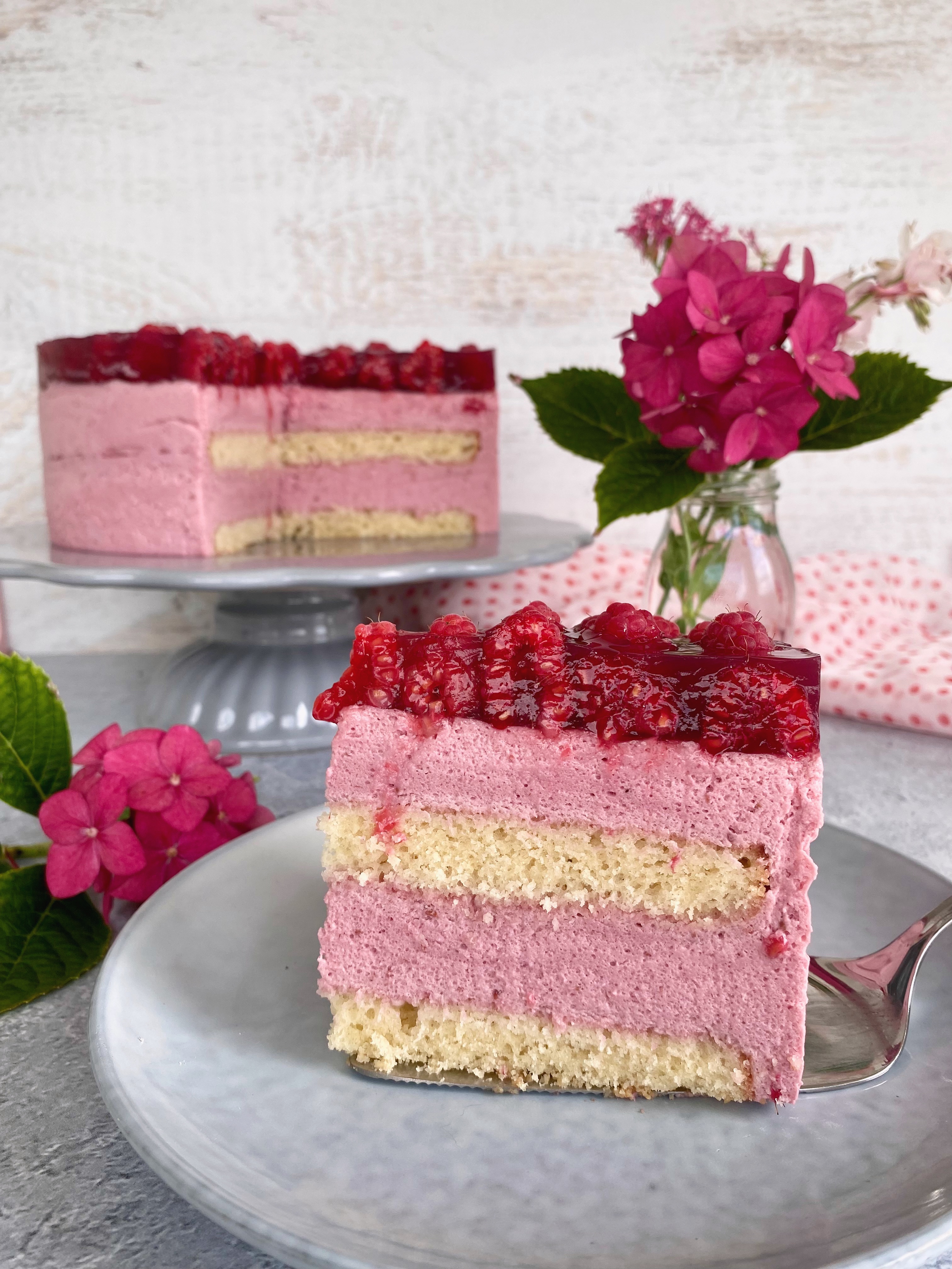 Habe ich schon mal angedeutet, wie sehr ich Pink und Rosa liebe? Und nein, es ist nicht wegen dem aktuellen Barbie-Trend! Diese Torte vereint beide Farbtöne so harmonisch, dass sie auf jeder Kaffeetafel ganz bestimmt die Blicke auf sich ziehen wird. Die Torte besteht aus zwei zarten Biskuitböden und einer luftigen Himbeer-Mousse gekrönt von glänzend rotem Gelee und frischen Himbeeren.