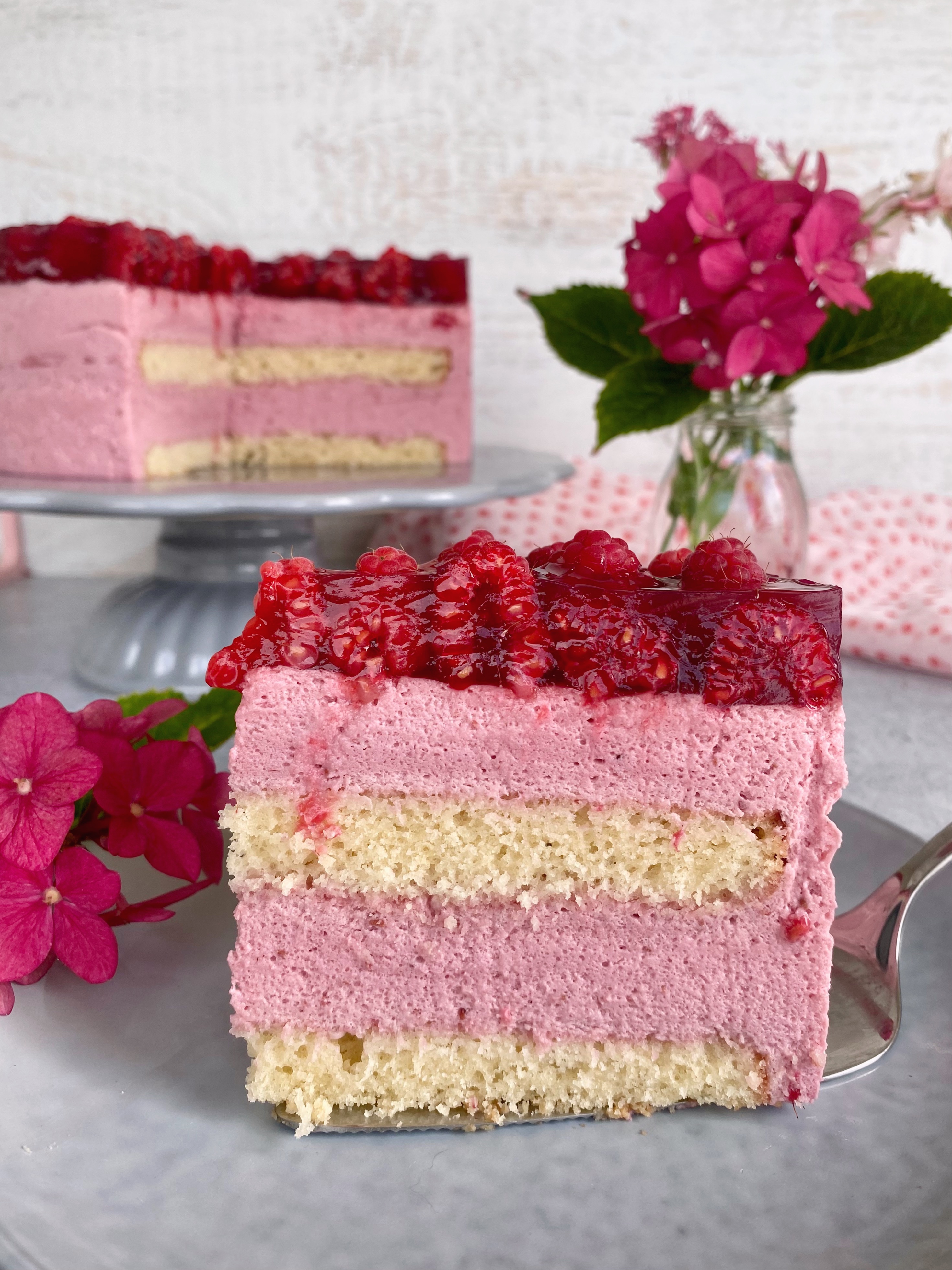 Der Biskuitboden hat eine zarte Textur und eine hellgelbe Farbe, die wunderschön zu dem zarten Pastellton der Himbeerfüllung passt und einen schönen Kontrast zu den leuchtenden Himbeeren bildet.