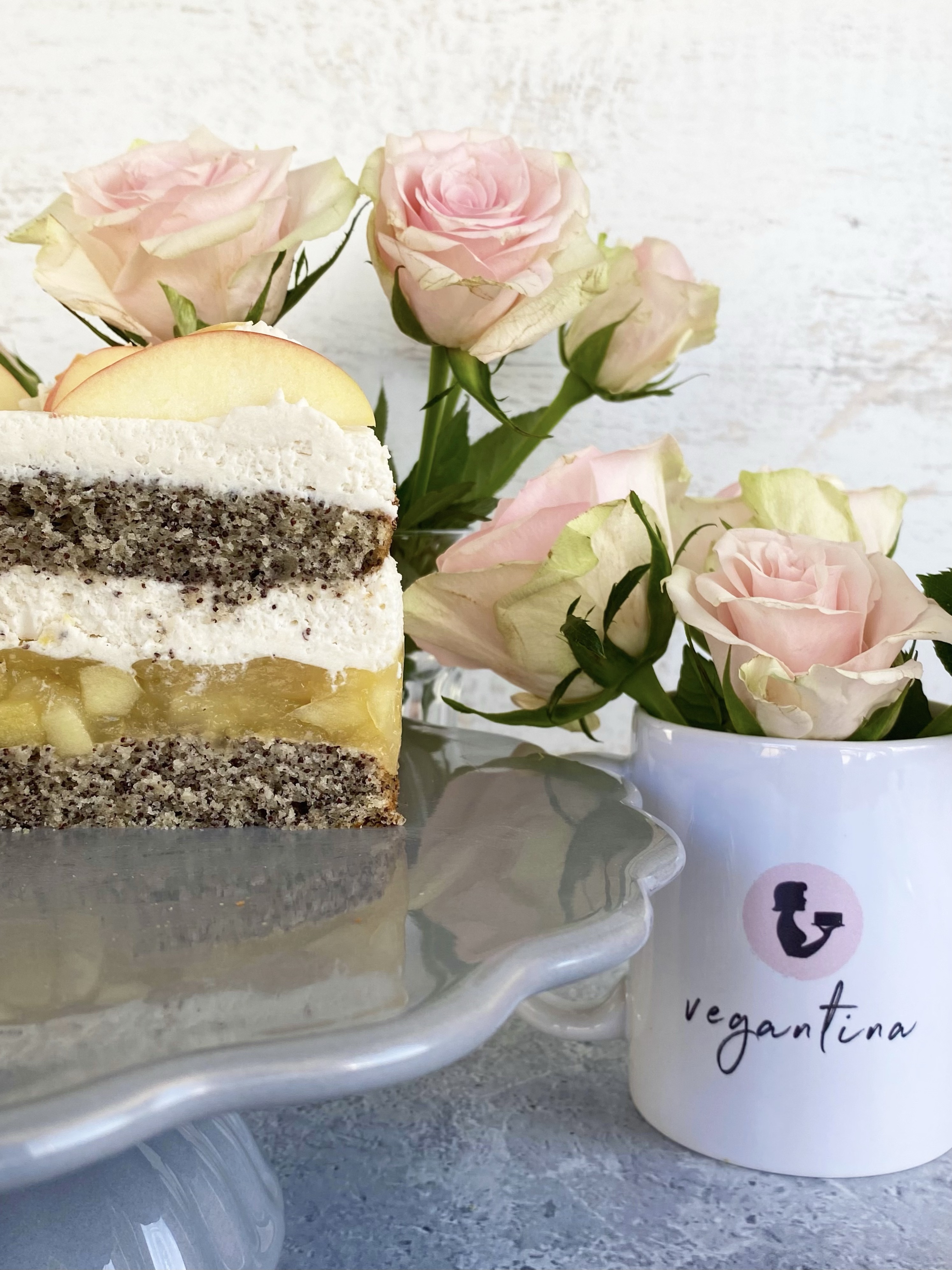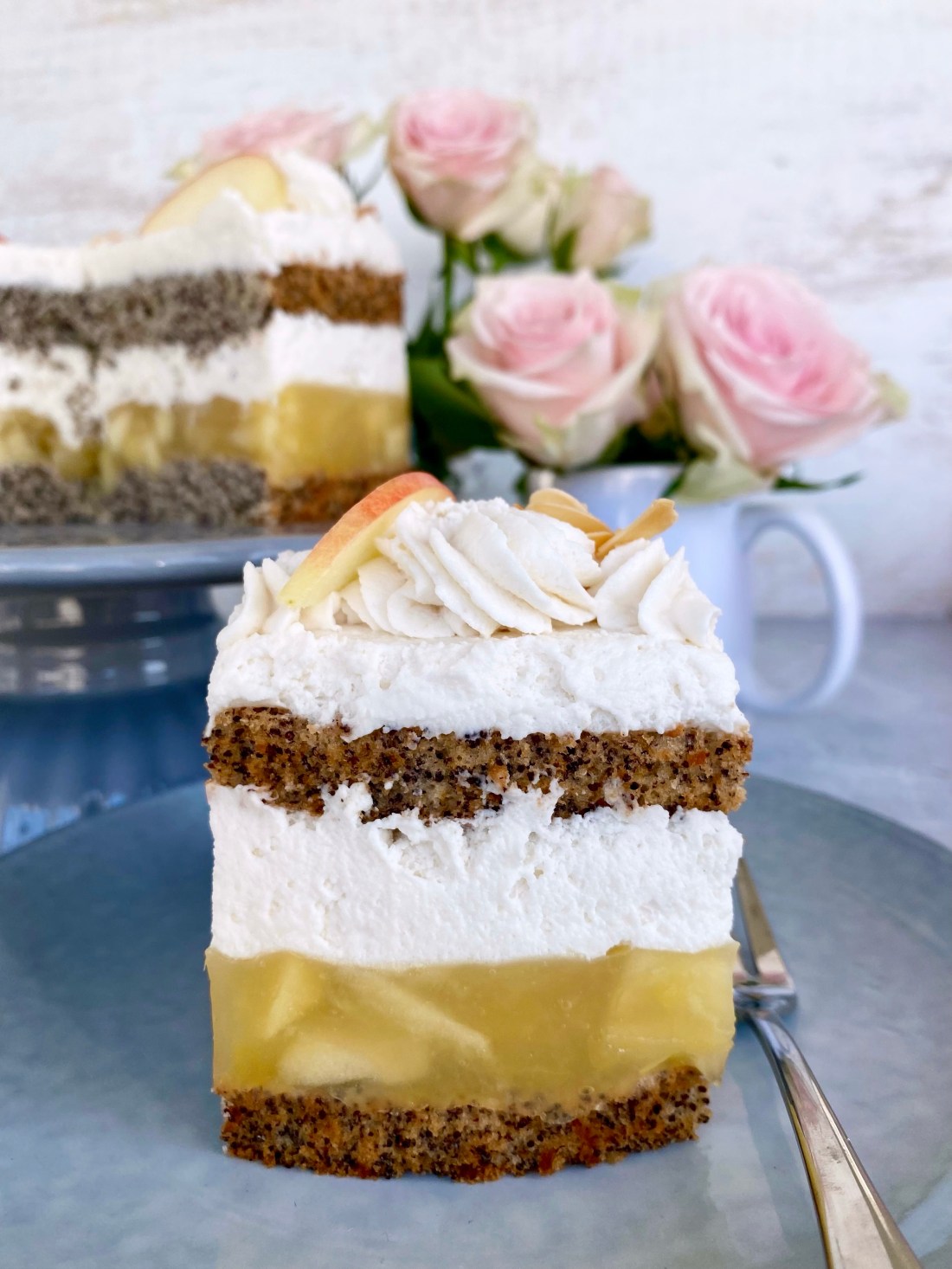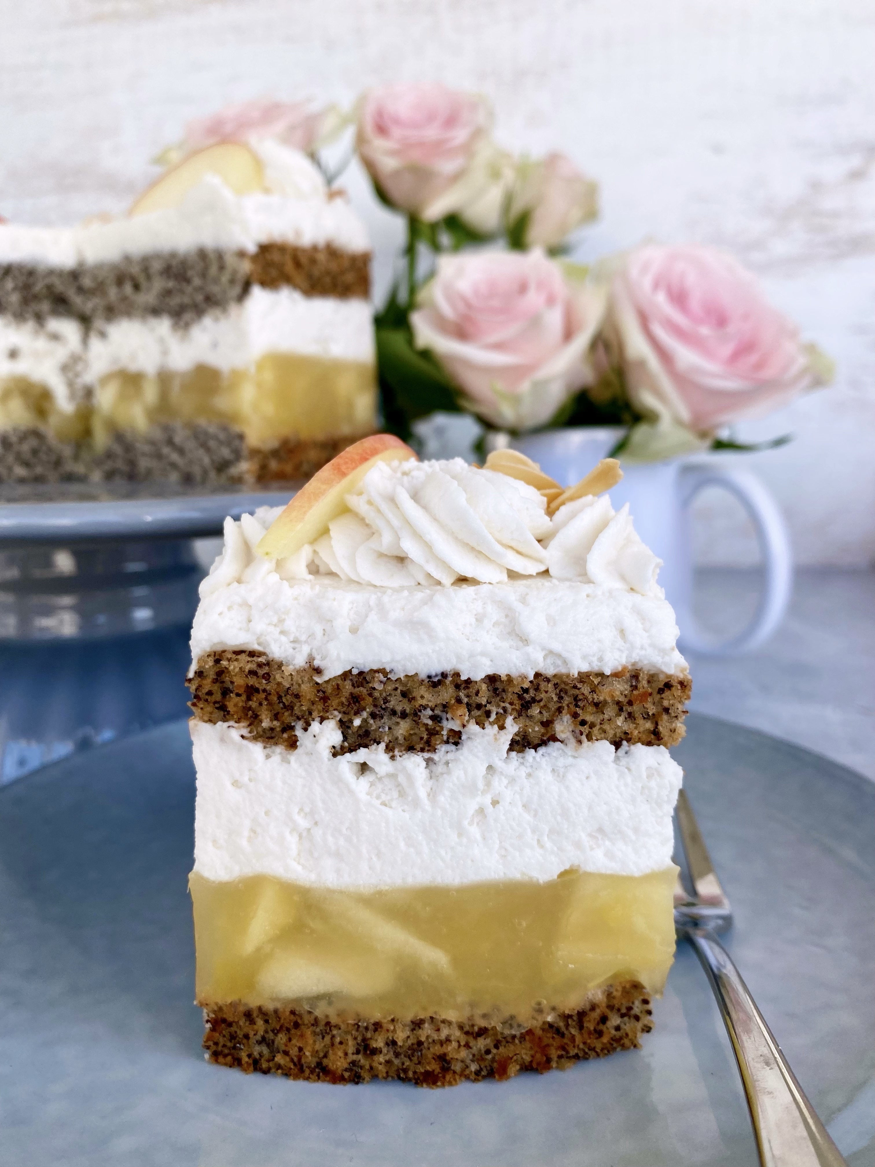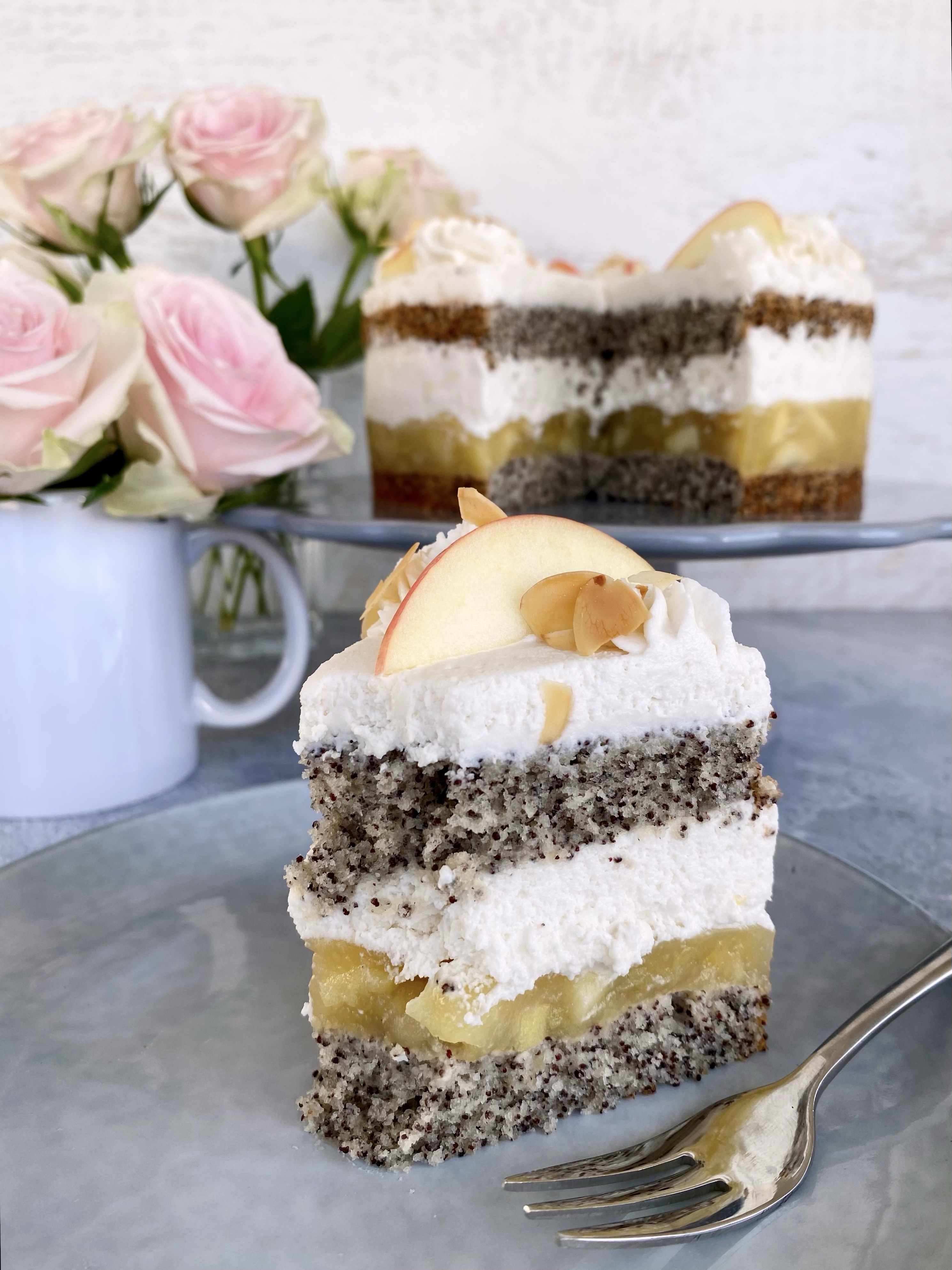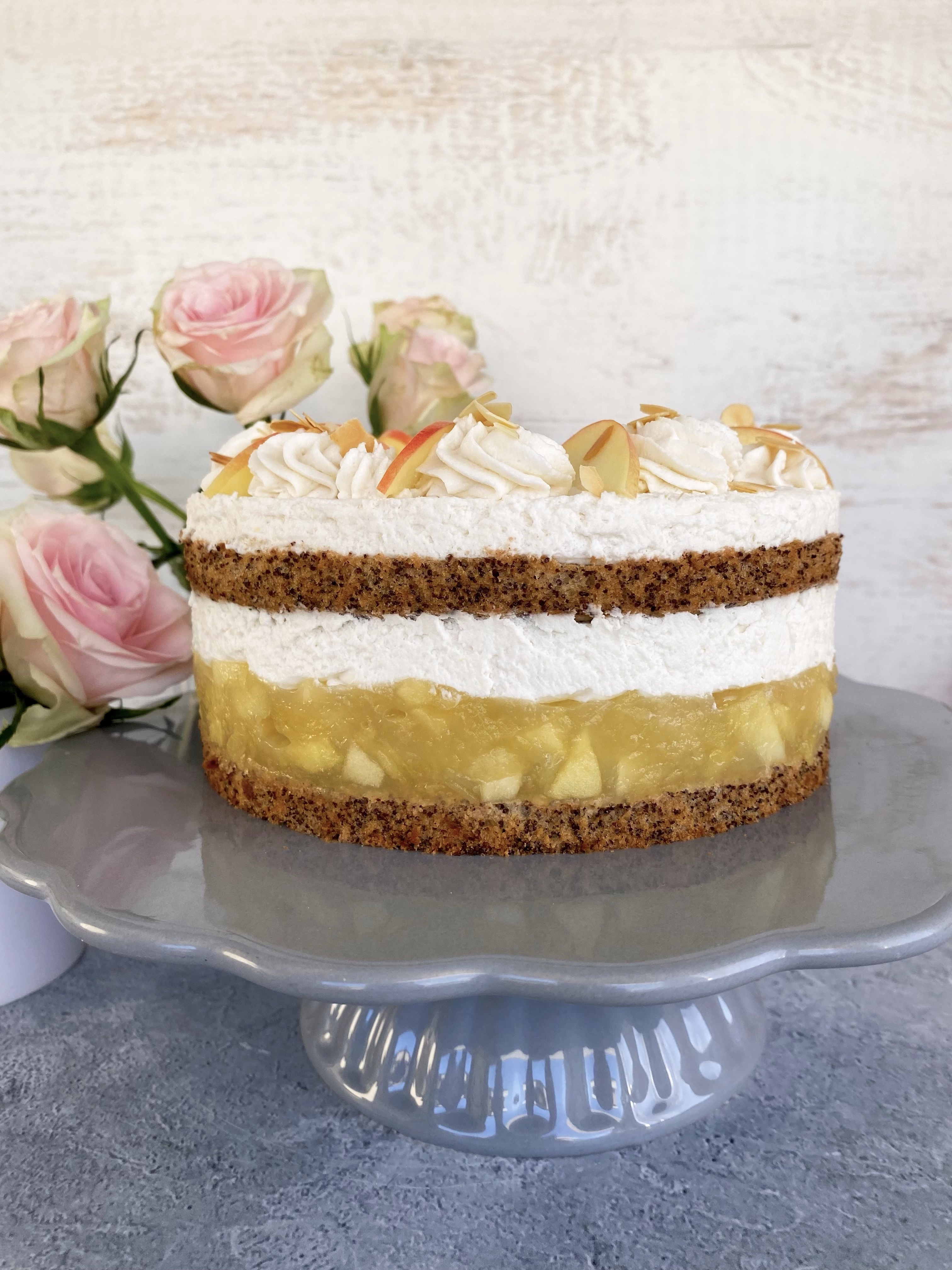 Die Basis der Torte sind zwei zarte Mohnbiskuitböden mit einer feinen Bittermandelnote. Sie erinnern geschmacklich an eine Mohn-Marzipan-Füllung, wie sie oft für Hefeteilchen verwendet wird. Gefüllt ist die Torte mit selbstgemachtem Apfelkompott und einer süßen Apfelsahnecreme. Vanillepuddingpulver hilft dabei, das Apfelkompott in Form zu halten.
