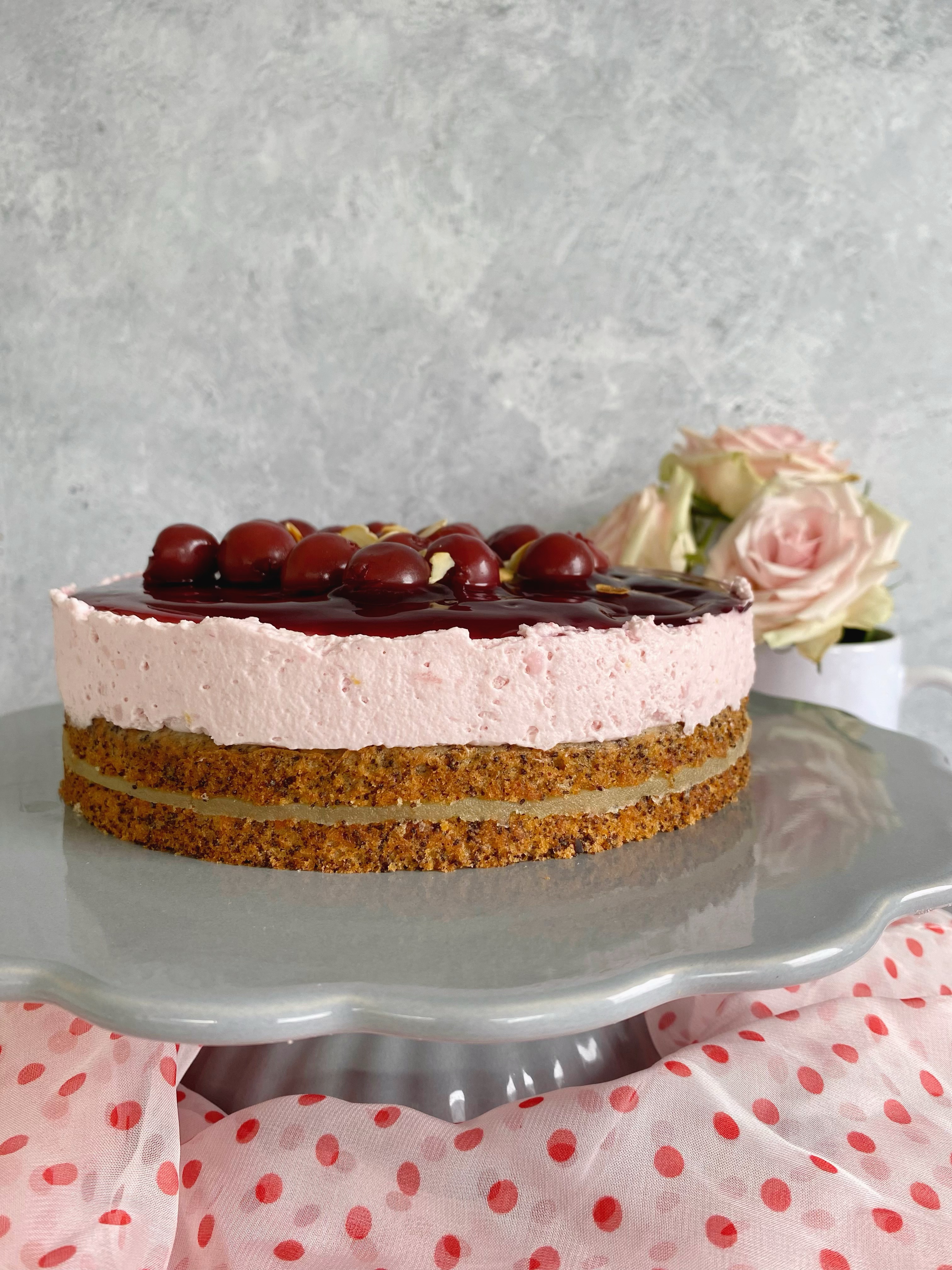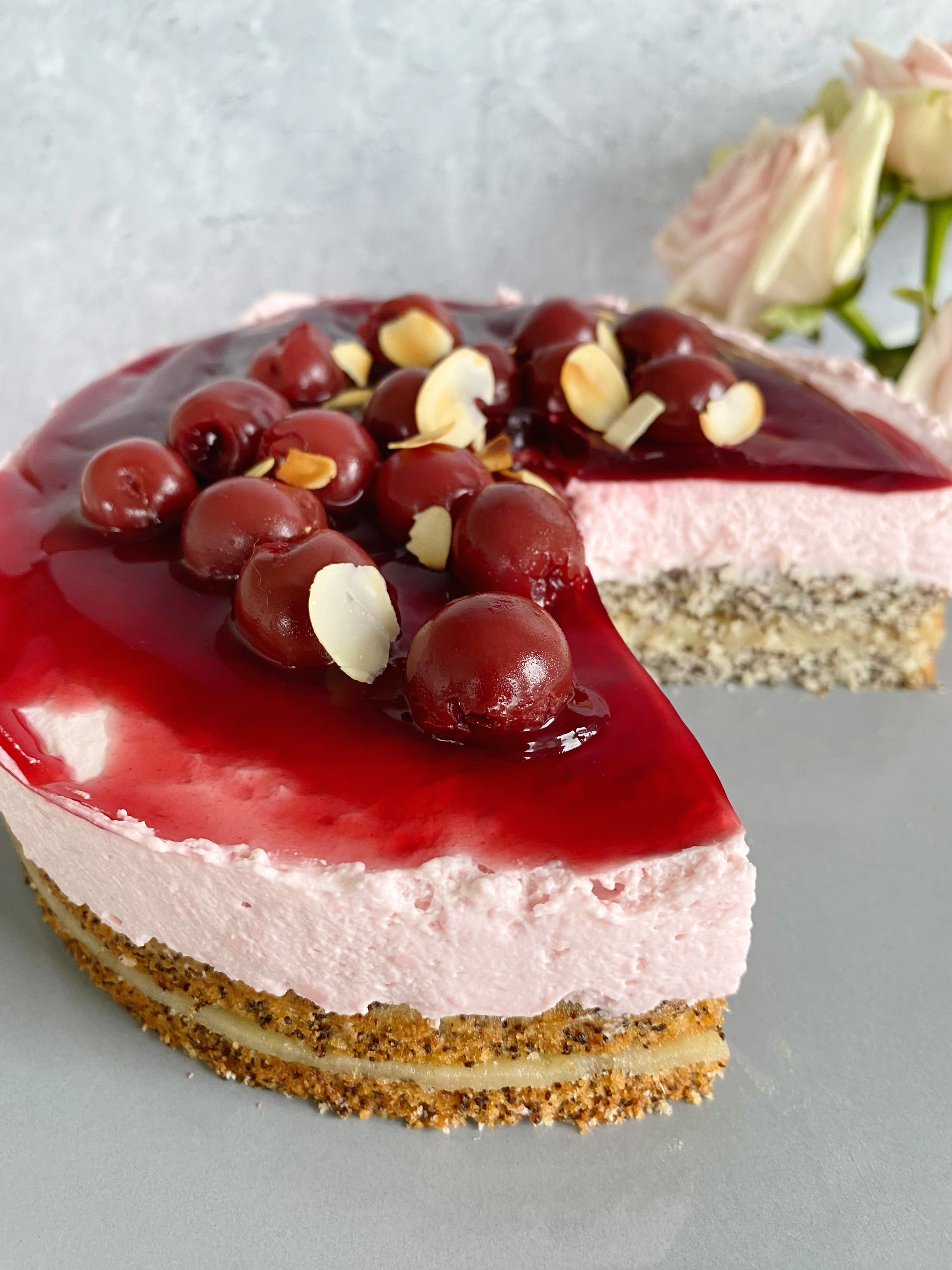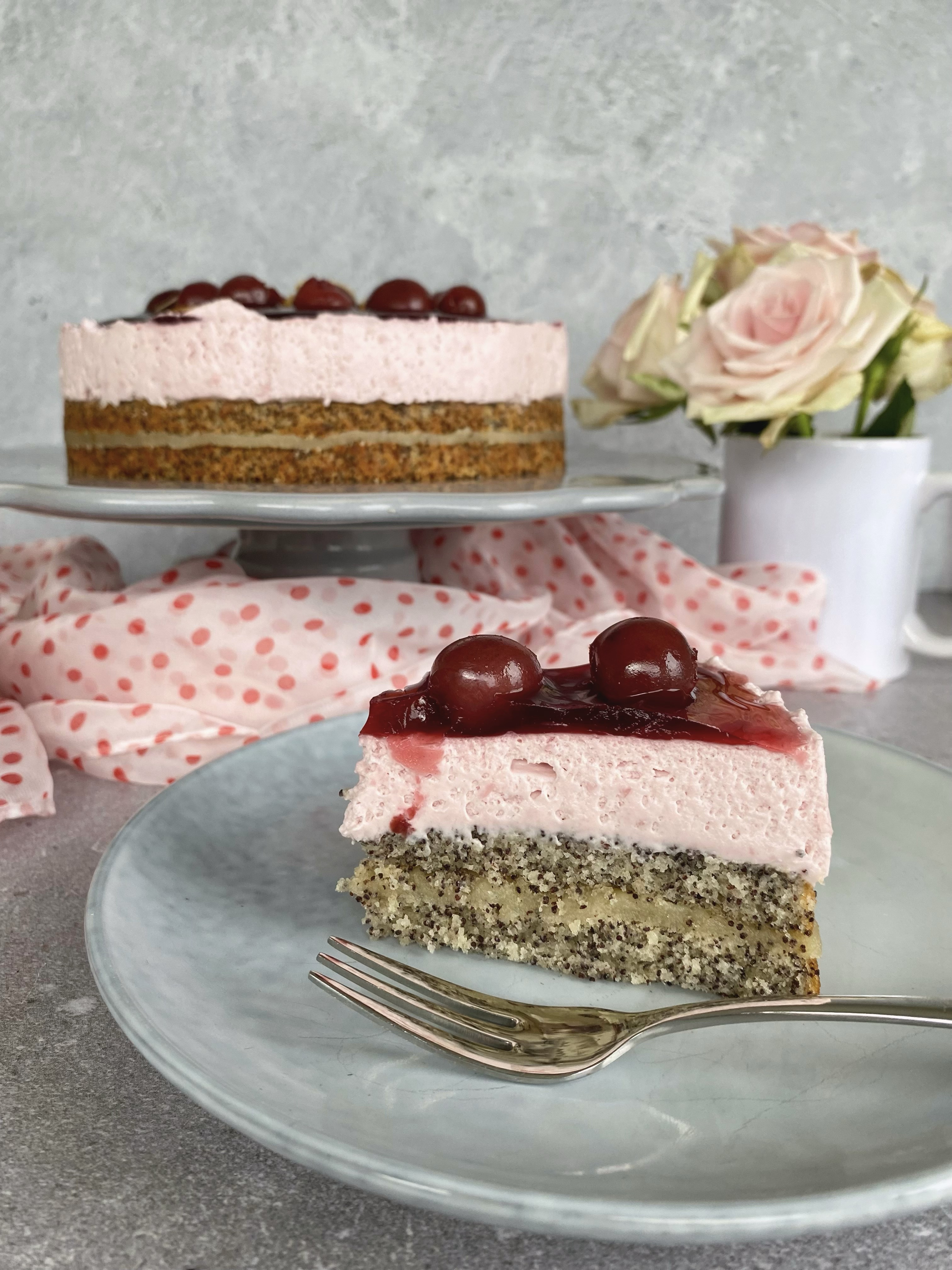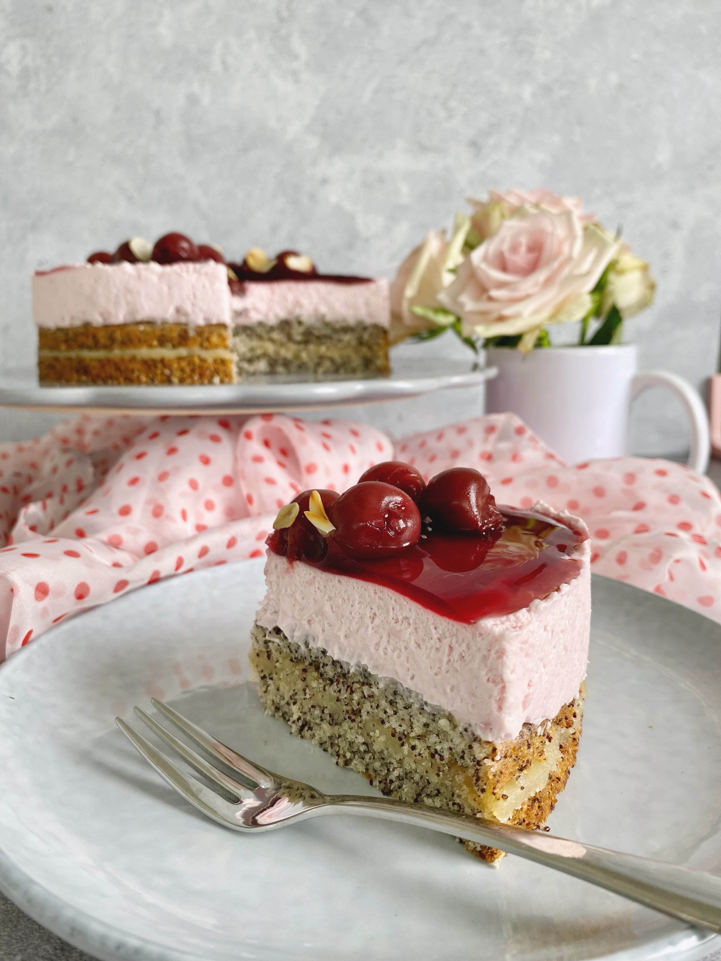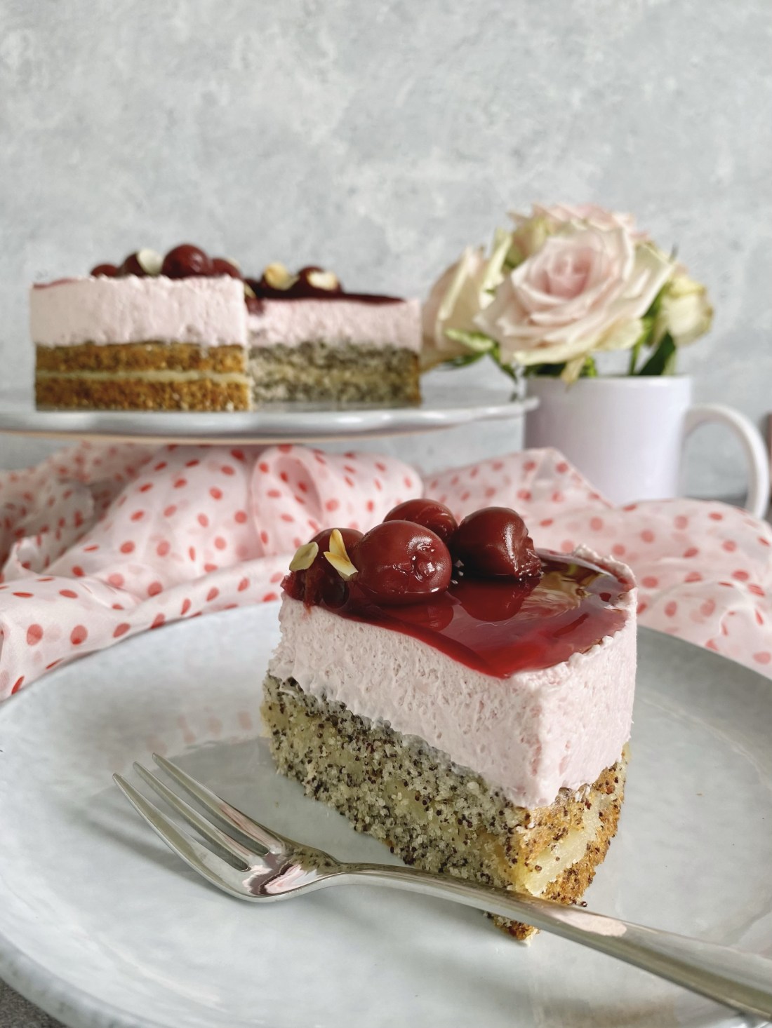 Feines Mohnbiskuit mit Marzipan und luftiger Sahnecreme gekrönt von einem Kirschspiegel und ganzen Kirschen.