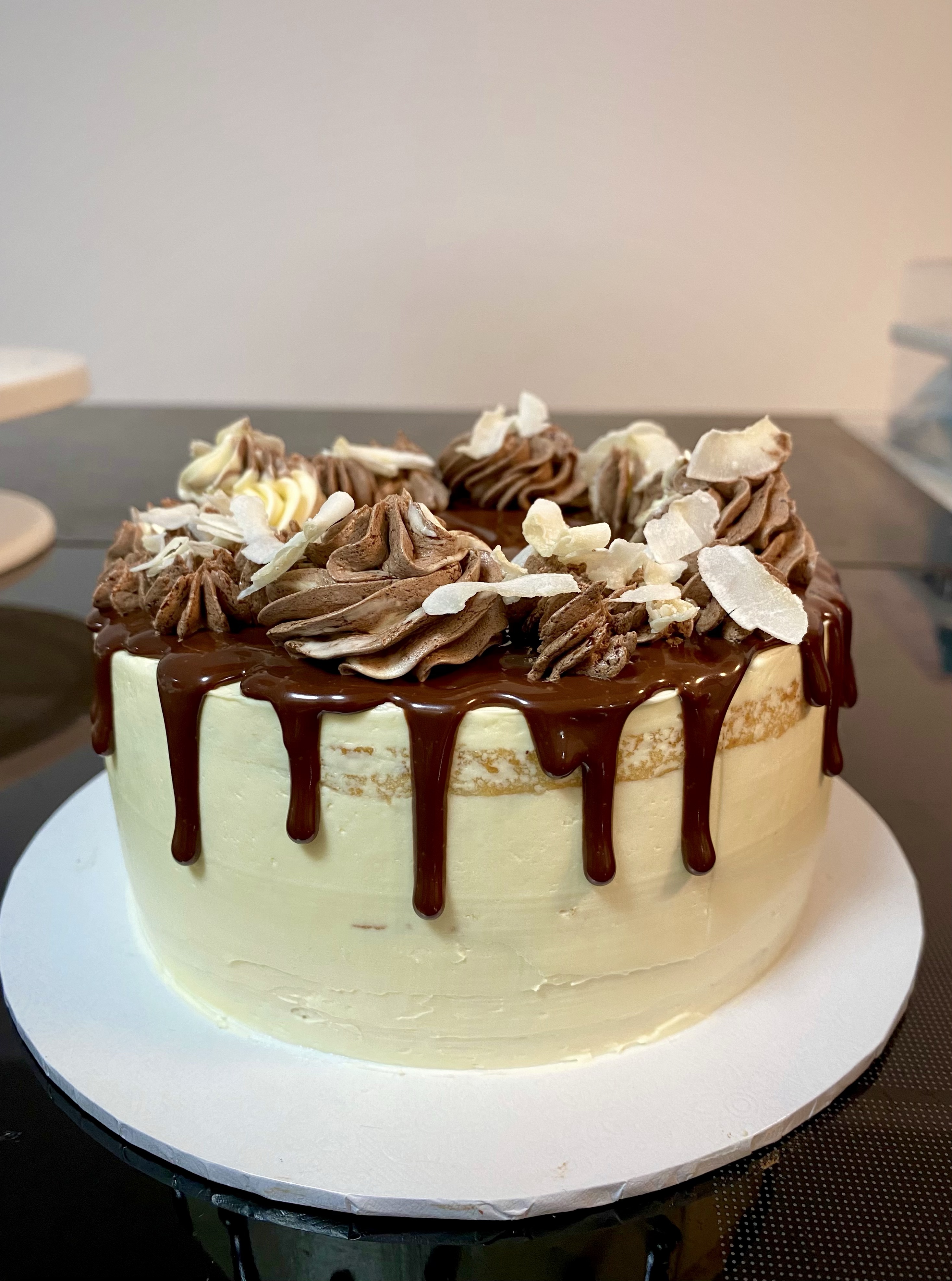 Cremiges Törtchen mit fluffigem Kokosbiskuit, seidiger Frischkäse-Buttercreme und einem Drip aus glänzender Schokoganache.