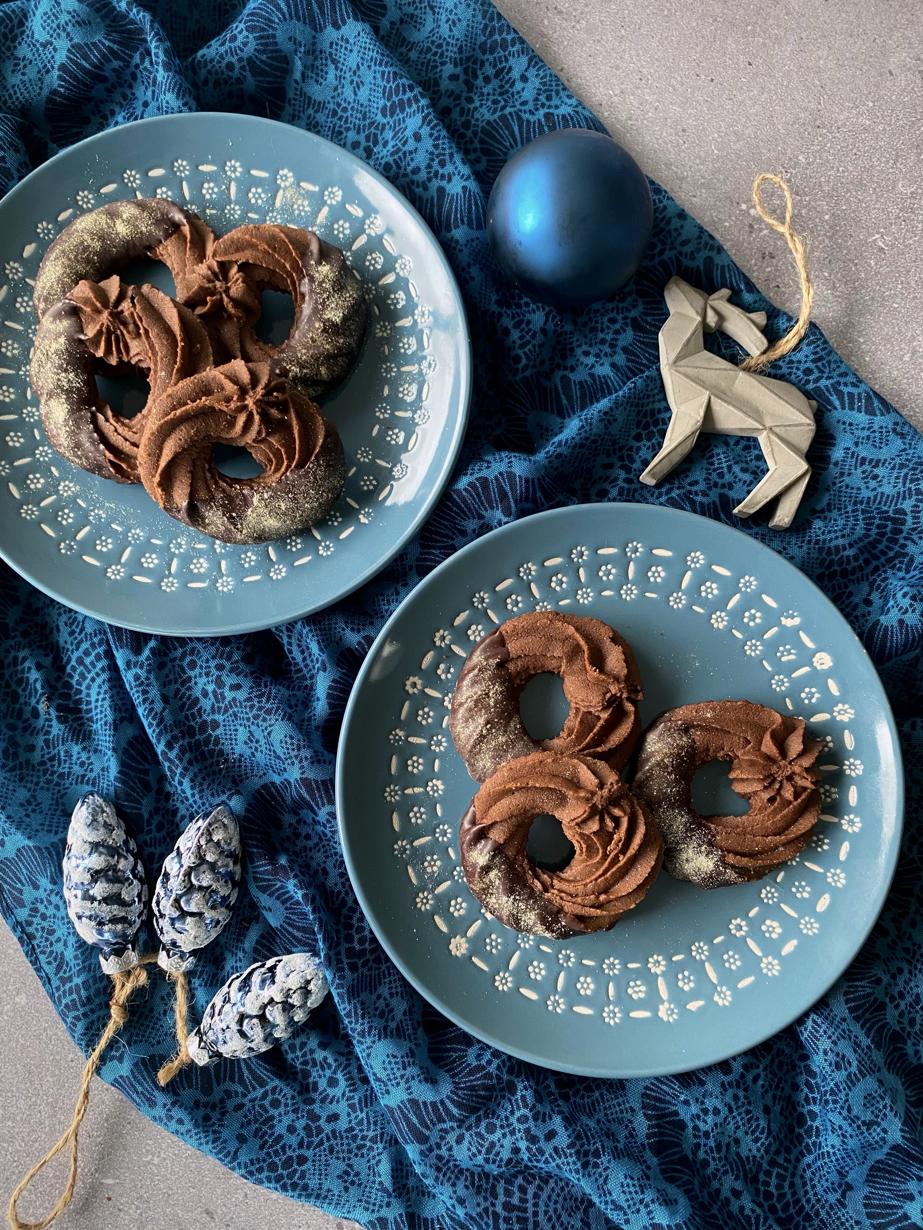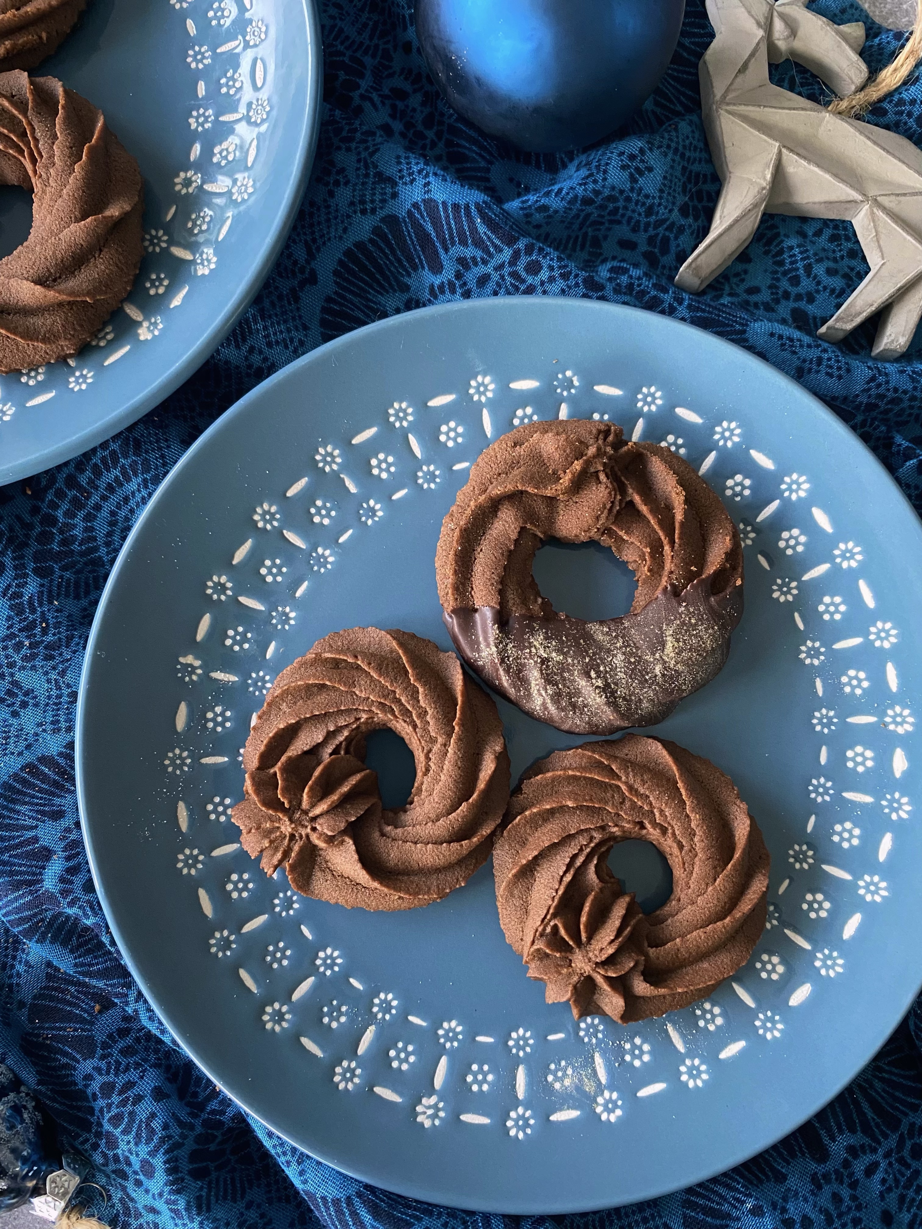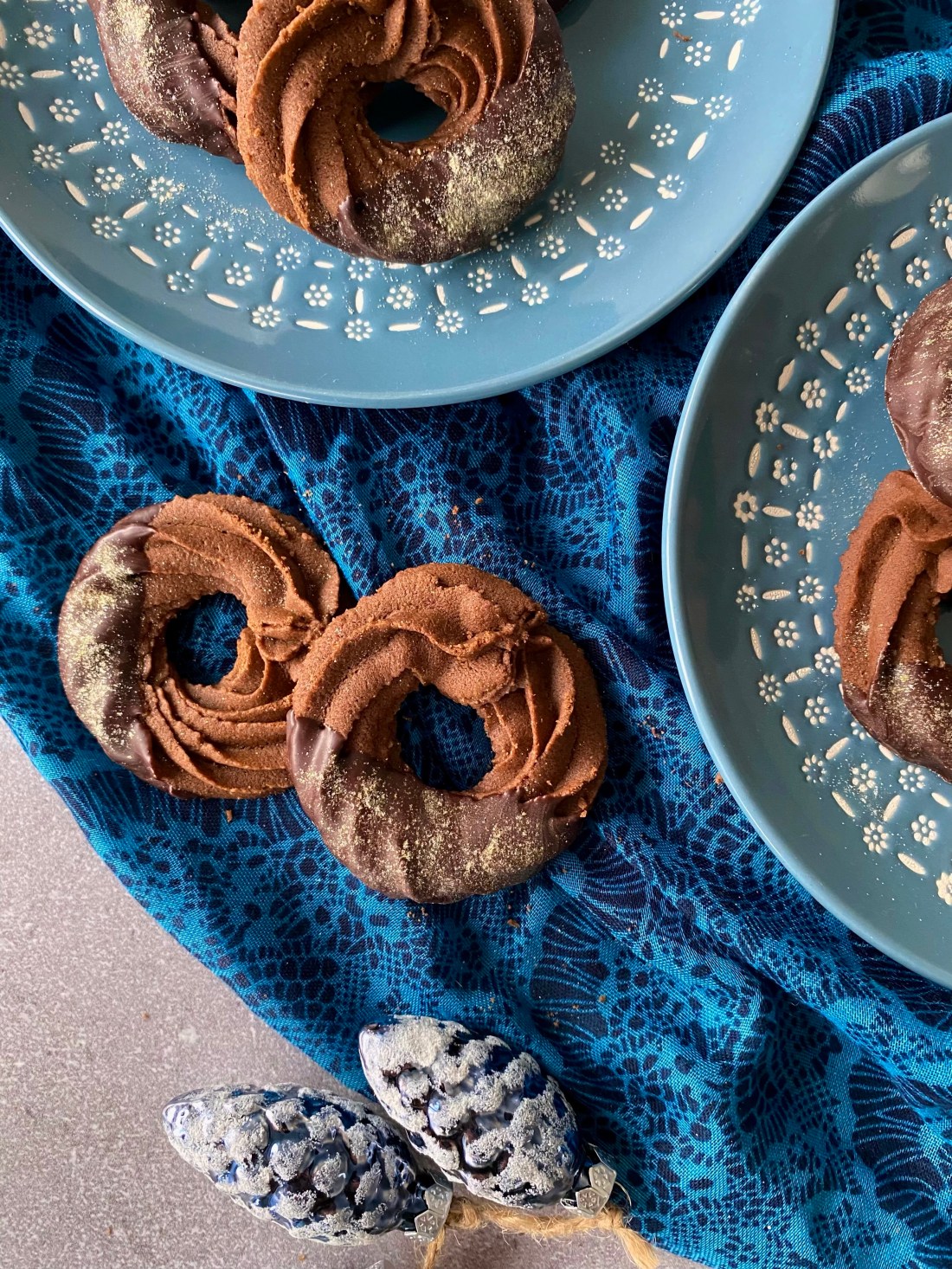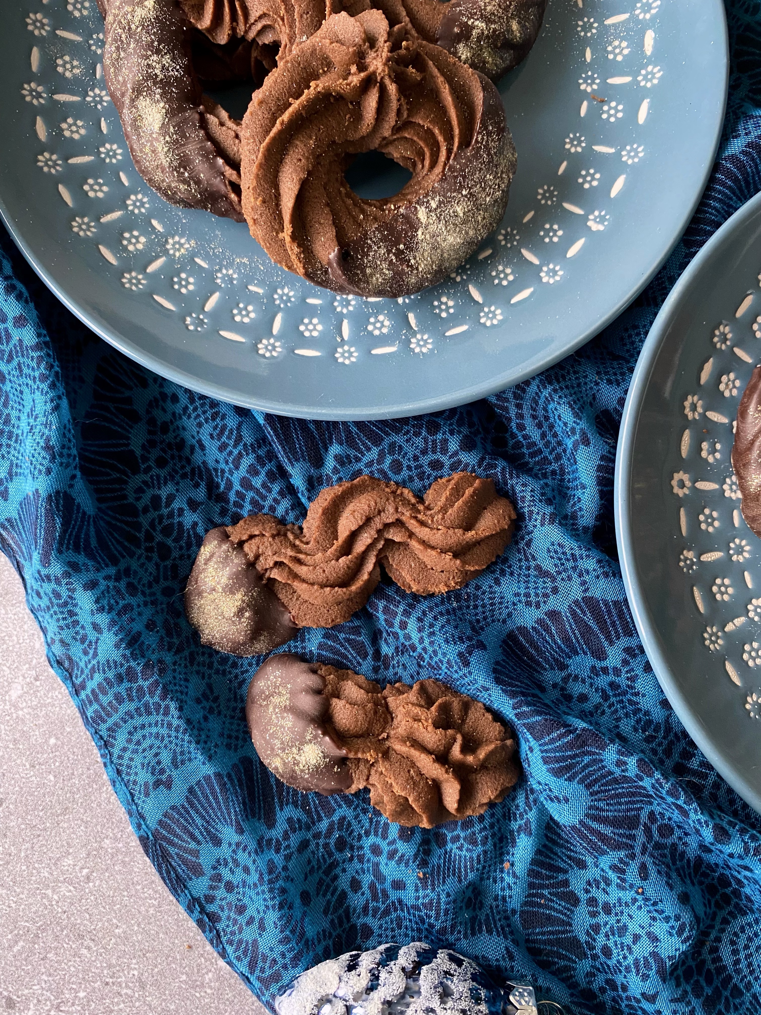 Auf last-minute Suche nach schnellen, einfachen und auffälligen Weihnachtsplätzchen? Dann ist dieses Schoko-Spritzgebäck genau das Richtige! Die Schoko-Kringel haben je nach Rezeptvariante eine zarte oder knusprig mürbe Textur und schmecken unheimlich lecker. Mit Schokoguss und essbarem Goldstaub sehen sie zudem richtig festlich aus. Und das Beste daran: Es gibt keine Kühlzeit des Teigs, kein Ausrollen und kein Kneten. Stattdessen wird der Teig einfach mit einem elektrischen Rührgerät zubereitet, in einen Spritzbeutel gefüllt und kunstvoll auf das Backblech gespritzt. Bei mir als Kringel, andere Formen funktionieren natürlich genauso gut. Der Teig bleibt beim Backen sehr gut in Form, und die Küche duftet himmlisch nach frisch gebackenen Keksen!