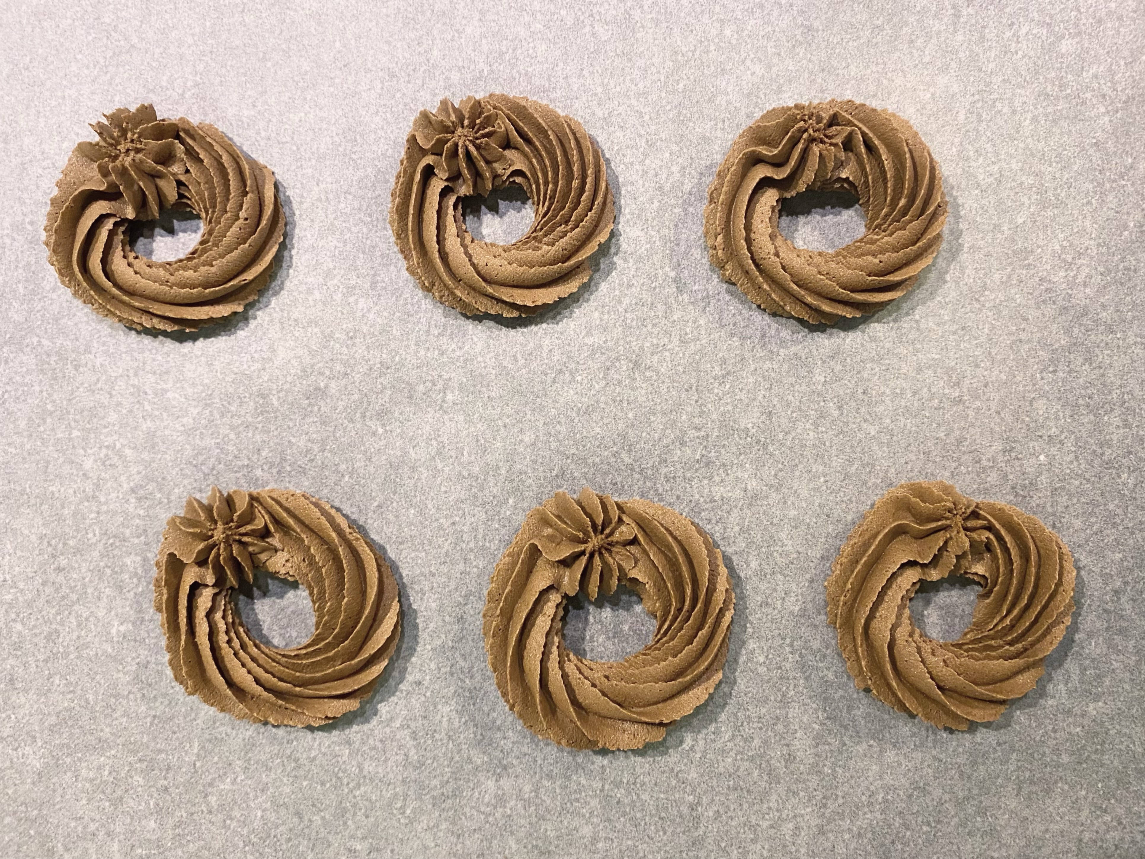 - Den Teig in einen Spritzbeutel mit Sterntülle füllen und mit etwas Abstand zueinander Kringel (oder andere Formen) auf das Backpapier spritzen.