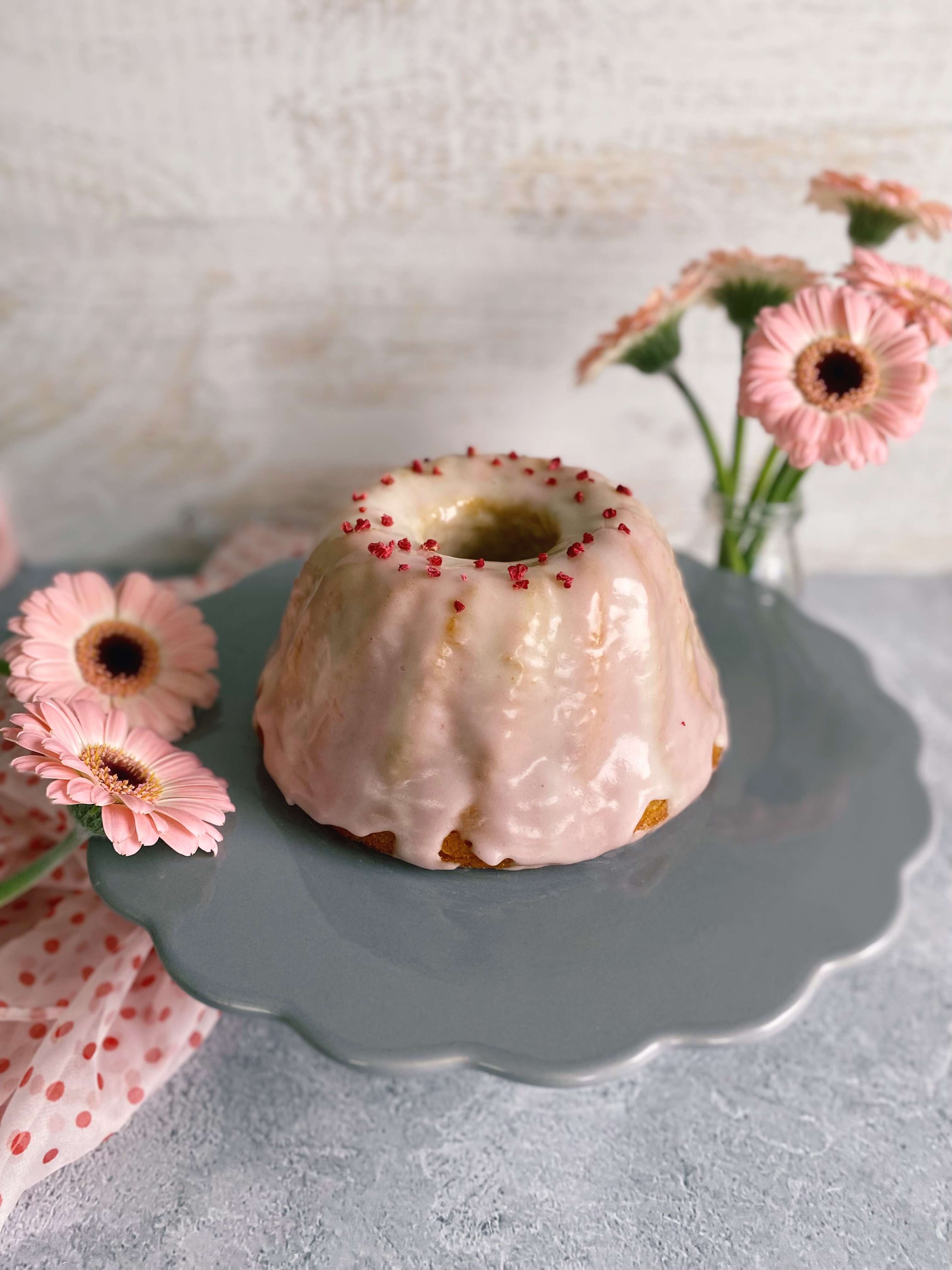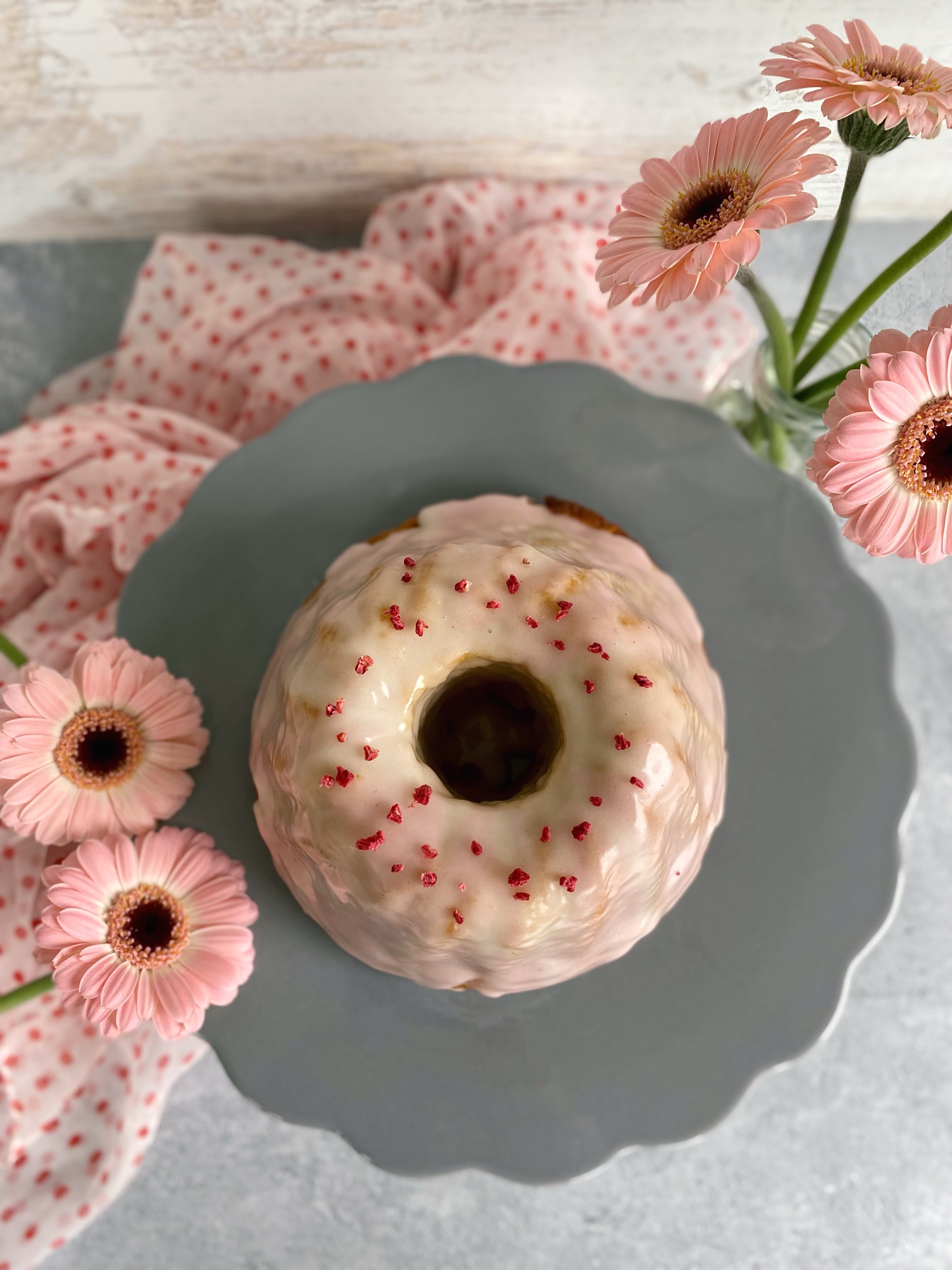 - Den Zuckerguss gleichmäßig über den Kuchen gießen, glatt streichen und mit einigen gefriergetrockneten Himbeerstückchen verzieren.