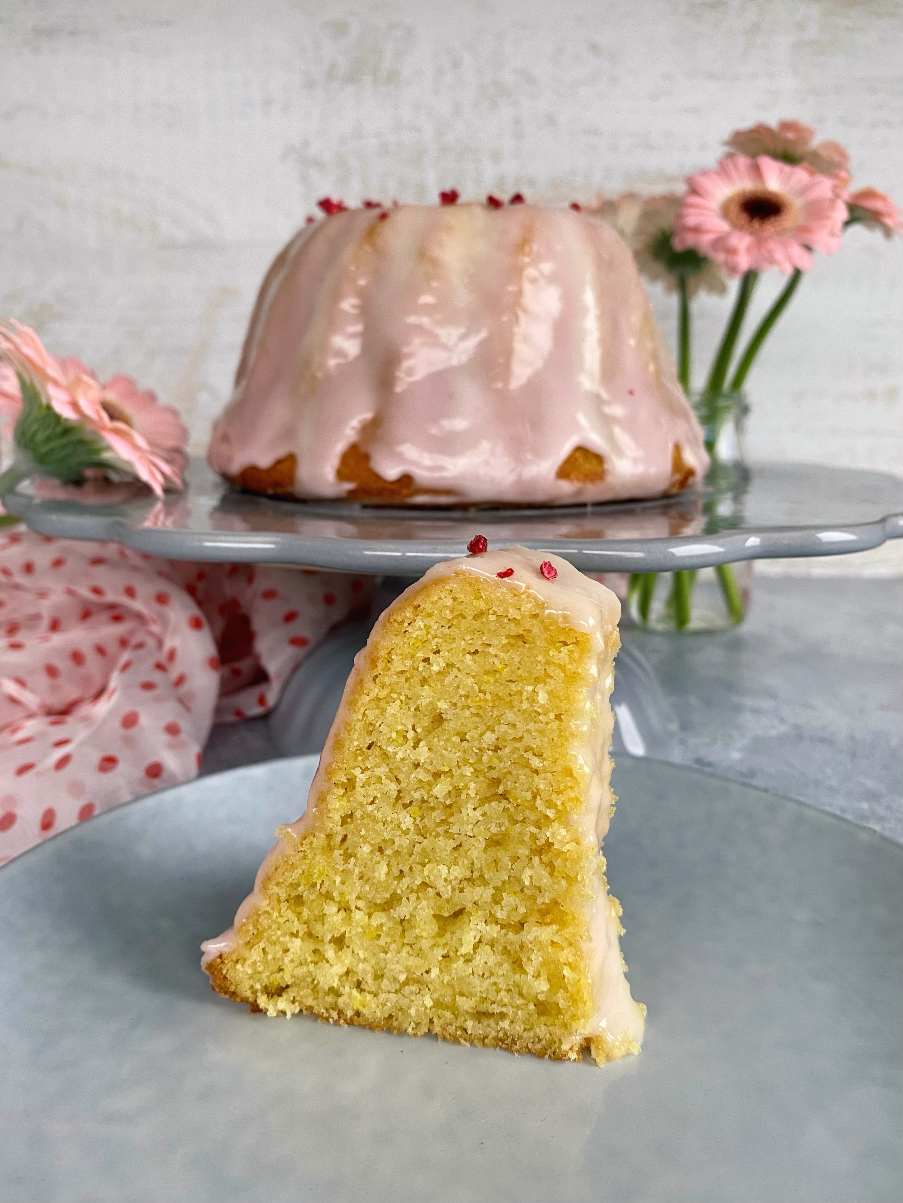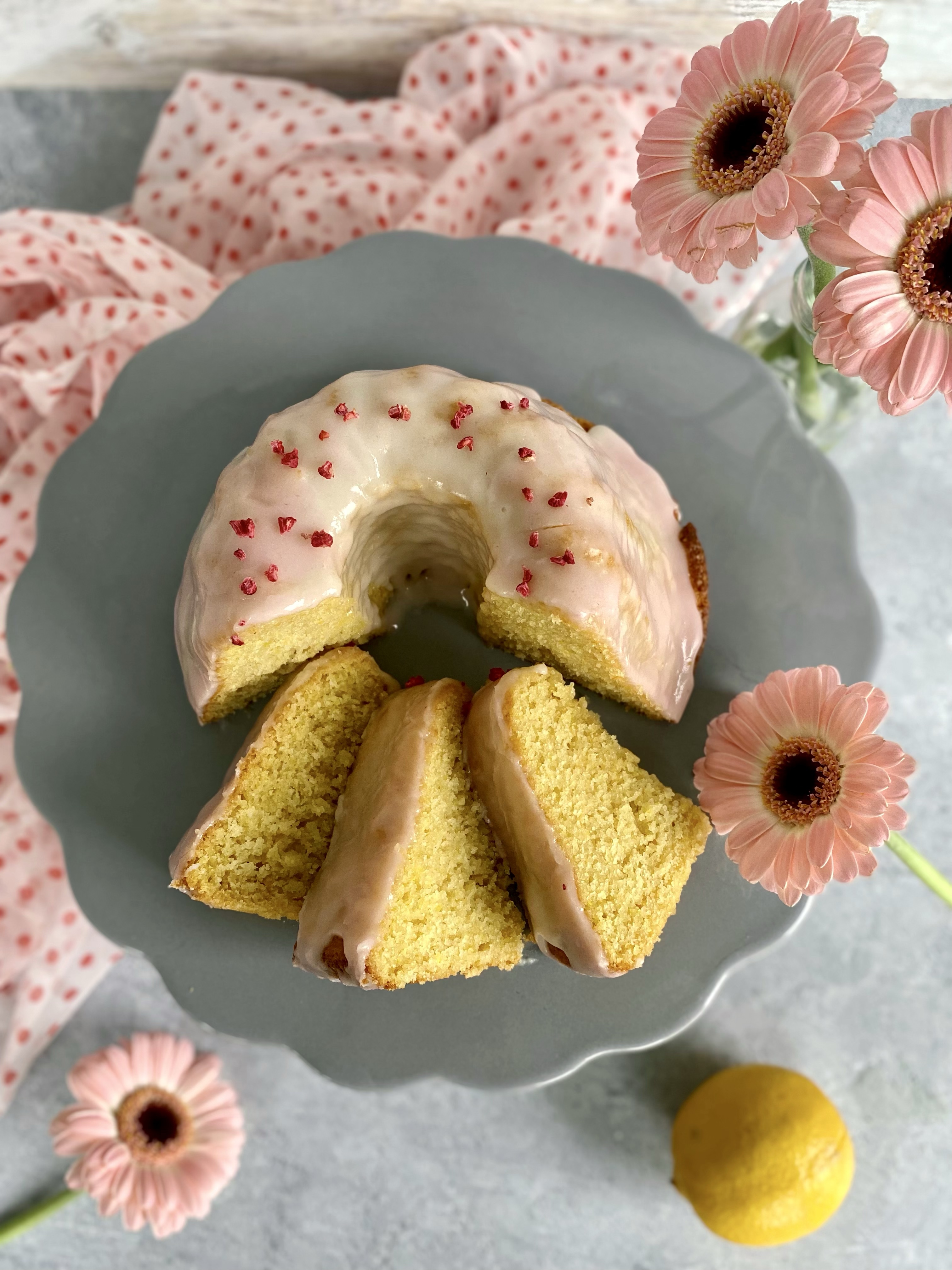 Zitronenkuchen mag einfach jeder, oder? „Das Rezept nicht mehr verändern!“ meinte meine liebe Testesserin Olja zu mir, weil sie ihn so lecker fand. Der Kuchen ist saftig, hat eine fluffige, feinporige Textur und hält auch ohne Ei perfekt zusammen. Mit seiner leuchtend gelben Farbe und dem weiß-rosa Zuckerguss ist er zudem ein hübscher Hingucker auf der Kaffeetafel.