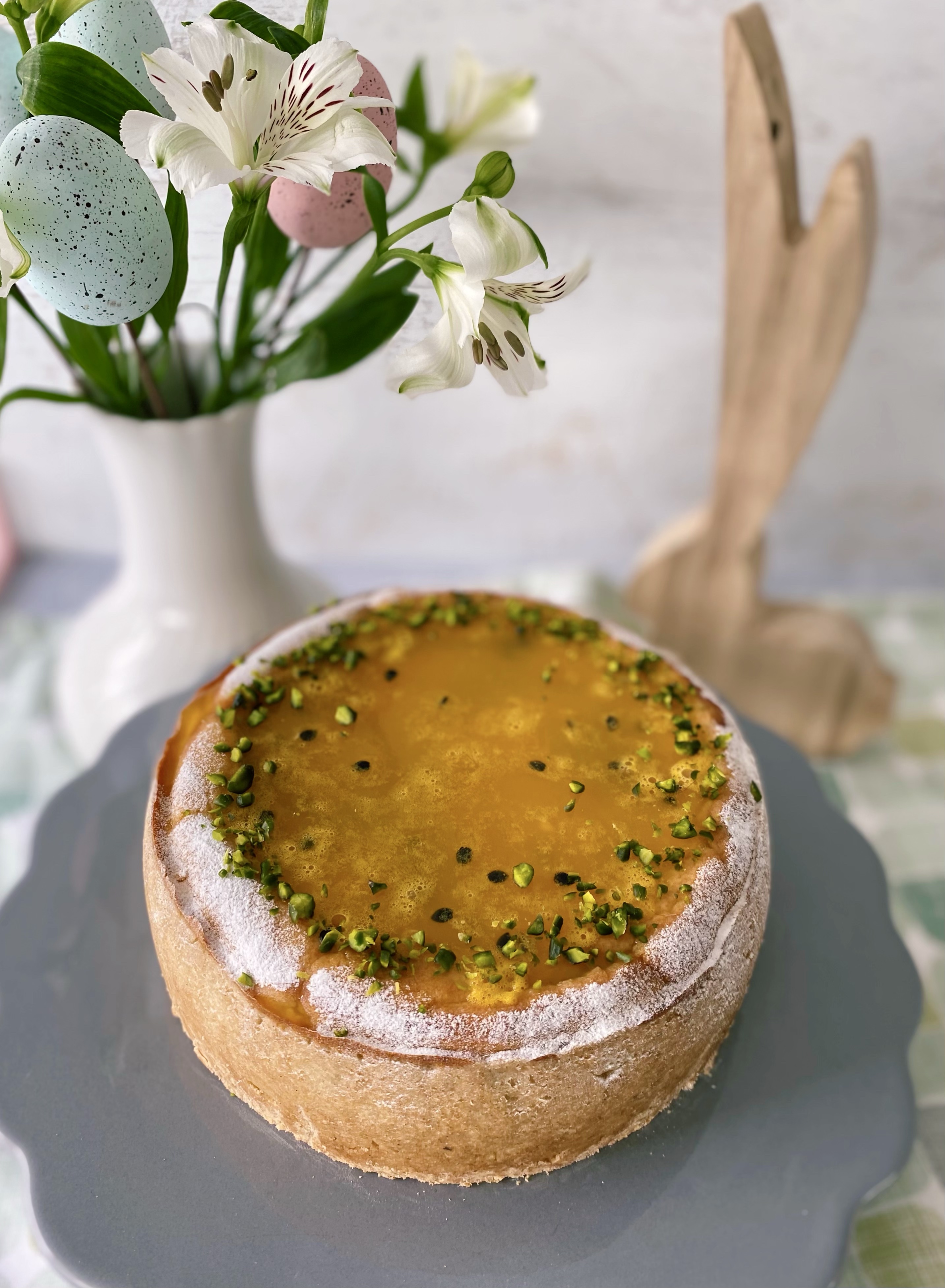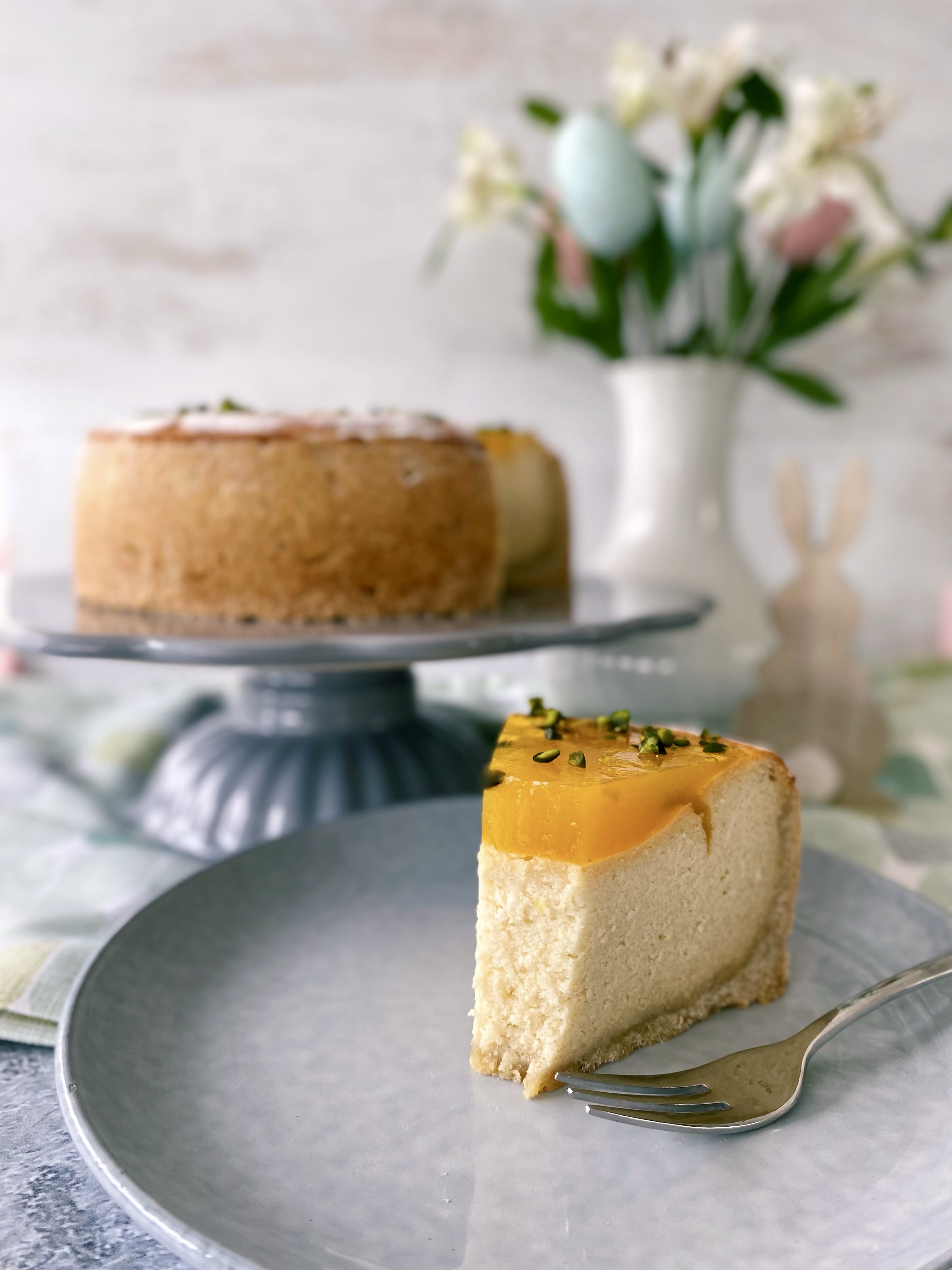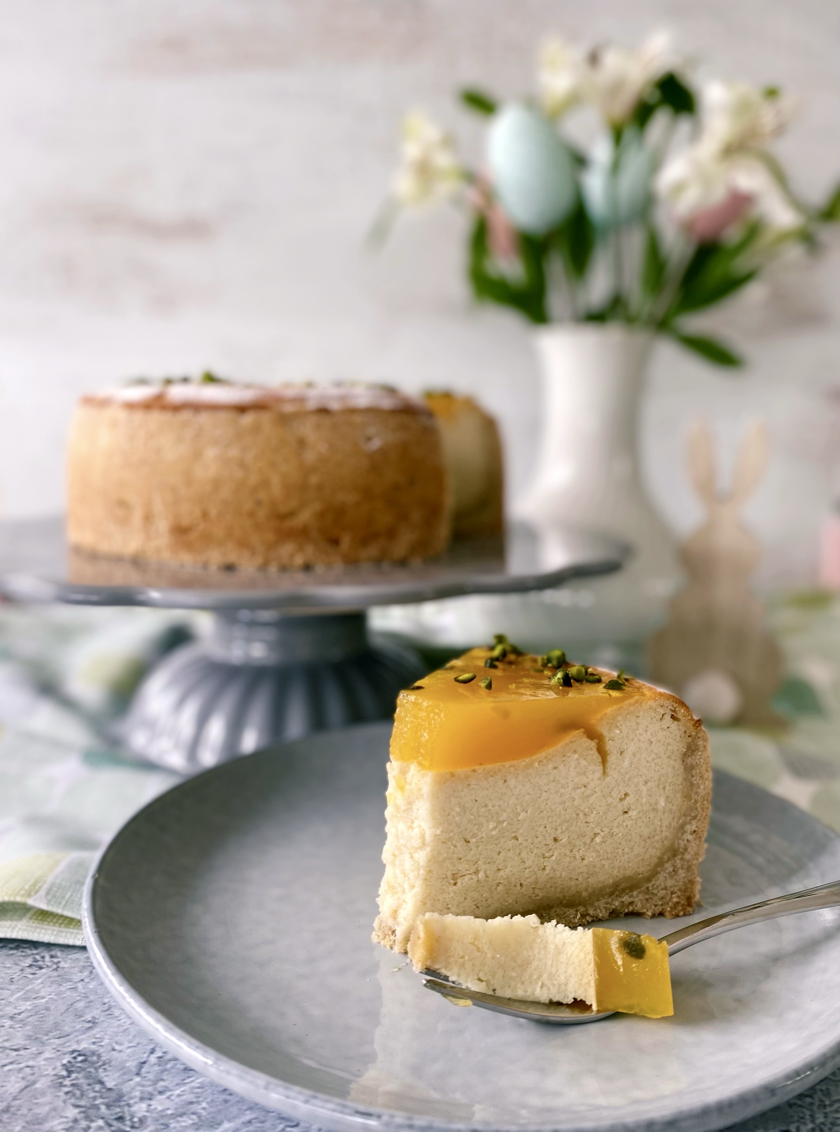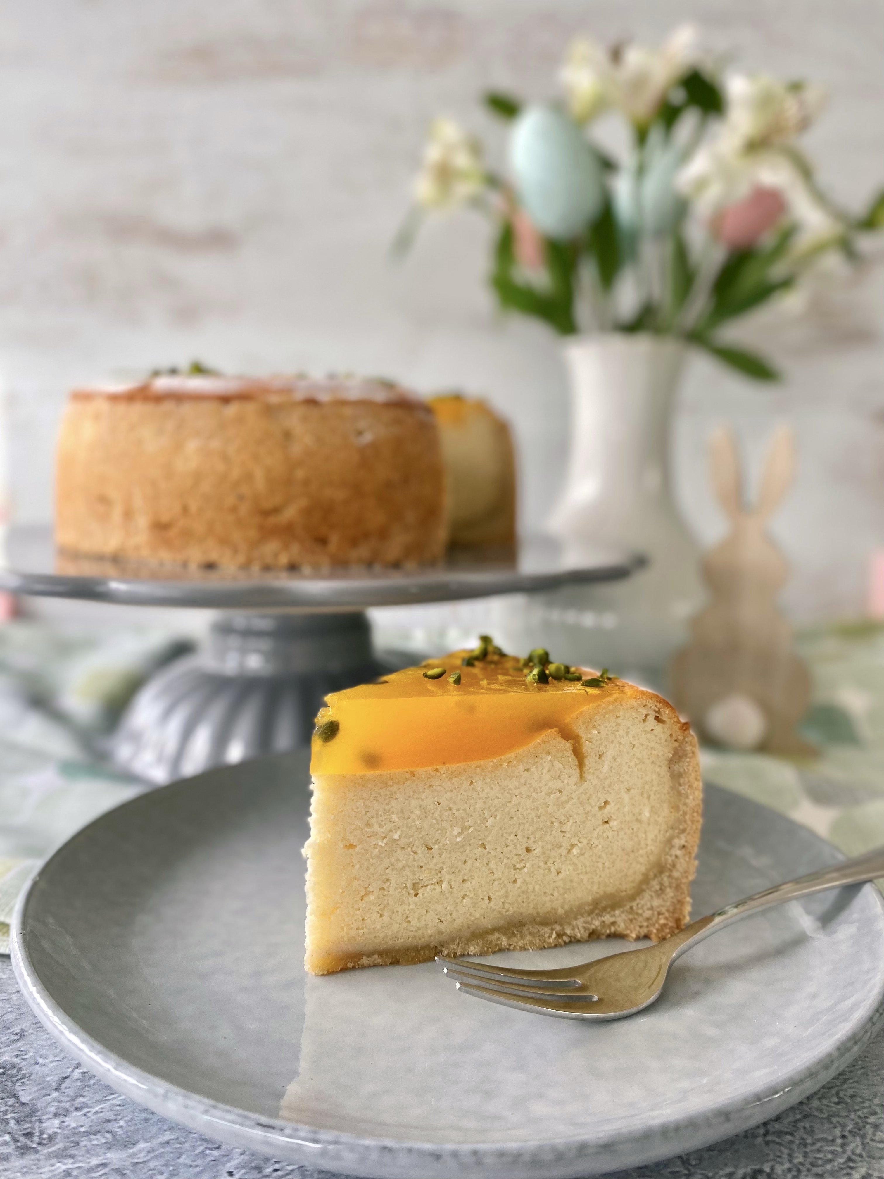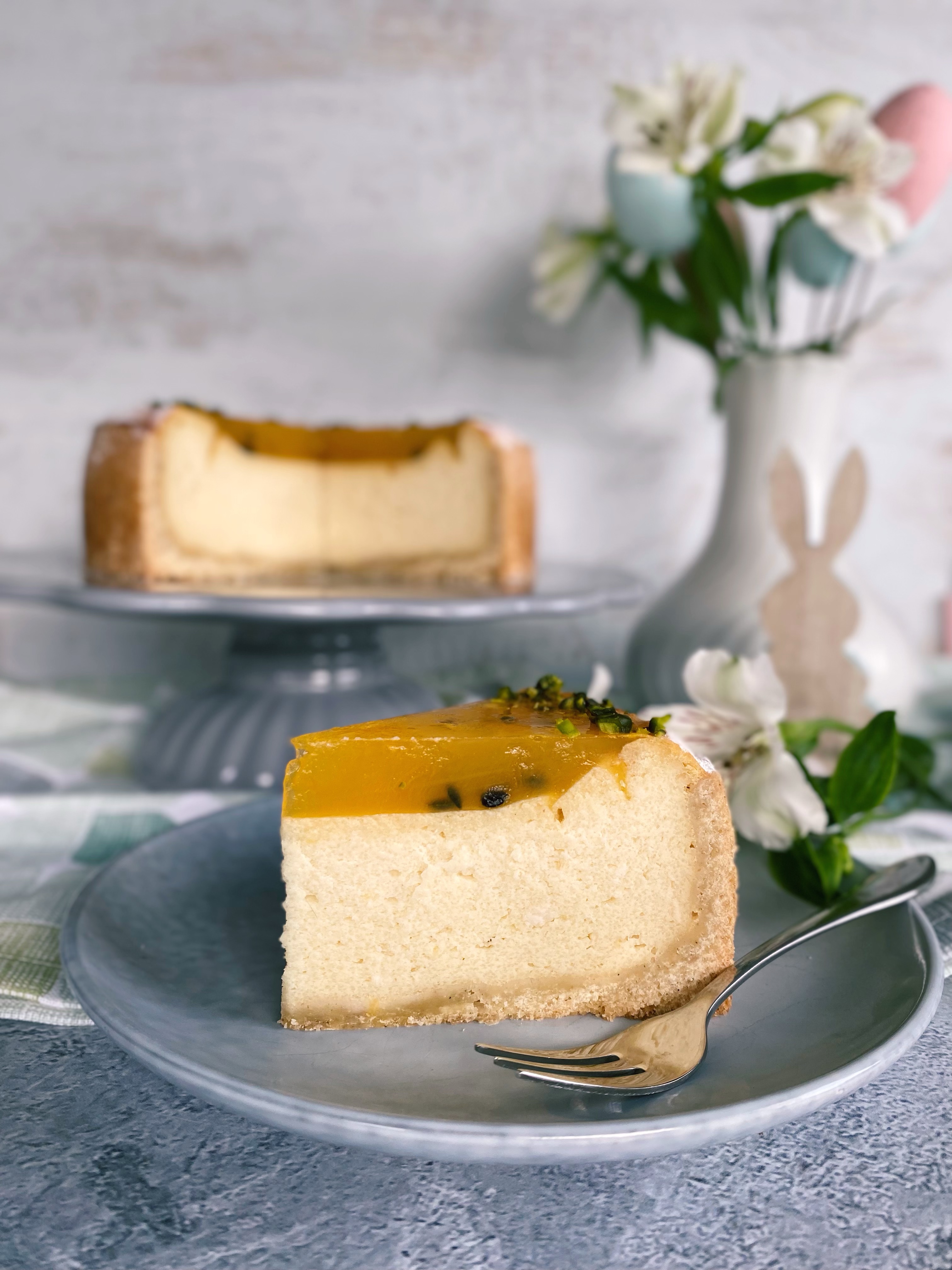 Herrlich cremiger Käsekuchen mit Marzipan und erfrischendem Passionsfruchtspiegel. Mit der Garnitur aus gehackten Pistazien ist er eine tolle Bereicherung für die festliche Ostertafel.