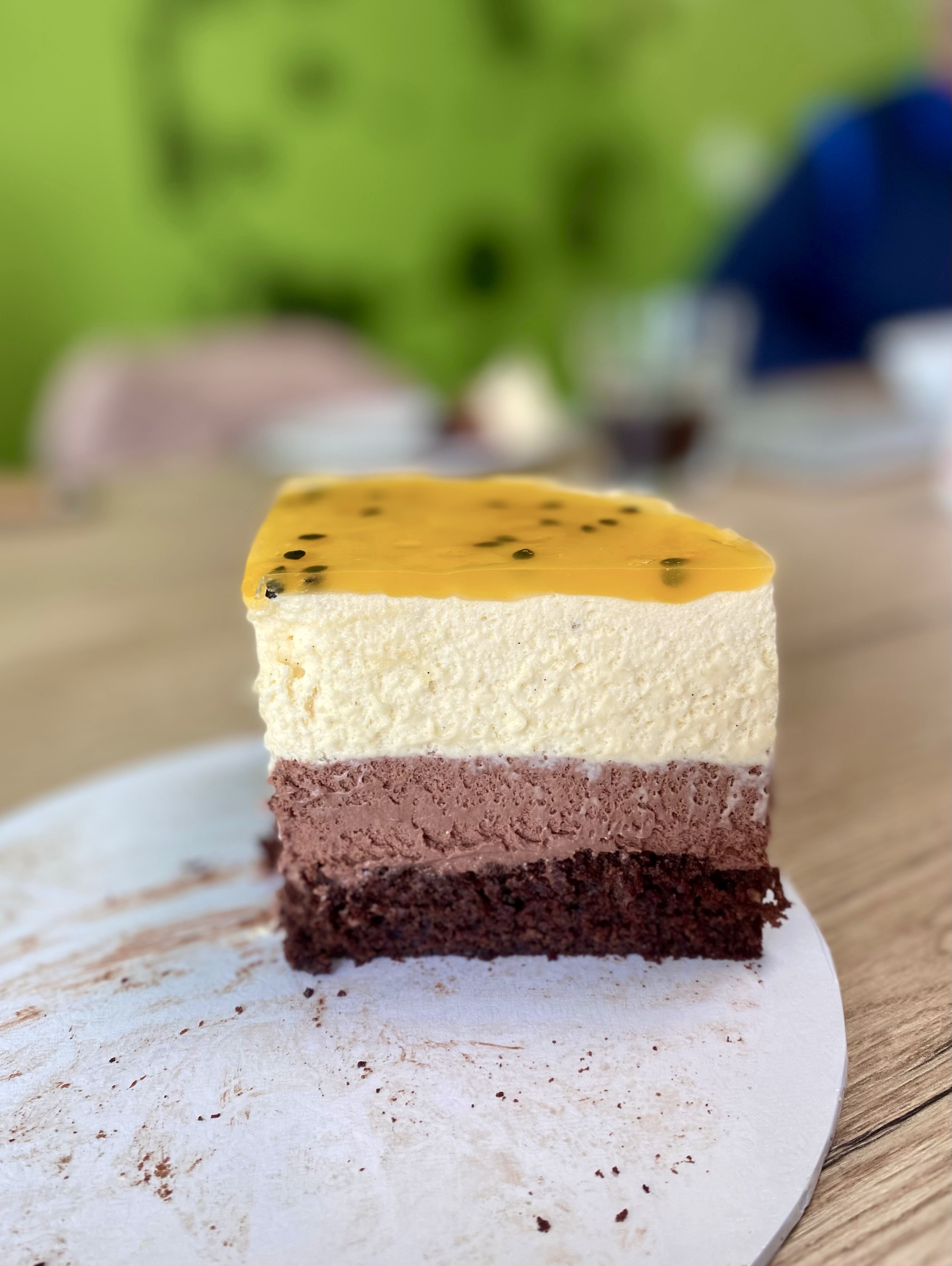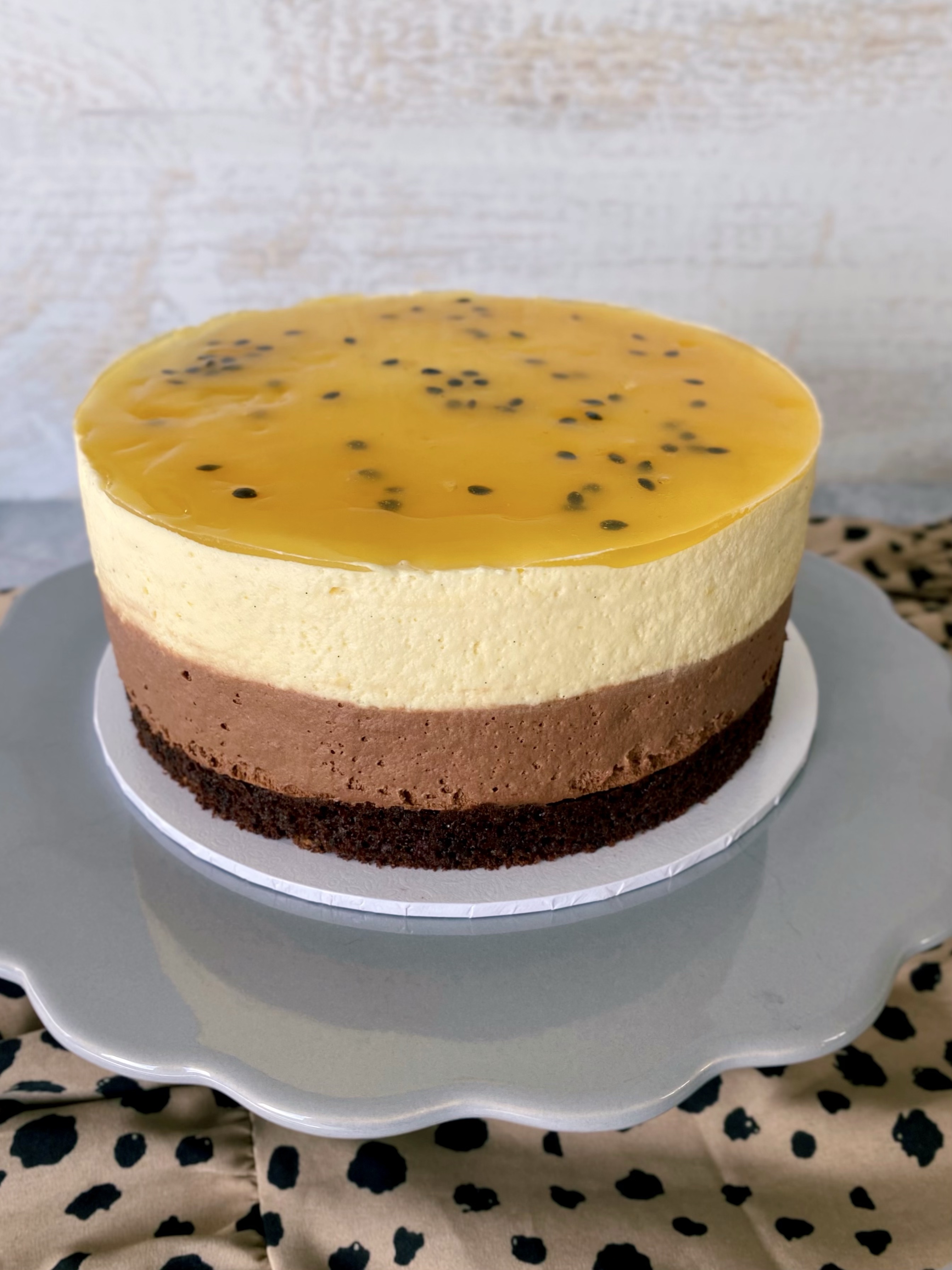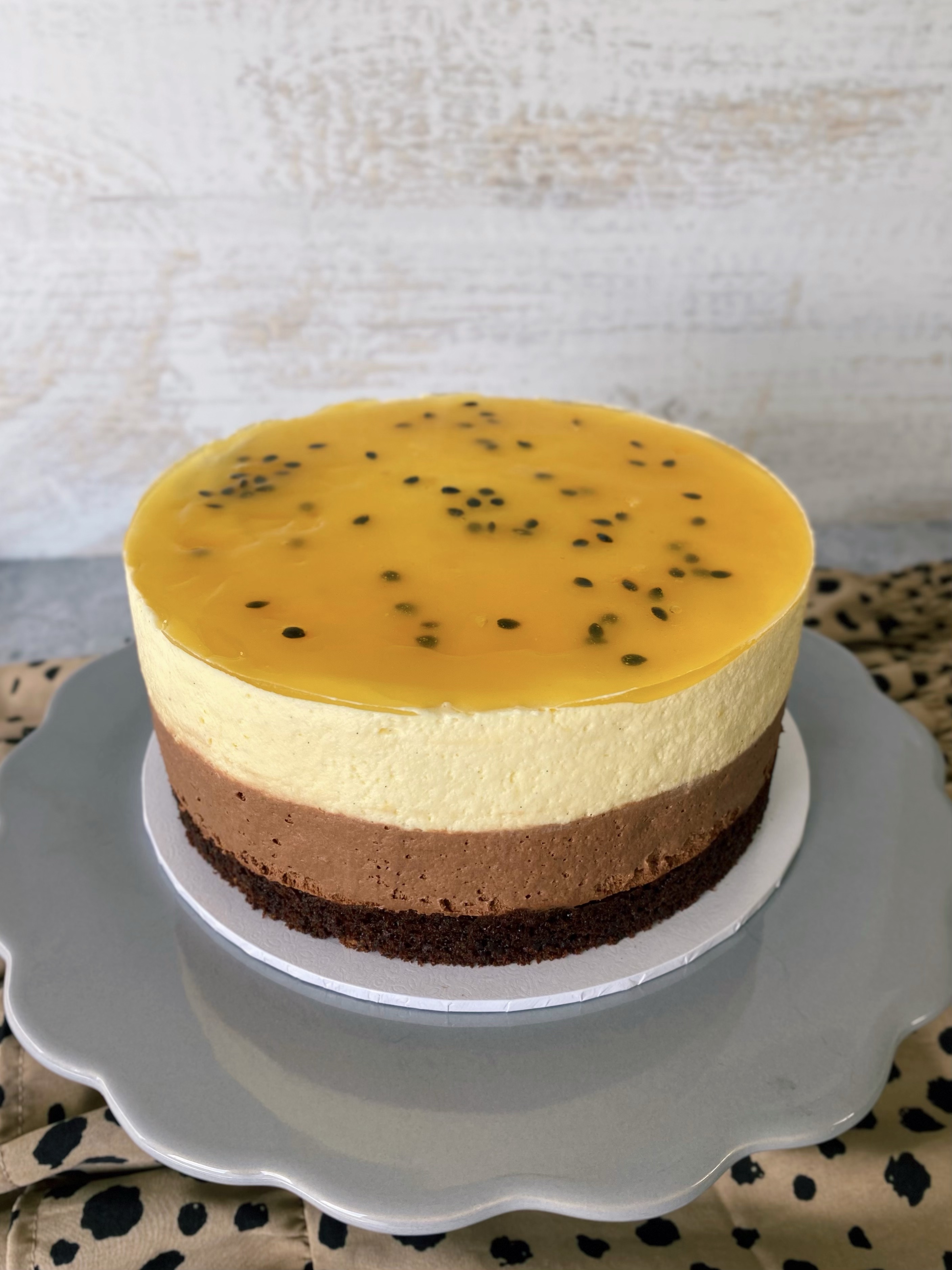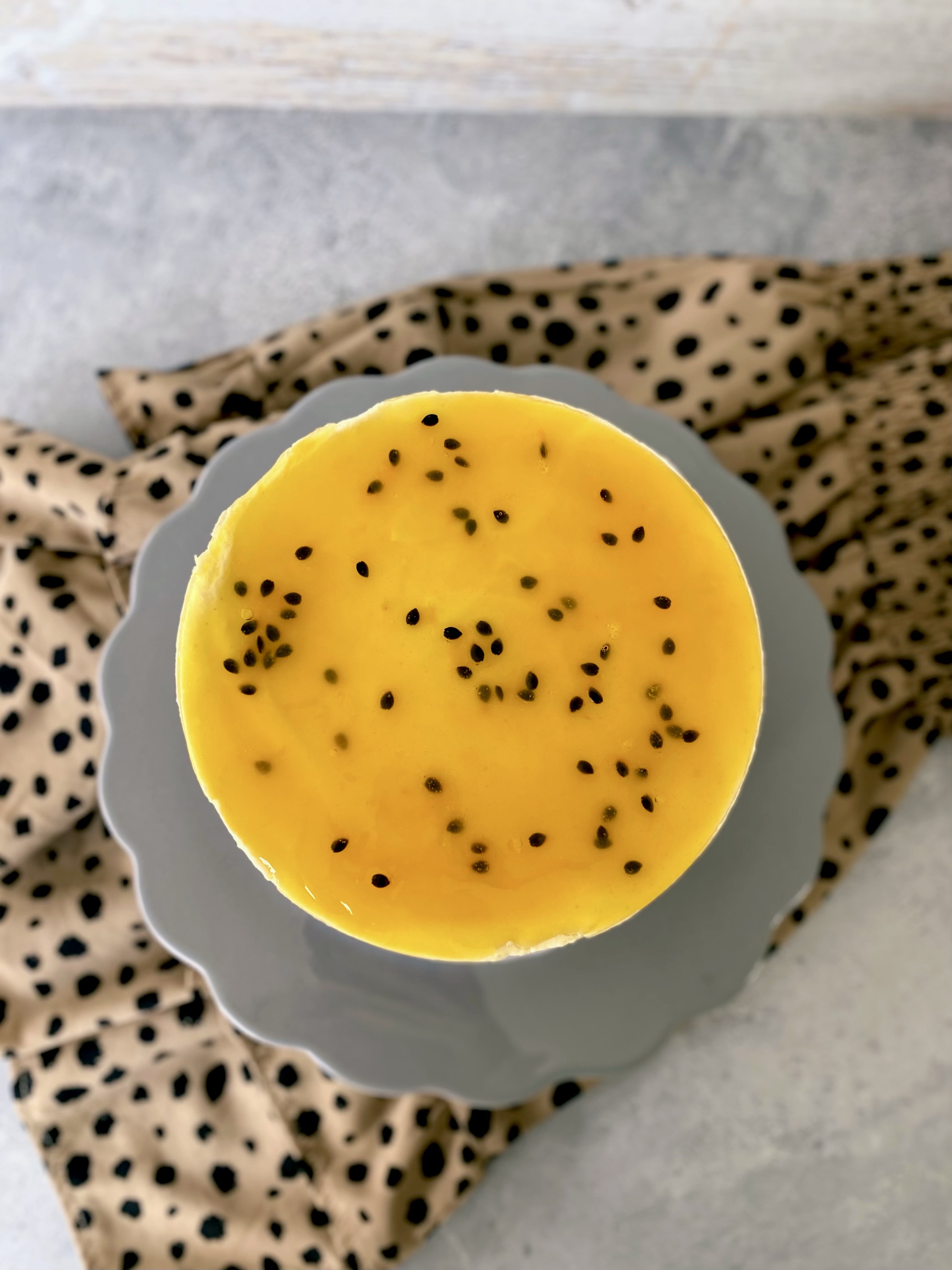 4. Passionsfruchtspiegel Den Abschluss bildet ein leuchtend orangefarbener Passionsfruchtspiegel, der die übrigen Schichten mit seiner exotischen Frische wunderbar ergänzt.