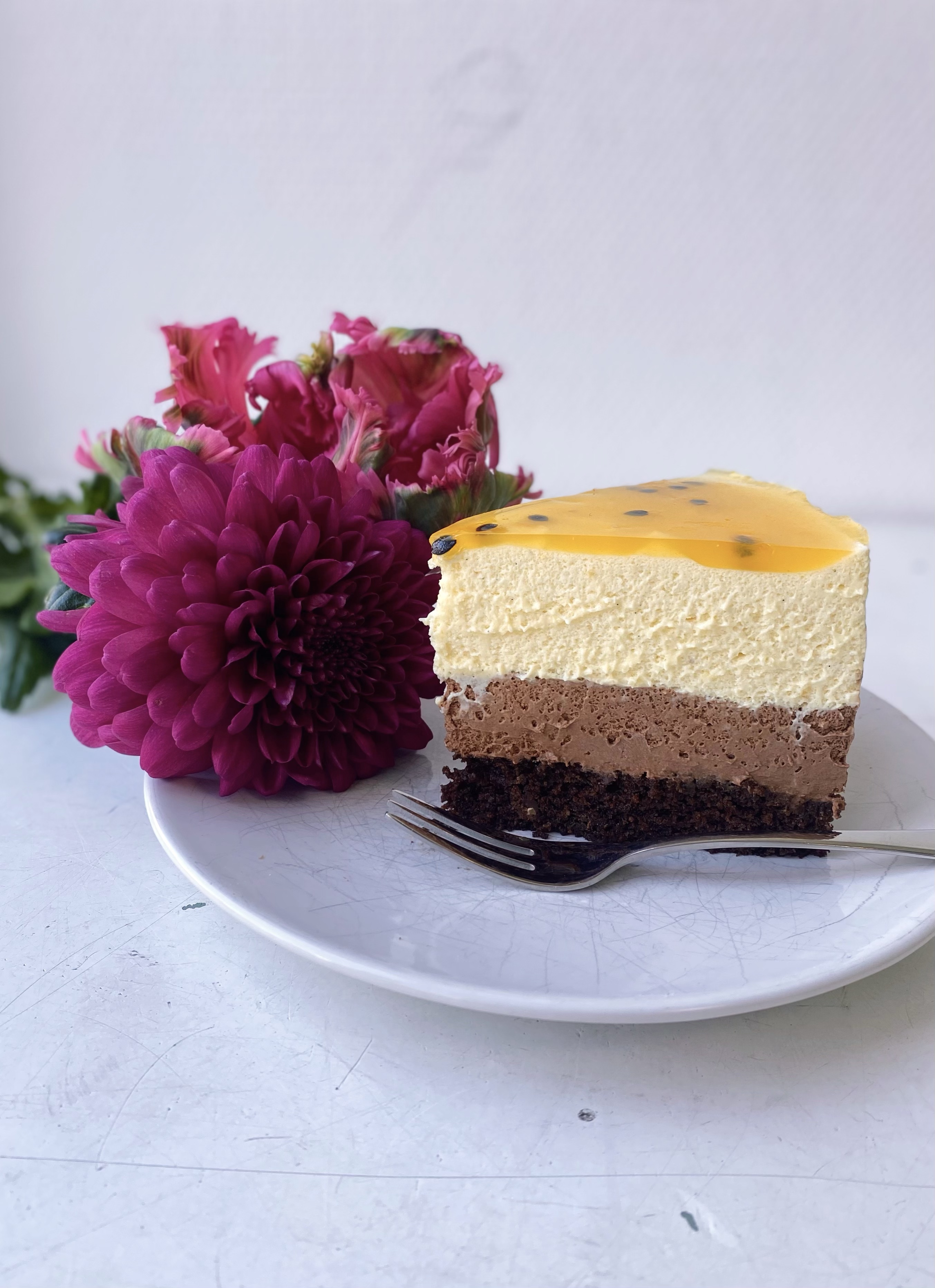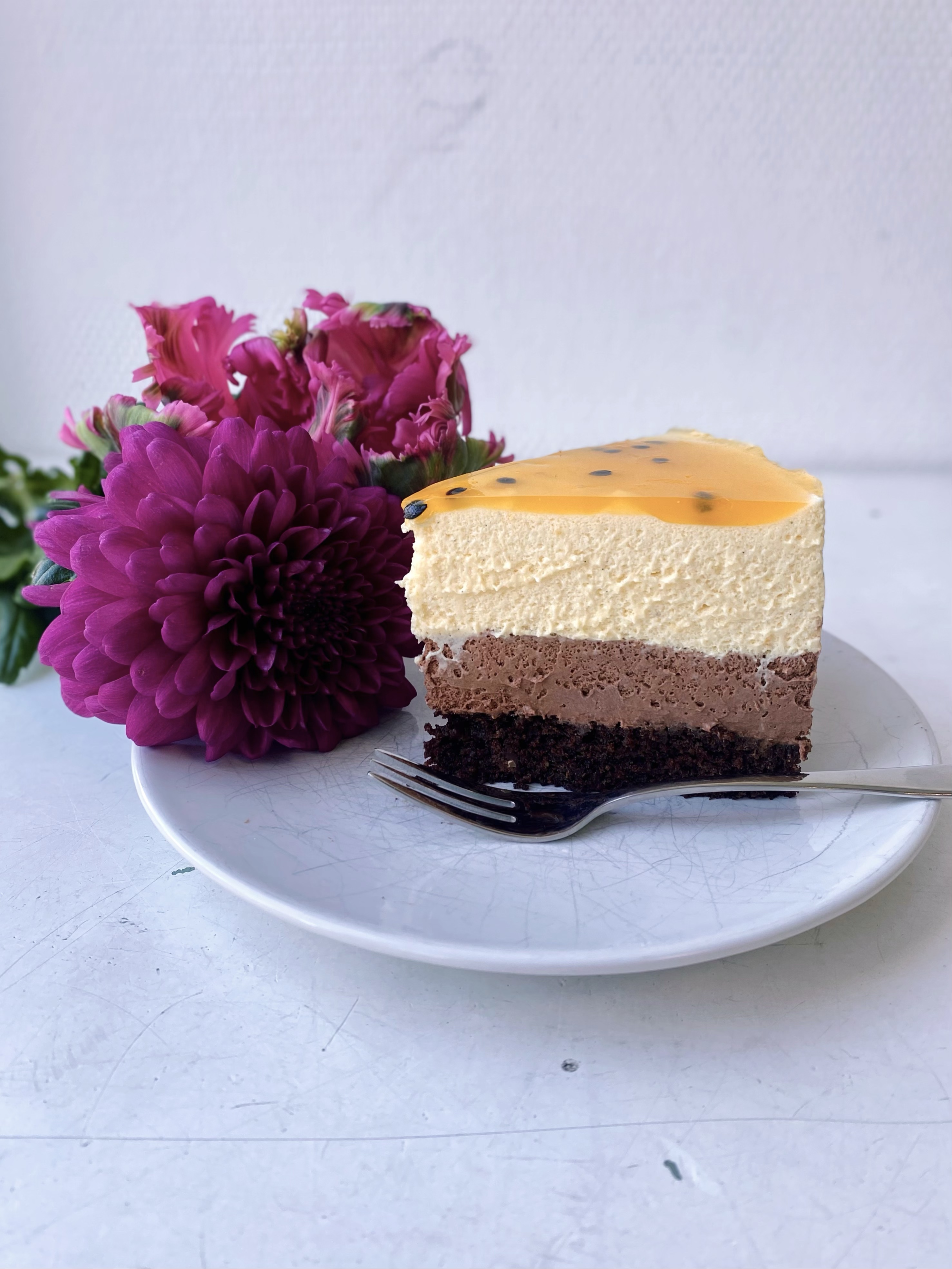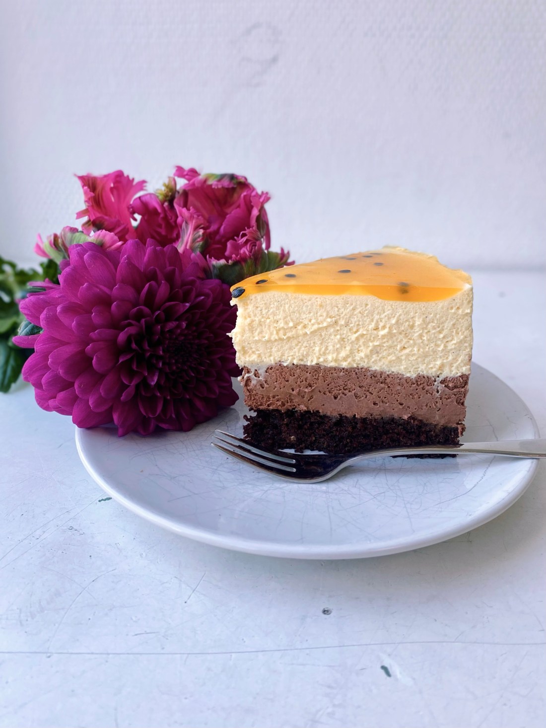 3. Passionsfrucht-Mousse Die dritte Schicht ist eine Passionsfrucht-Mousse, die mit ihrer frischen Note einen raffinierten Kontrast zu den schokoladigen Schichten bildet. Für sich alleine schmeckt sie ziemlich süß, aber in Kombination mit den Schokoschichten ist sie perfekt. Für die Zubereitung sollte purer Saft aus 100 % Passionsfrüchten verwendet werden, denn mit Nektar würde die Mousse zu süß werden.