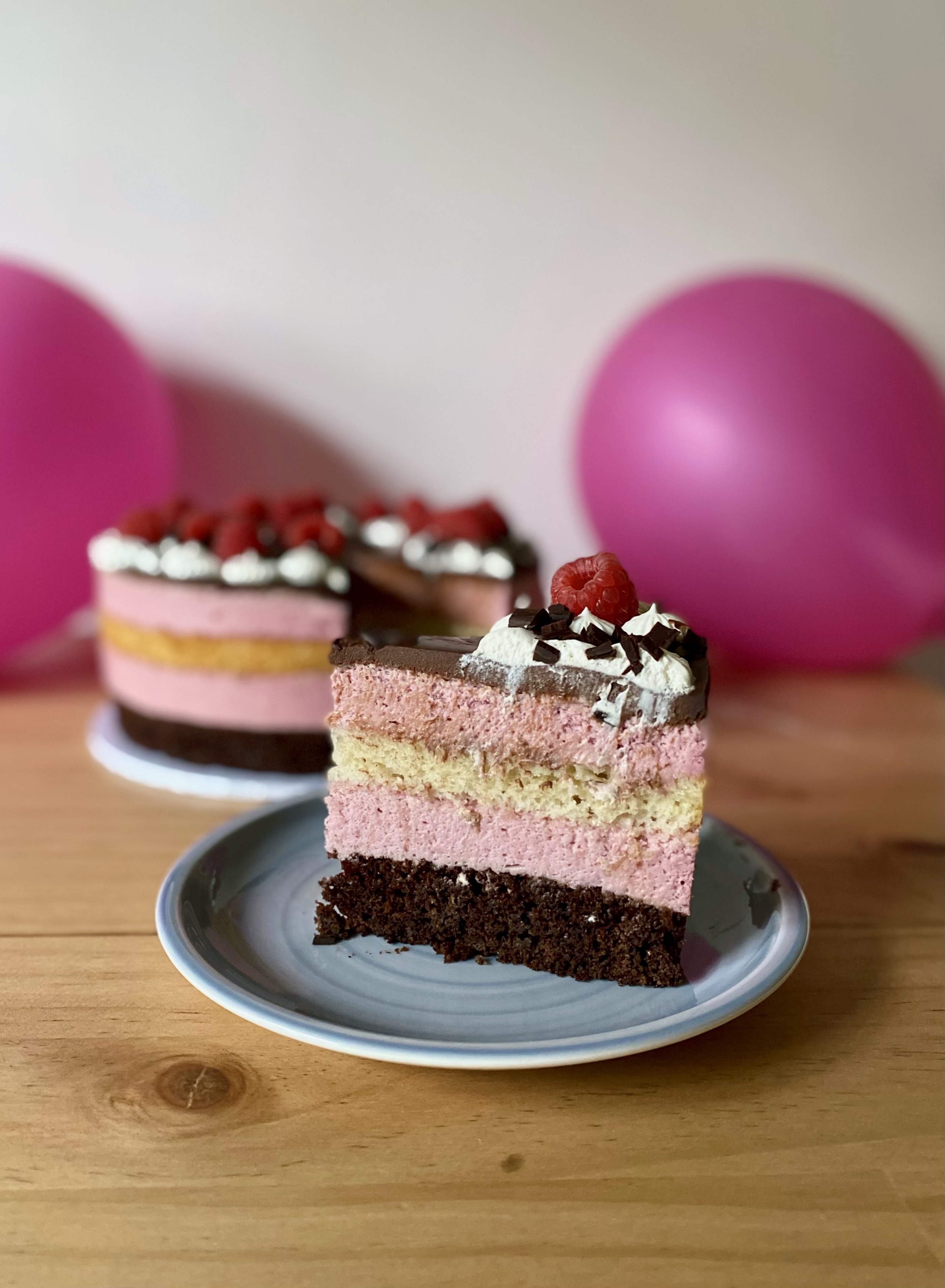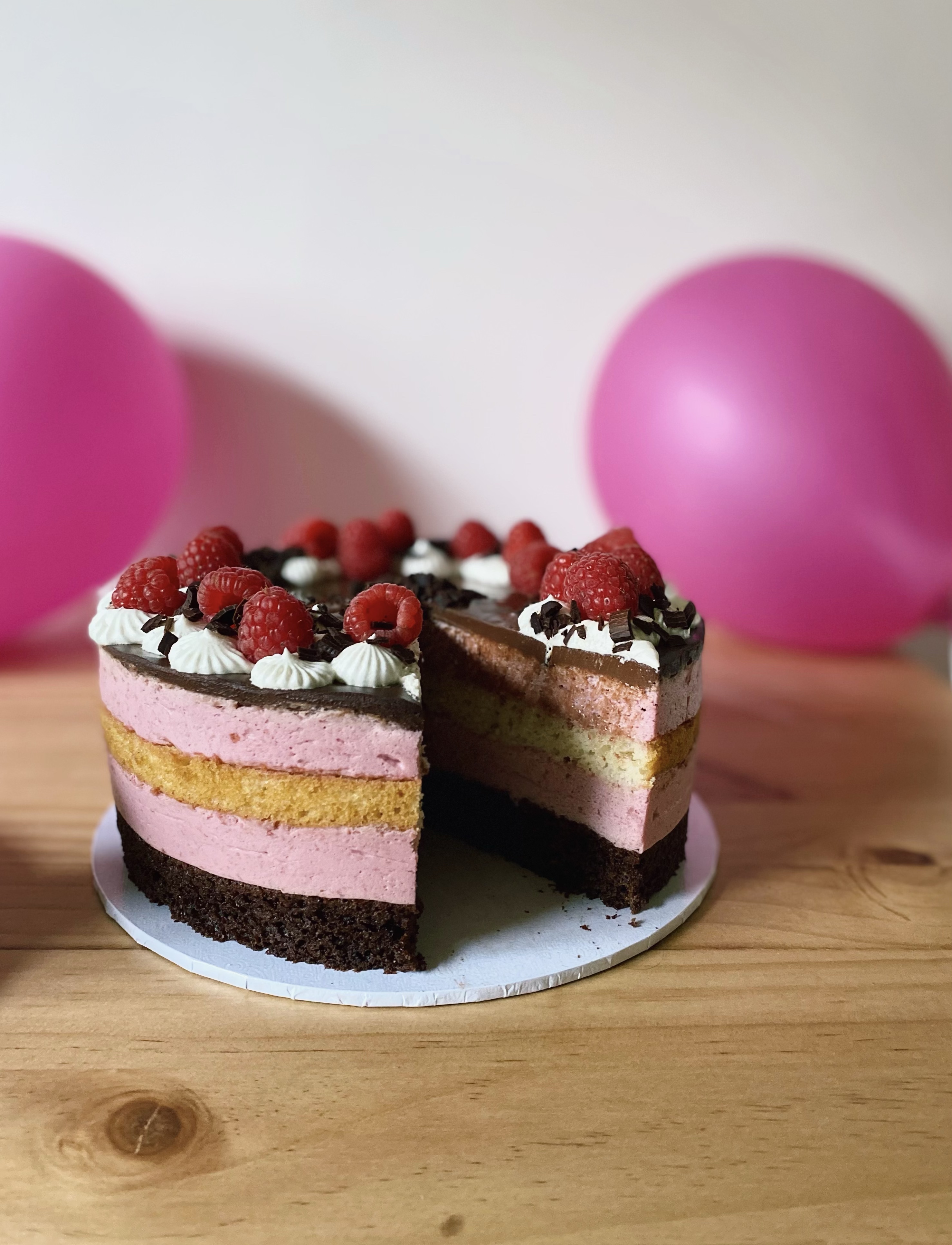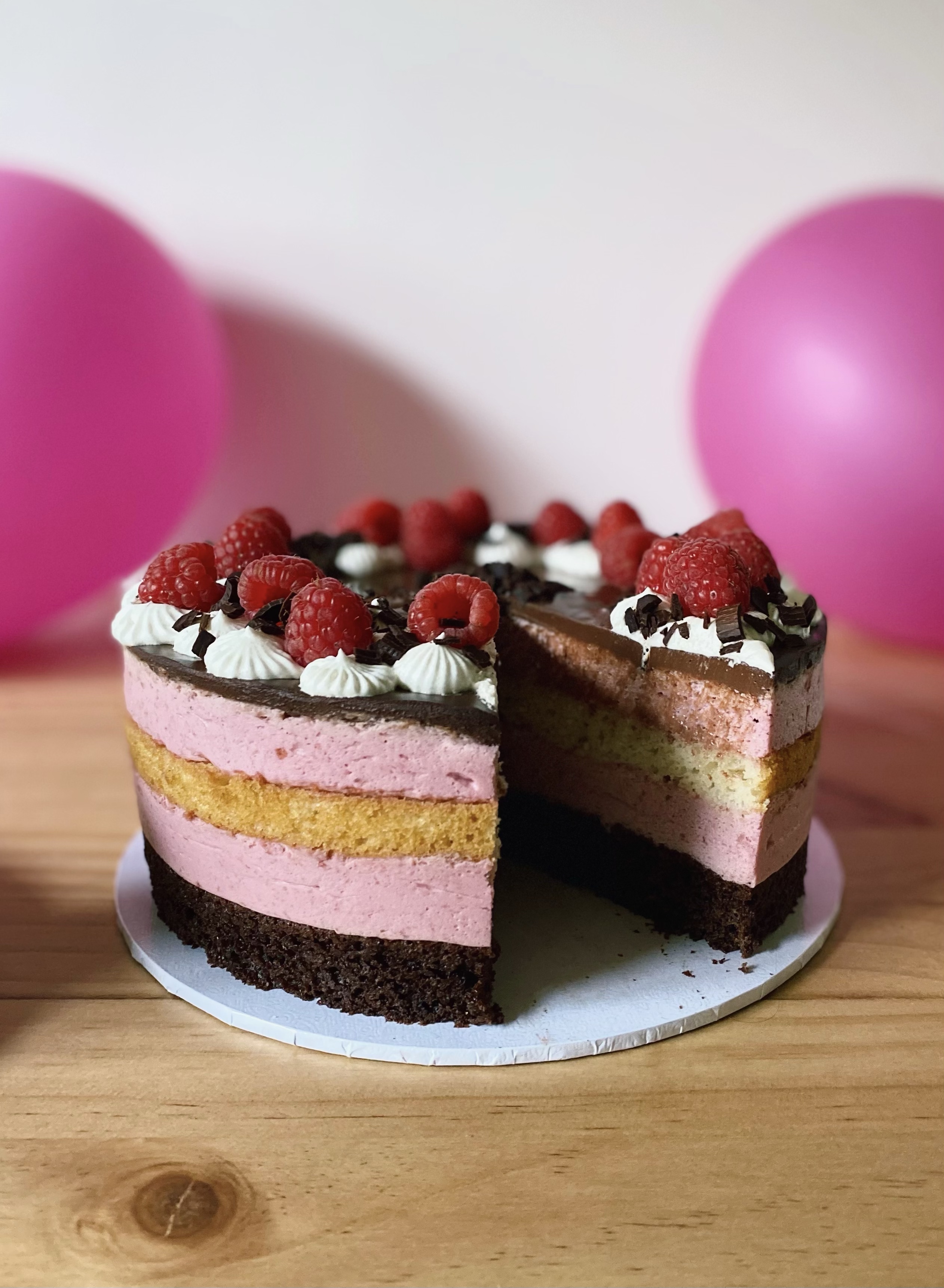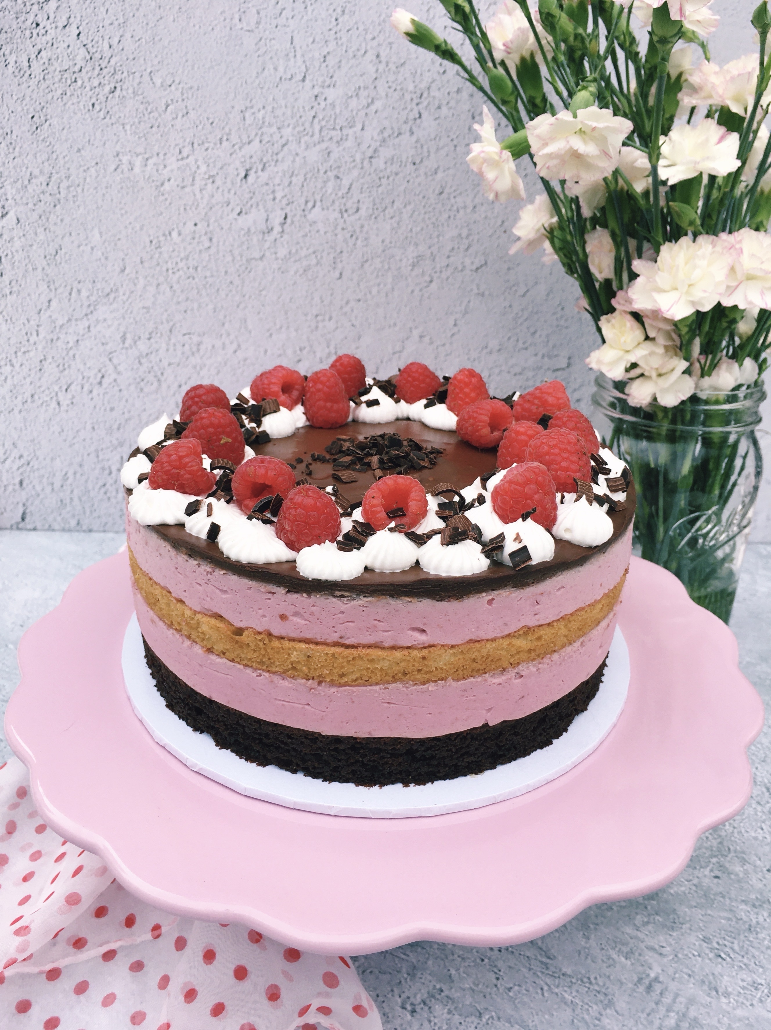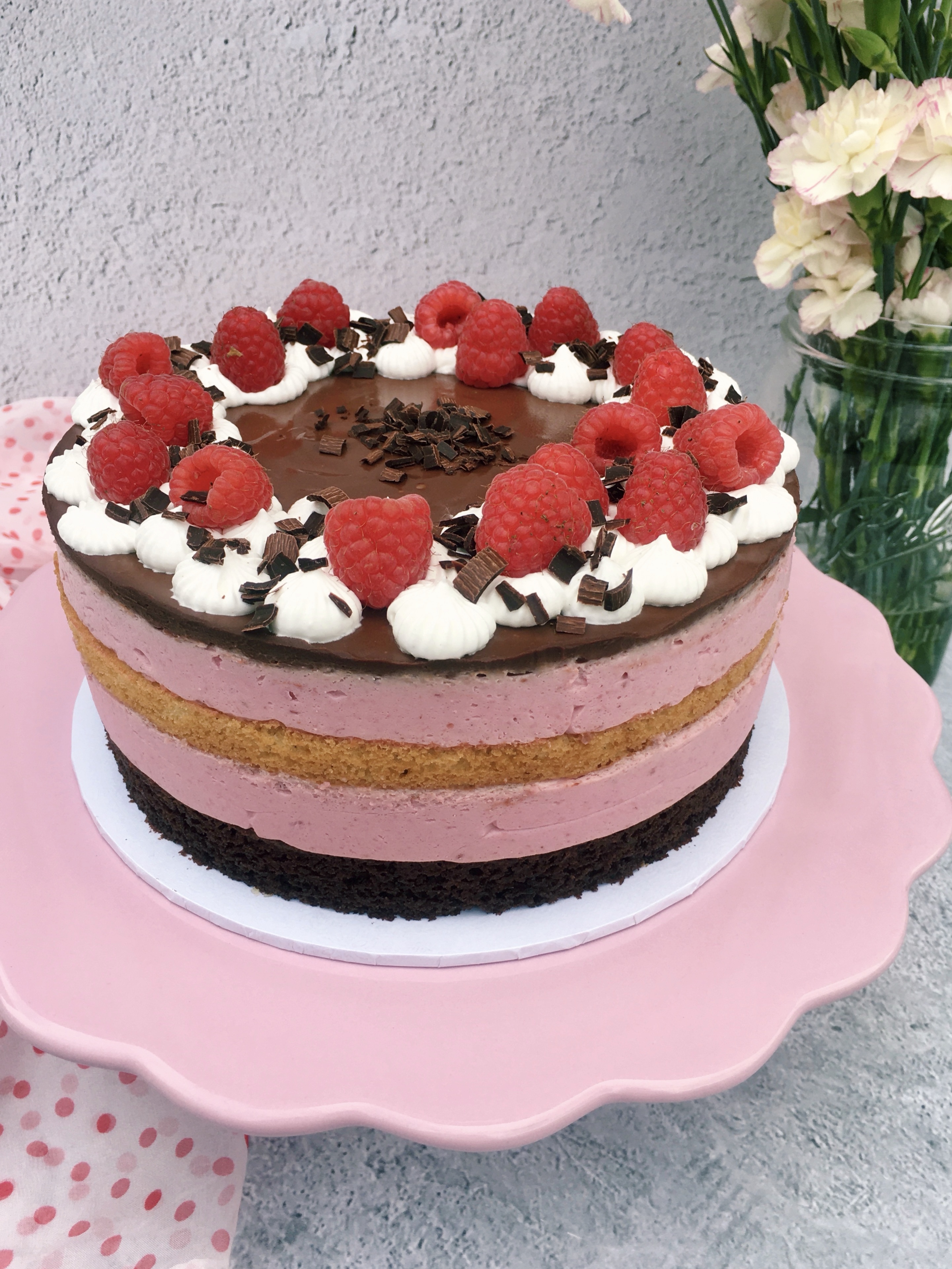 Schokoladiger Rührteig, Vanillebiskuit und luftig-leichte Himbeermousse gekrönt von cremiger Schokoganache, Sahnetuffs und frischen Himbeeren.