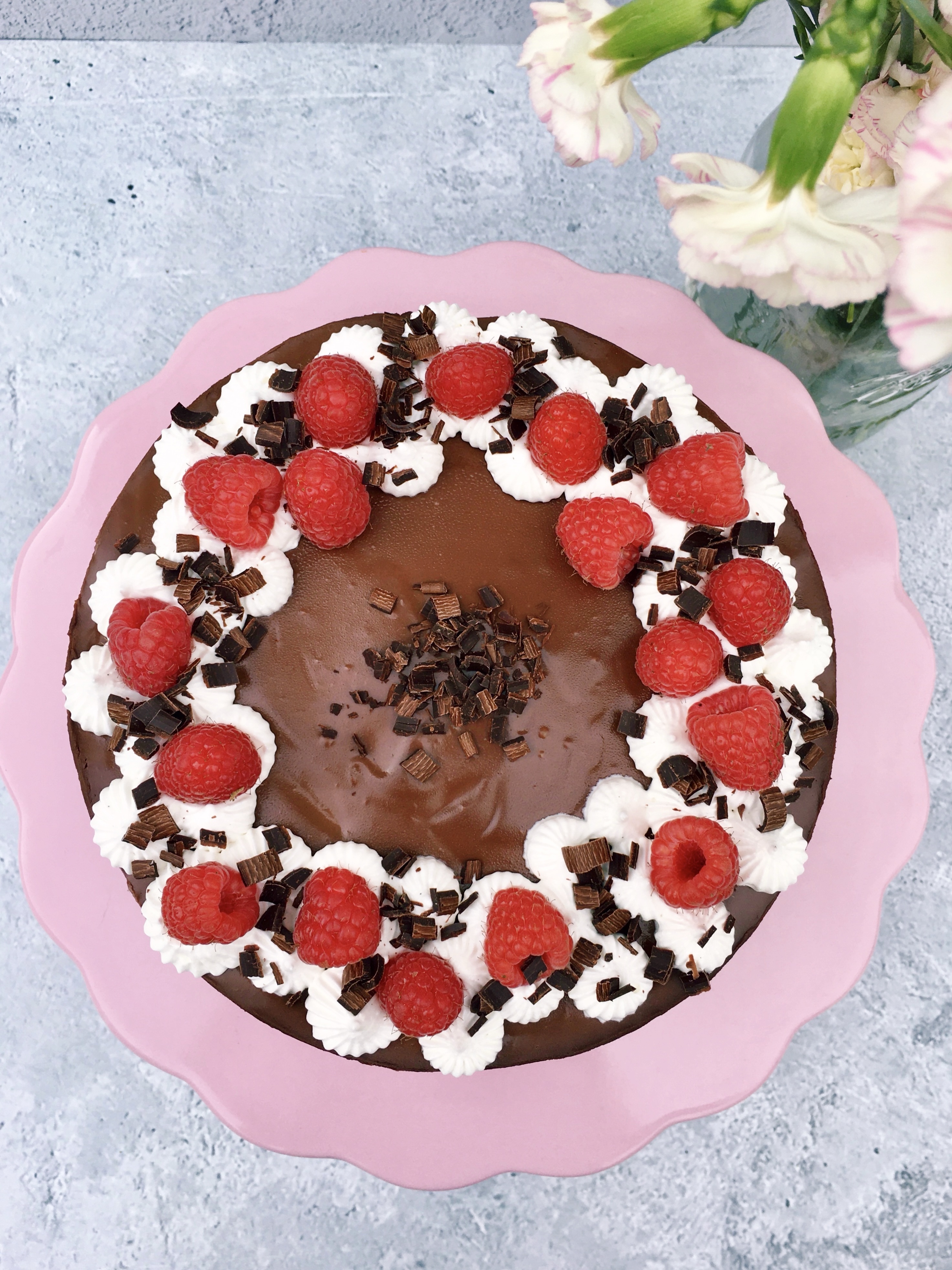 Gekrönt und dekoriert ist die Torte mit einer glänzenden Schokoganache, Sahnetuffs, frischen Himbeeren und Schokospänen. Die Dekoration erinnert ein wenig an eine Schwarzwälder Kirschtorte, nur mit Himbeeren anstelle von Kirschen.