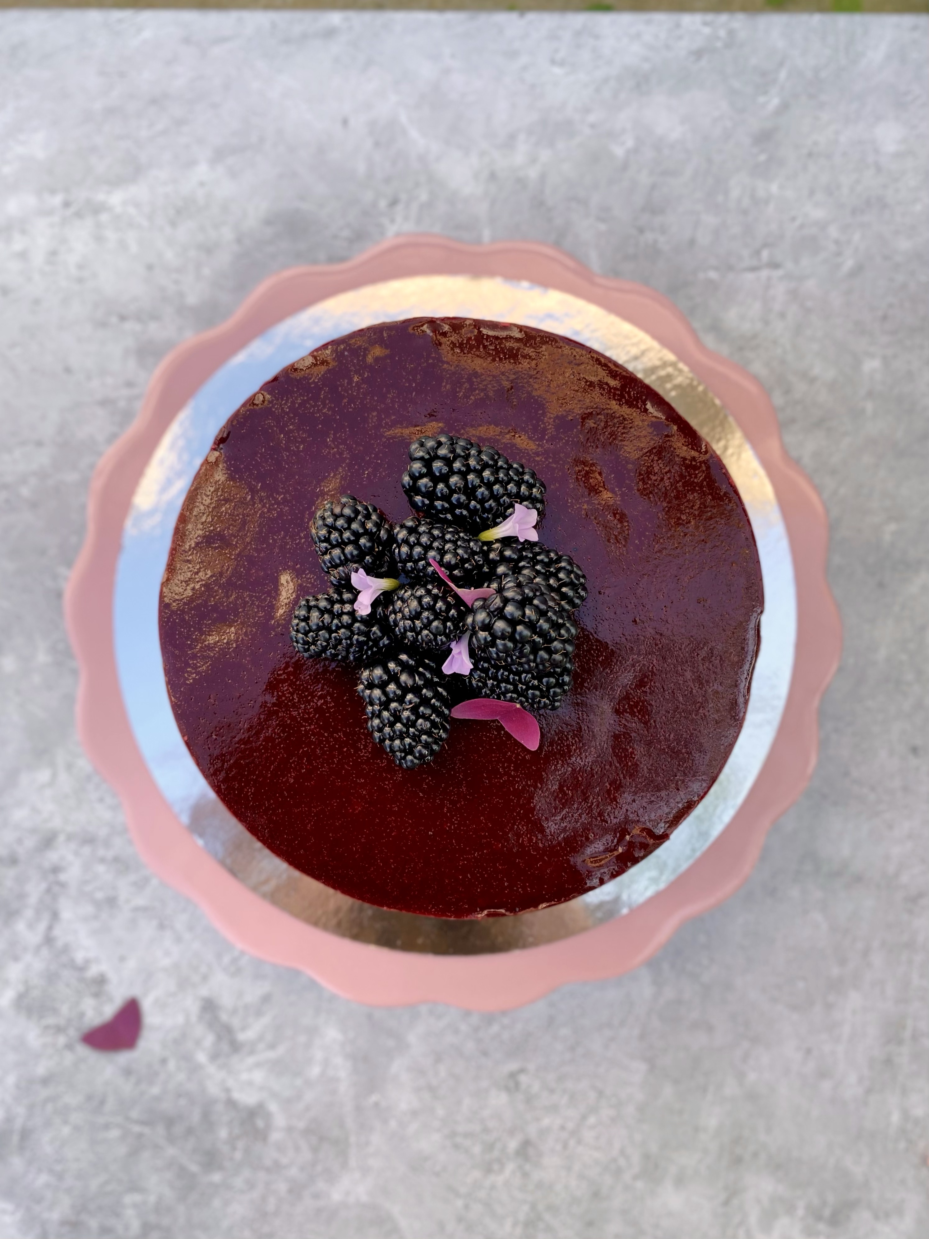 2. Zet de taart koud en garneer vlak voor het serveren met bramen en eventueel eetbare bloemen.