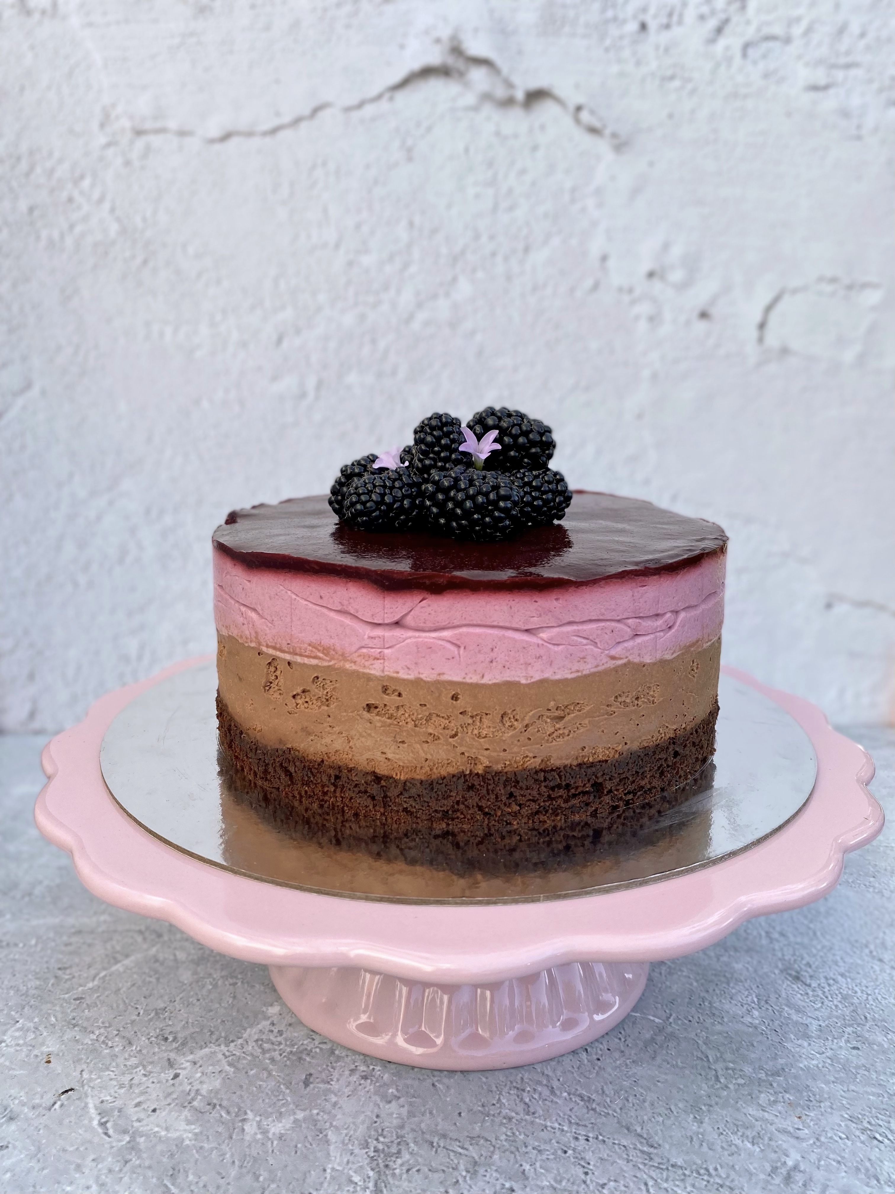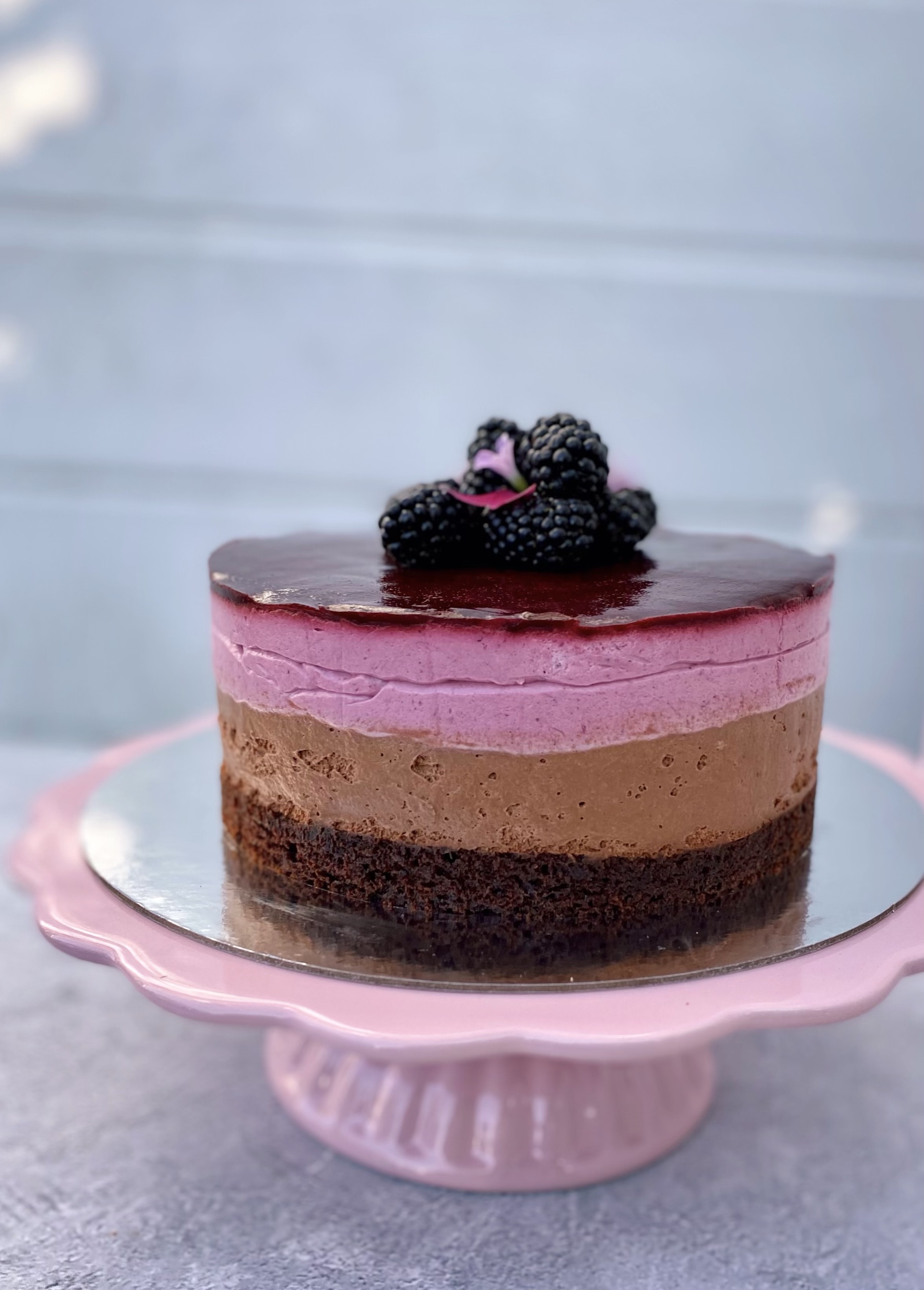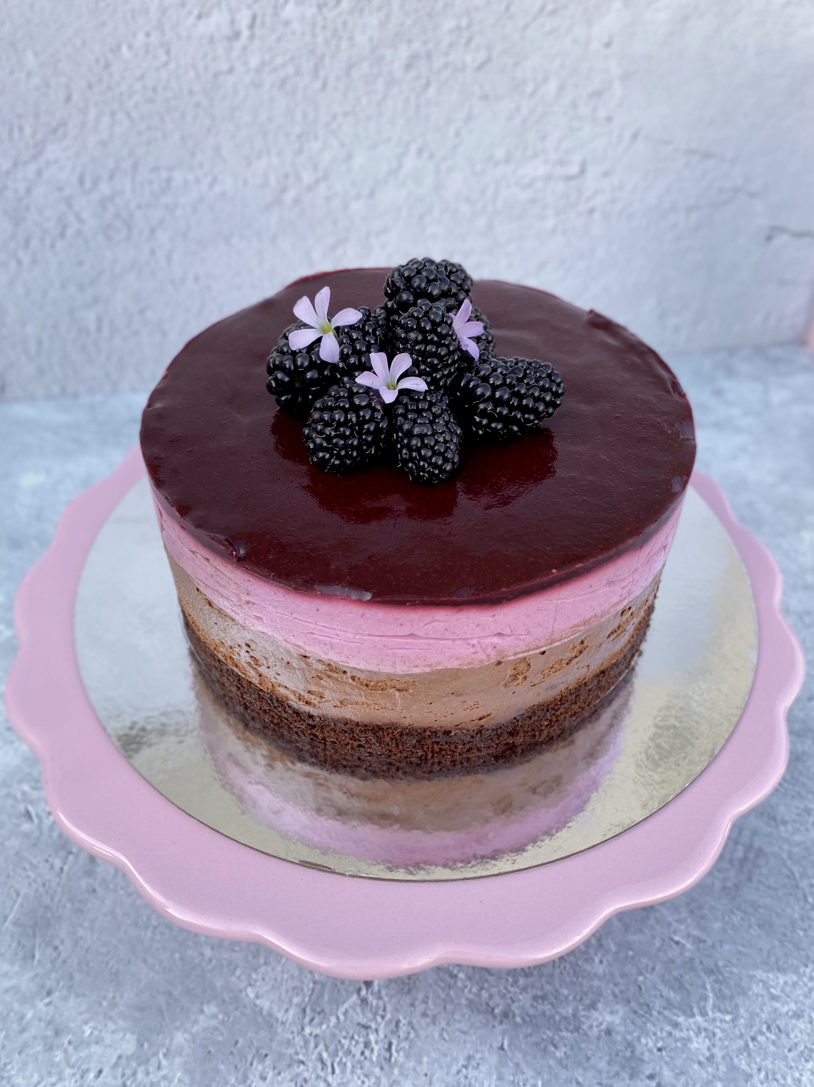 Edle Torte mit Schokobiskuit, zarter Milchschokoladen-Mousse, luftiger Brombeermousse und Brombeergelee.