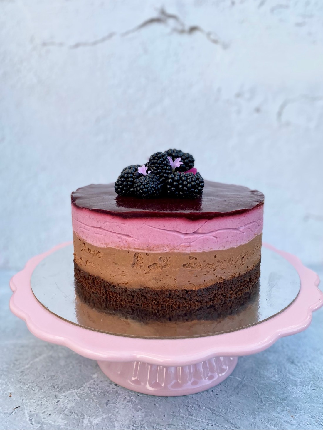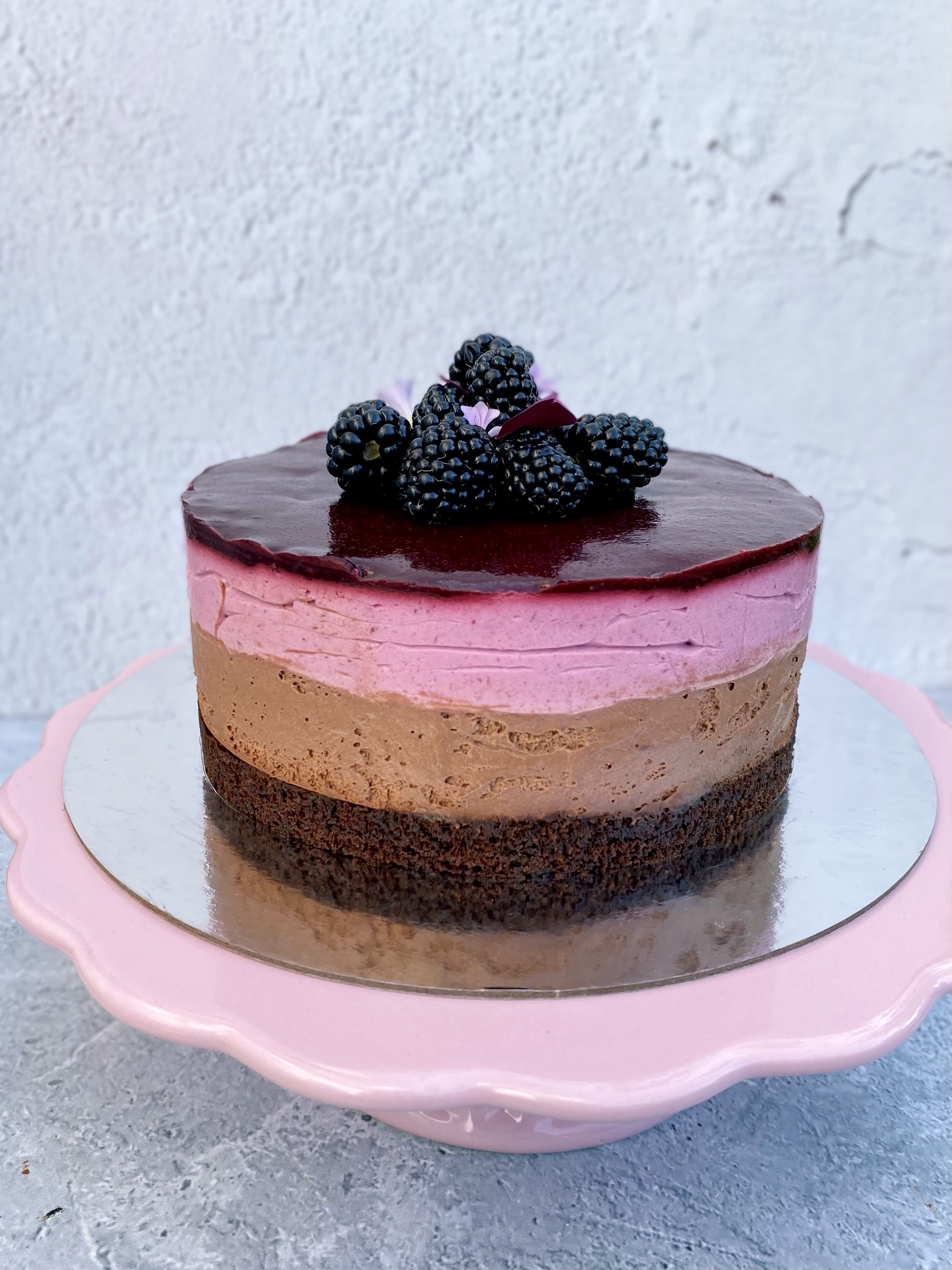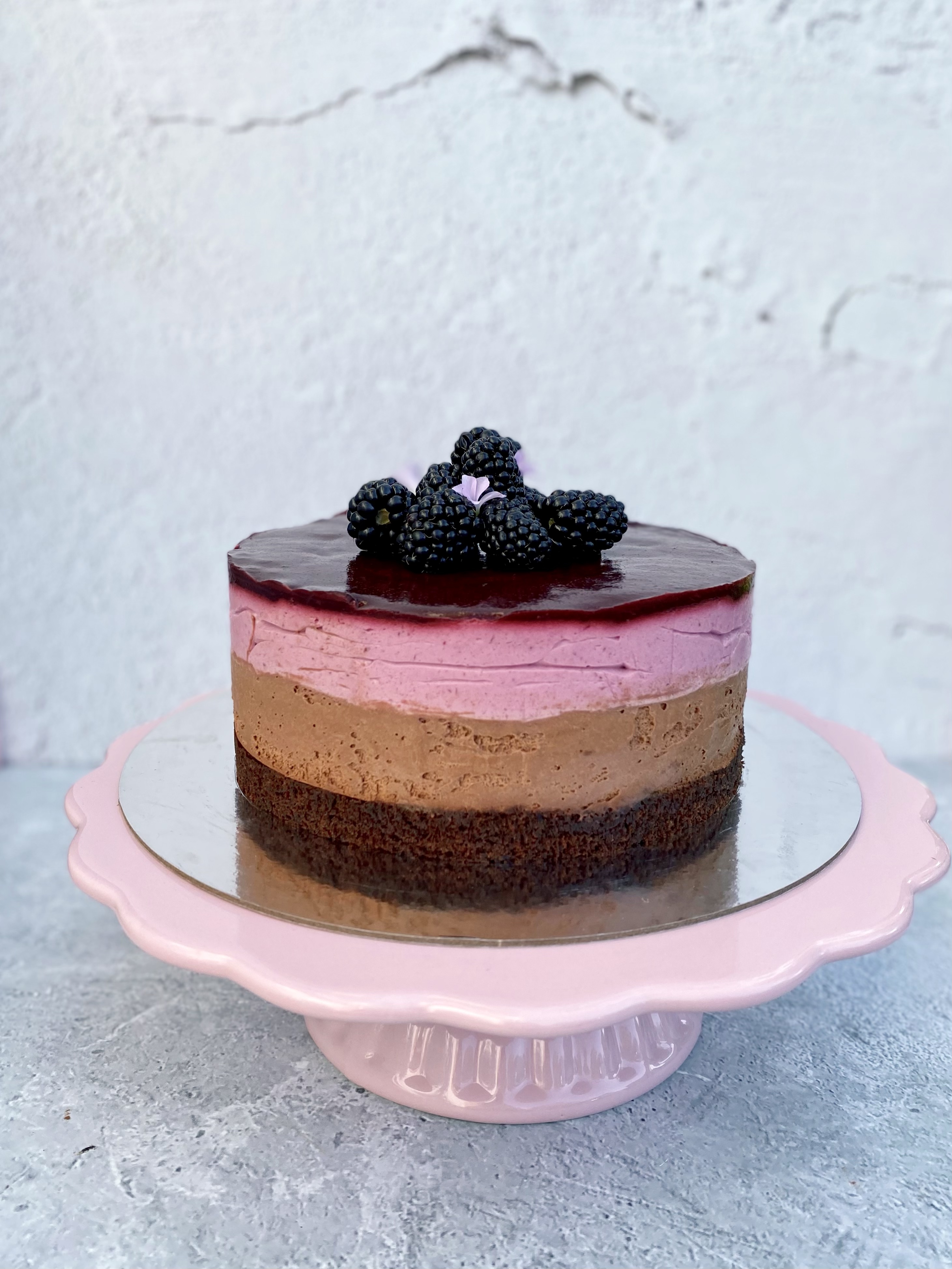 Edle Torte mit Schokobiskuit, zarter Milchschokoladen-Mousse, luftiger Brombeermousse und Brombeergelee.