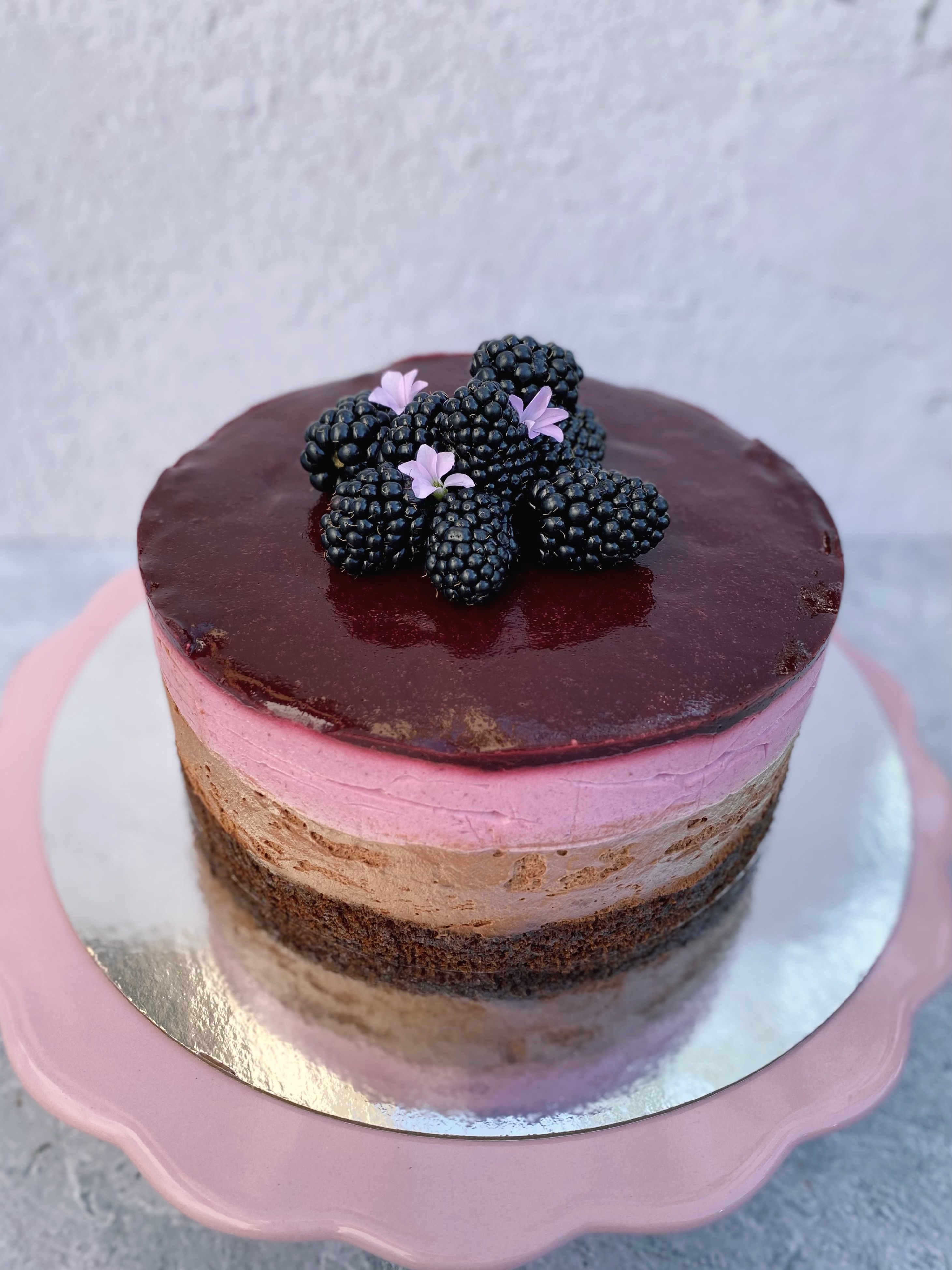 Oh, diese Farbkombination wollte ich schon lange einmal ausprobieren! Der klare Verlauf von verschiedenen Brauntönen zu hell- und dunkelbordeaux wirkt harmonisch, minimalistisch und spektakulär zugleich. Diese Torte ist perfekt für besondere Anlässe, wenn Du mit etwas Außergewöhnlichem beeindrucken möchtest und ein bisschen Zeitaufwand nicht scheust. Sie vereint vier verschiedene Schichten aus schokoladigen und fruchtigen Komponenten, die einander perfekt ergänzen. Hochwertige dunkle Schokolade, vegane Milchschokolade, frische Brombeeren und echte Vanille machen sie auch geschmacklich zu einem luxuriösen Erlebnis.