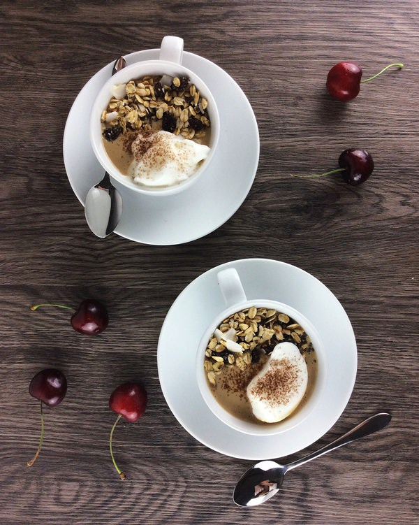 Leckere Creme aus Joghurt, Espresso und Mandelmus getoppt mit knusprig geröstetem Müsli und Milchschaum.