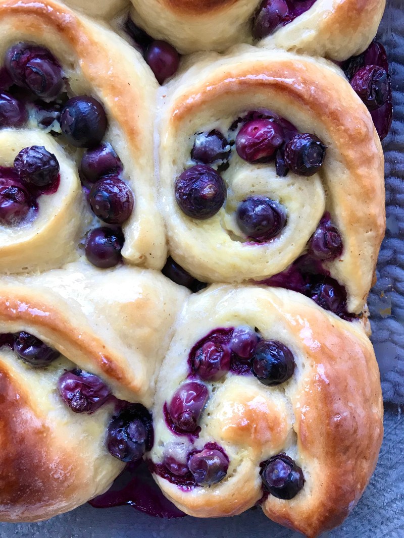 Fluffige Hefeschnecken mit Vanillequark, frischen Blaubeeren und veganem Frischkäseguss.