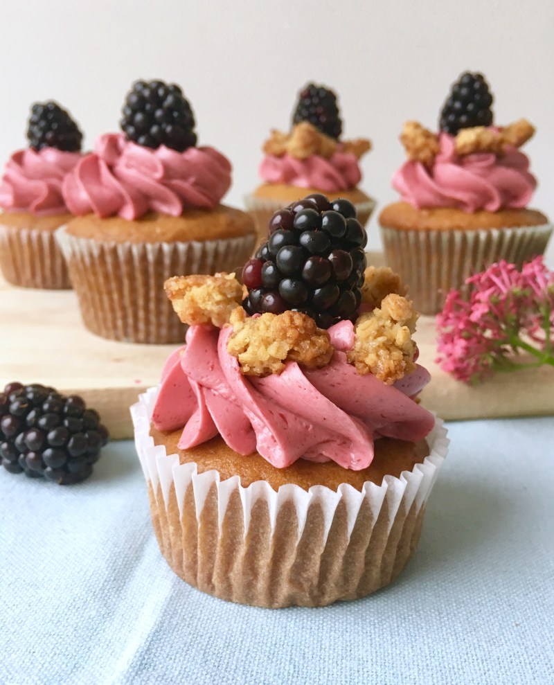 Zarter Apfelrührteig mit Apfelkompott-Füllung, fruchtiger Brombeer-Buttercreme und Streuseln.