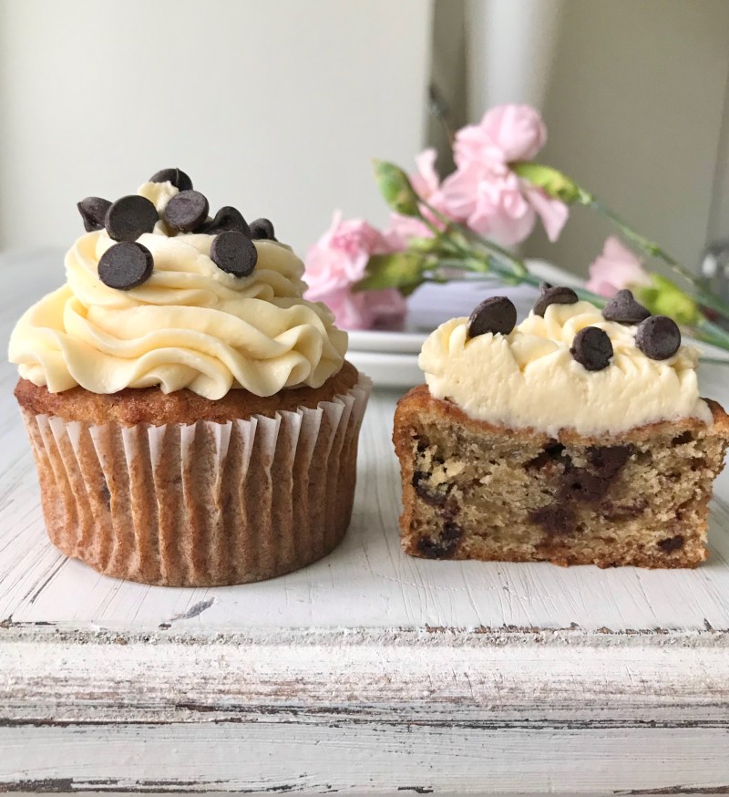 Saftige Bananen-Cupcakes mit Chocolate Chips und einem von Kuchenteig inspirierten Frosting.
