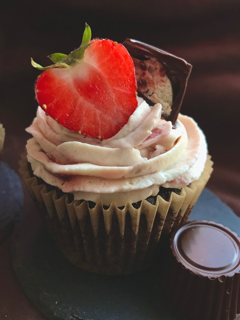 Schokoladige Cupcakes getoppt mit einer leckeren Erdbeer-Joghurt-Mousse und selbstgemachten Yogurette-Mousse-Pralinen.
