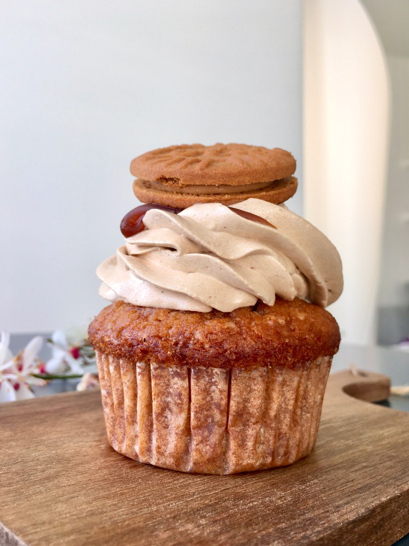 Biscoff-Creme to the max: saftiger Biscoff-Cupcake gefüllt mit einer Biscoff-Creme und getoppt mit fluffiger Swiss Meringue Biscoff-Buttercreme, mehr Biscoff-Creme und einem Biscoff-Keks.