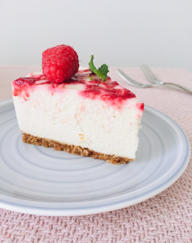 Cheesecake-Traum in weiß und rosa mit einer Weiße Schokolade-Käseschicht und fruchtigem Himbeer-Swirl.