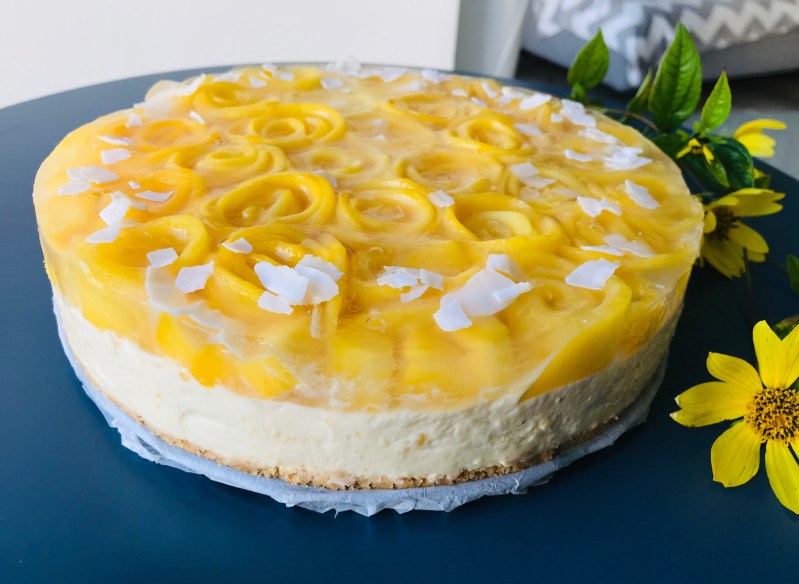 Erfrischender fruchtiger Cheesecake mit Kekskrümelboden, luftig-cremiger Quarkschicht und kleinen Rosenblüten aus Mango.