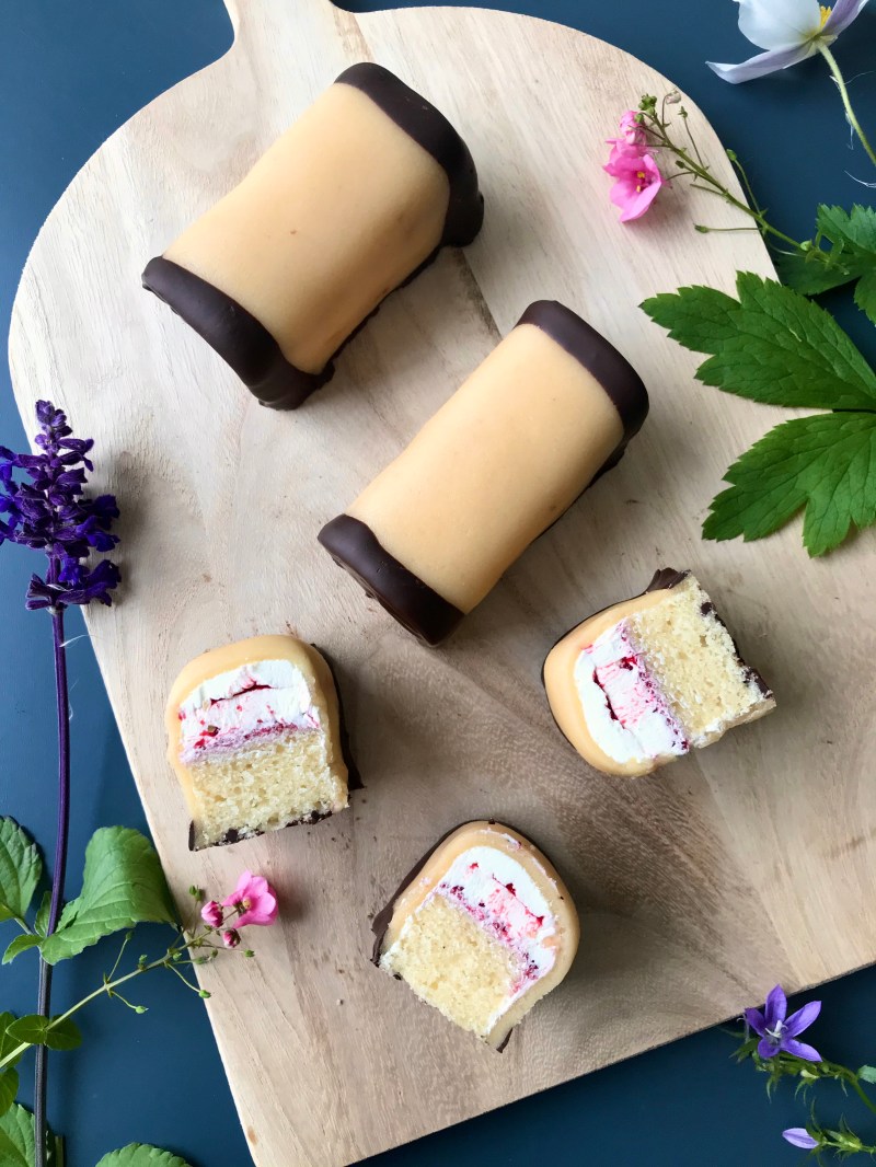 Ein niederländischer Klassiker, der auch in Deutschland unter dem Namen Wikinger Röllchen bekannt ist: zartes Biskuit, Buttercreme und Himbeersauce umhüllt von Marzipan und Schokolade.