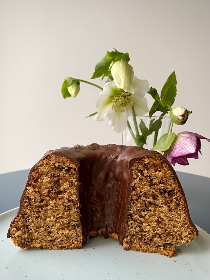 Saftiger Haselnuss-Rührteig mit Schokosplittern und einem zartschmelzenden Guss aus Nougat und dunkler Schokolade.